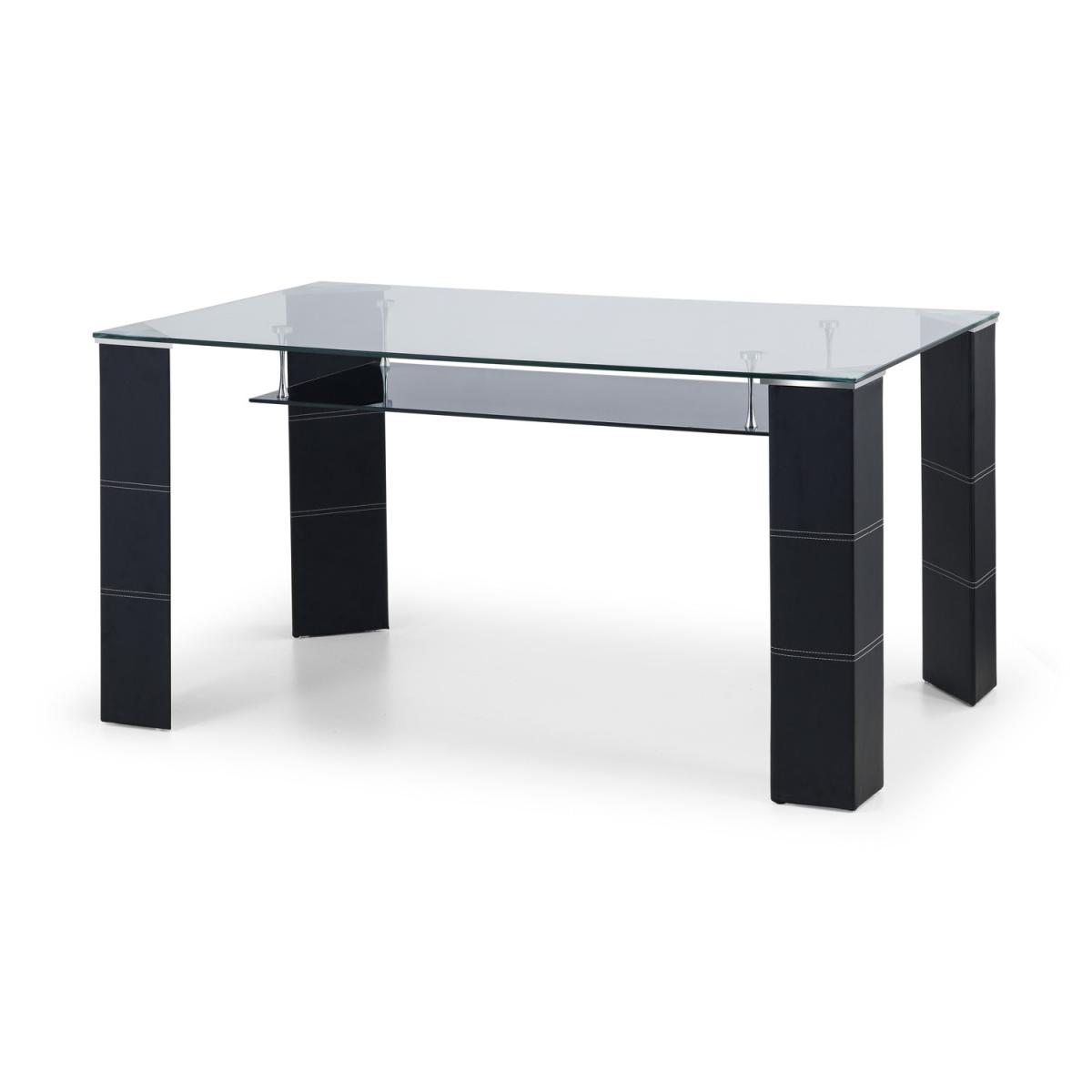 A great addition to your dining room, this sleek Greenwich Glass Dining Table features a 10mm clear tempered glass table top with black faux leather legs and chrome plated steel, ensuring lasting durability. A useful black glass under shelf is provided, allowing extra storage. Designed to comfortably seat 6 people, this creates a modern setting for your guests.