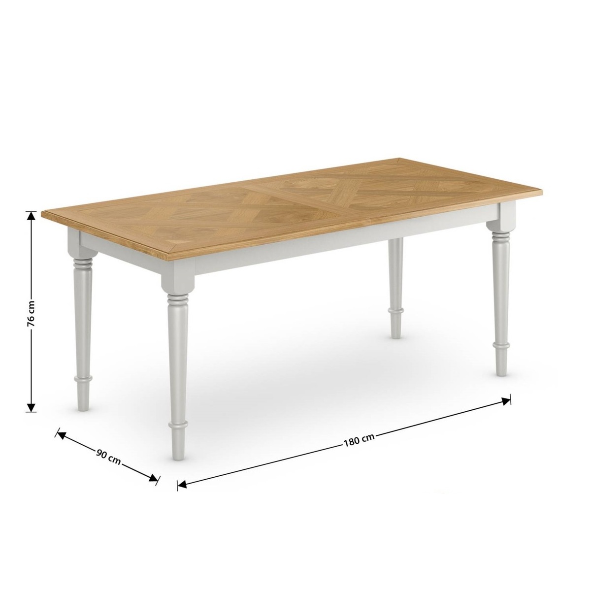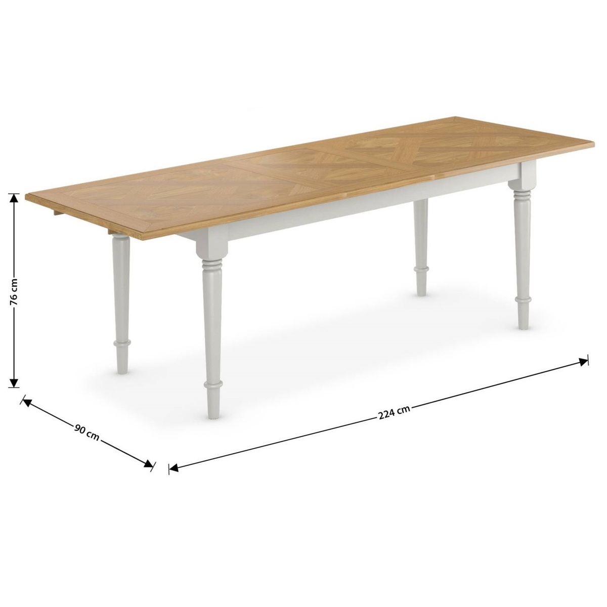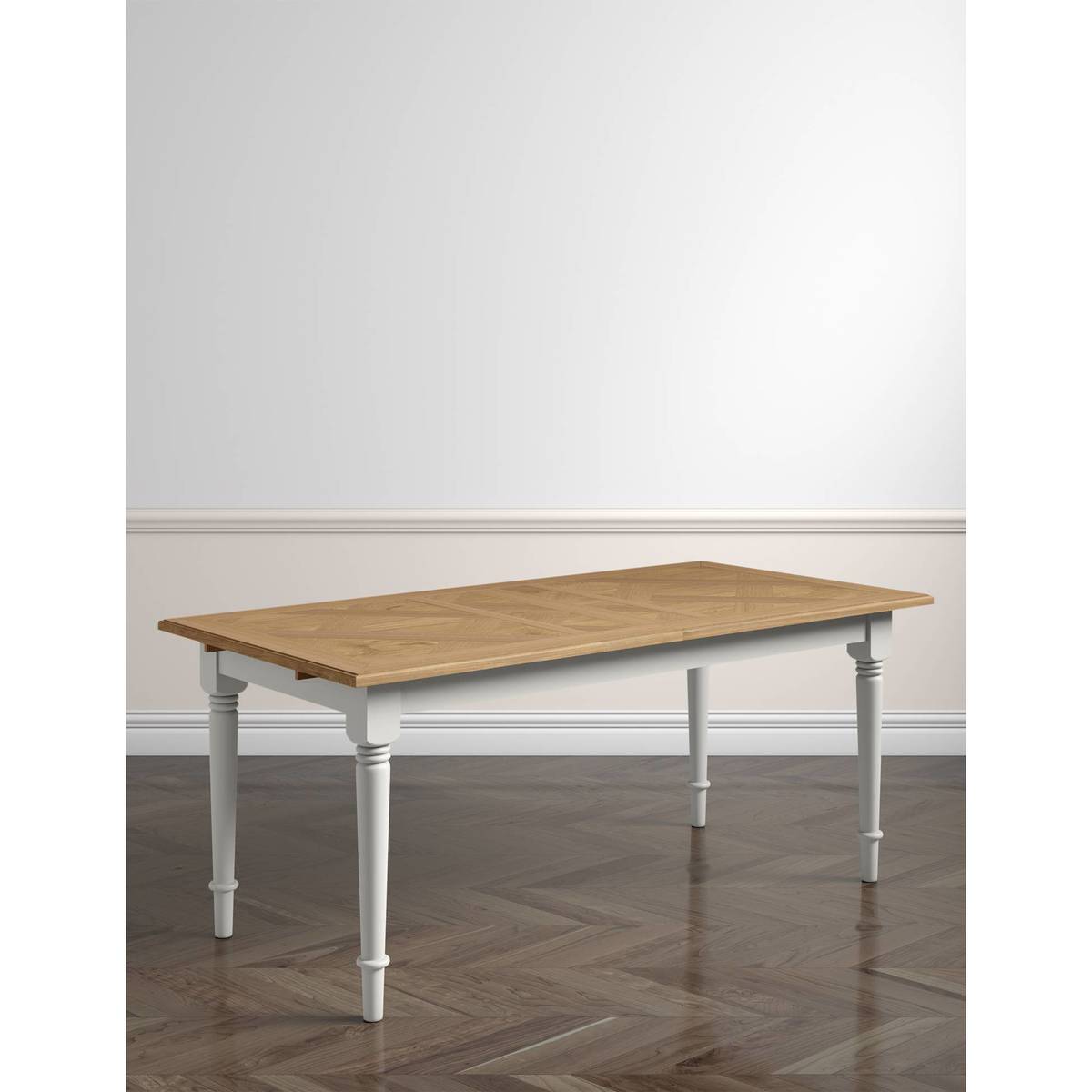 Introduce a splash of rustic charm to a dining room or kitchen with our extending dining table. Showcasing a classic design that's perfect for traditionally styled interiors, this dining table features an oak veneer marquetry top and a sophisticated painted finish to add a subtle hint of hue to a space. Perfect for family meals as well as times when you want to entertain, this stylish and practical piece neatly extends to seat more guests.
