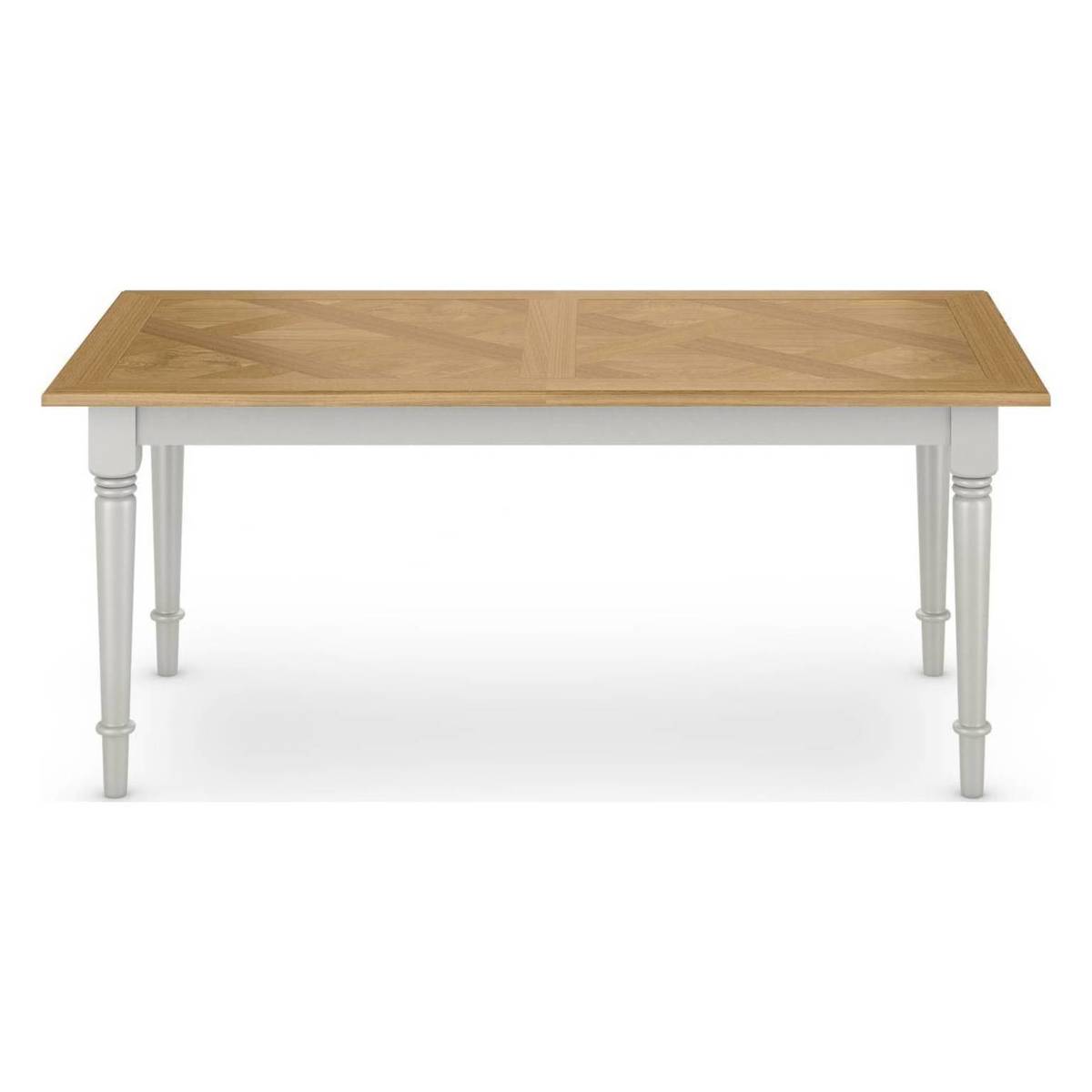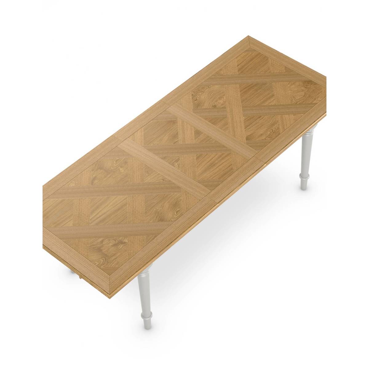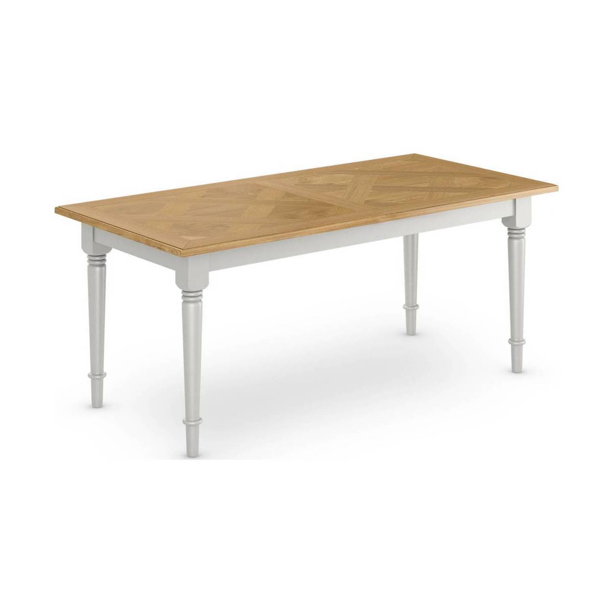 Introduce a splash of rustic charm to a dining room or kitchen with our extending dining table. Showcasing a classic design that's perfect for traditionally styled interiors, this dining table features an oak veneer marquetry top and a sophisticated painted finish to add a subtle hint of hue to a space. Perfect for family meals as well as times when you want to entertain, this stylish and practical piece neatly extends to seat more guests.