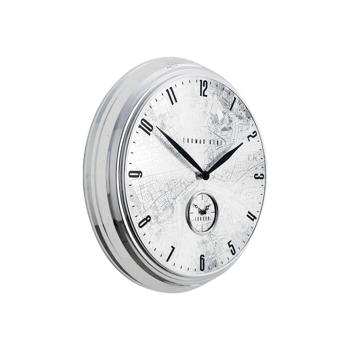 A quintessentially British timepiece, the Greenwich wall clock features a map of London set against a metallic background is a distinctive domed glass lens and high gloss black hands and numerals give this beautiful clock its heritage good looks. Why you'll love it. Large wall clock featuring a printed map of London. Circular design with convex glass lens and chrome rim. High gloss black hands and numerals. Made with care for Furniture Village. What you need to know. Quartz movement with audible ticking noise. Requires 1 x AA battery (not included). Dimensions. Height: 48cm (19 inches). Width: 48cm (19 inches). Depth: 12cm (5 inches).