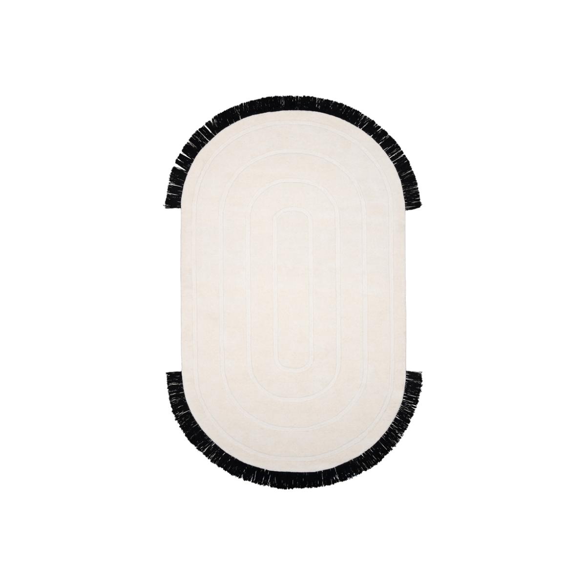 An Art Deco inspired shaped rug with embossed detailing and black tassels. Hand Tufted 100% Wool. Wool rugs shed fibres during vacuum cleaning and everyday use; this is not a fault but a natural characteristic. Please use only suction type vacuum cleaner as rotating brush vacuum may damage the rug. Spills should be cleaned immediately to help avoid staining – use a clean white absorbent cloth to dab the spillage, avoid scrubbing.