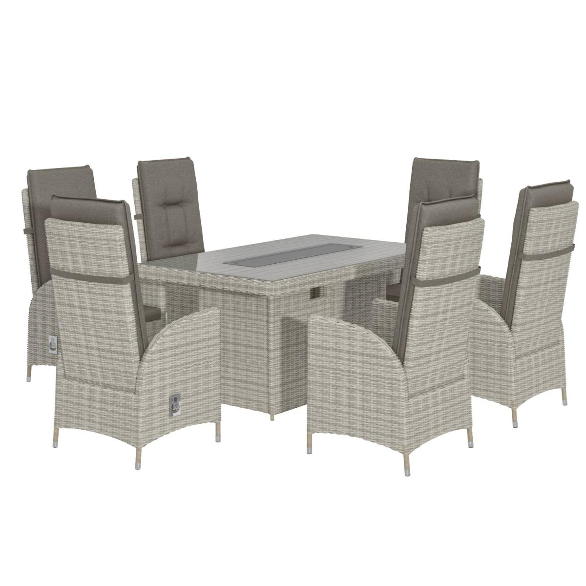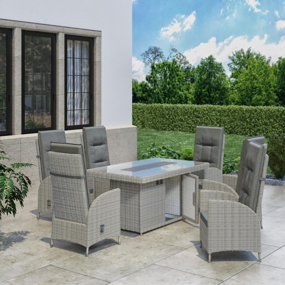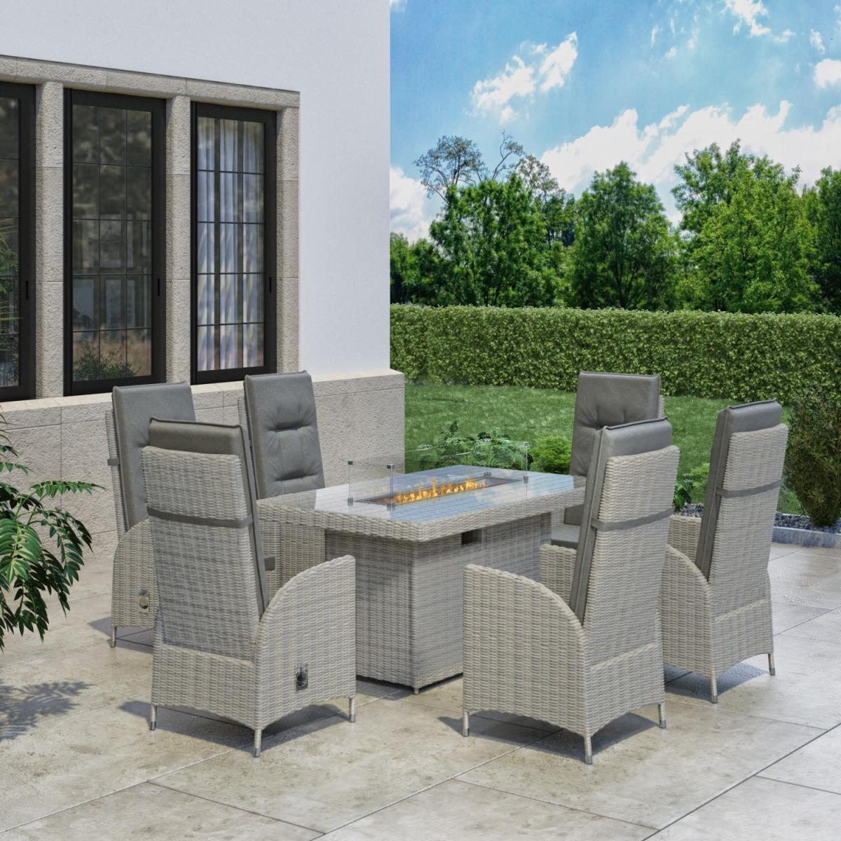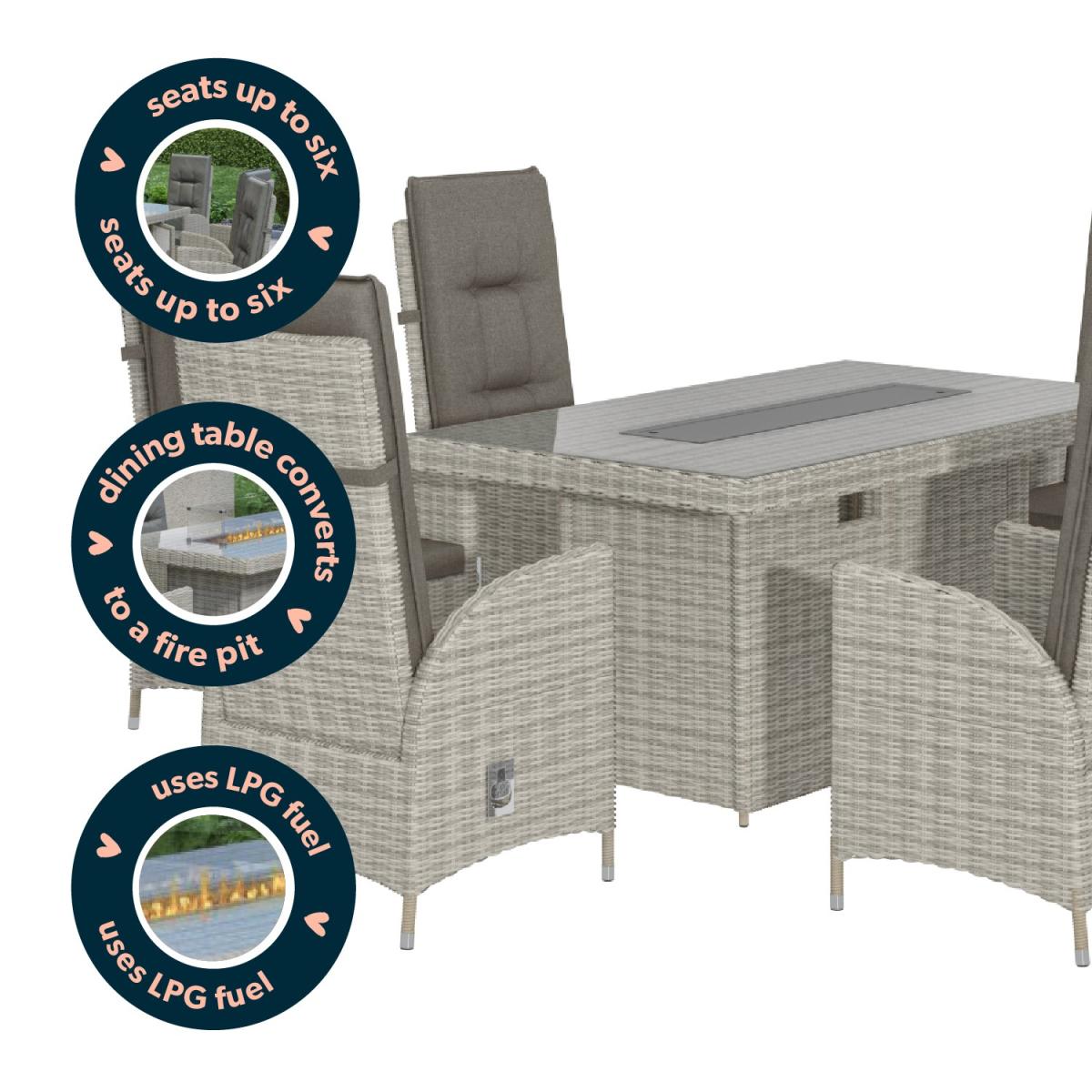 Features we love Luxurious dining set to take you from day to evening. With 6 reclining chairs and; table with tempered glass top. Dining table converts to a fire pit to keep you toasty. Storage space beneath the table is ideal for a gas bottle. Complete with plush slip-on cushions for extra comfort All about me. Enjoy garden dining and entertaining with this reclining garden set. Dine by day then covert your table to a warming fire pit and sit back and relax on the reclining chairs with tall backs. You can enjoy it into the evening whatever the temperature making the outside just as inviting as the inside. A control panel allows you to adjust the heat plus the flame is protected by the wind and for safety by a glass surround. Made from synthetic all-weather rattan it’ll withstand sun mould and unpredictable British weather. Enhance the life of your garden furniture-. This product has been designed to be used outdoors. To make the most of your furniture we recommend that you store it indoors move it in a sheltered position or protect it by covering it up in bad weather and over the winter period. Why not invest in one of our garden stores super handy if your furniture comes with any upholstery (cushions) which must always be kept dry. Need to know. Table dimensions. W150 x D90 x H75 cm Chair dimensions. W57 x D70 x H120 cm Fire pit system dimensions. W80 x D19 (double layer) Seats. Up to 6 people Fuel type. Liquefied Petroleum Gas (LPG) (sold separately) Firepit controls. Control panel Tabletop thickness. 8mm Cushion thickness. 5cm Colour. Grey mix and grey (upholstery) Finish. Rattan upholstery and powder coated (frames) Material. Tempered glass (tabletop) rattan aluminium polyester fabric and double layer fire pit system Assembly required. Yes just the table Due to the hand-woven rattan finish each piece will feature slight variations in colour and pattern. Please note Only convert the fire pit into a coffee table when not in use. What's in the box? 1 x Table6 x Chairs1 x Fire pit.