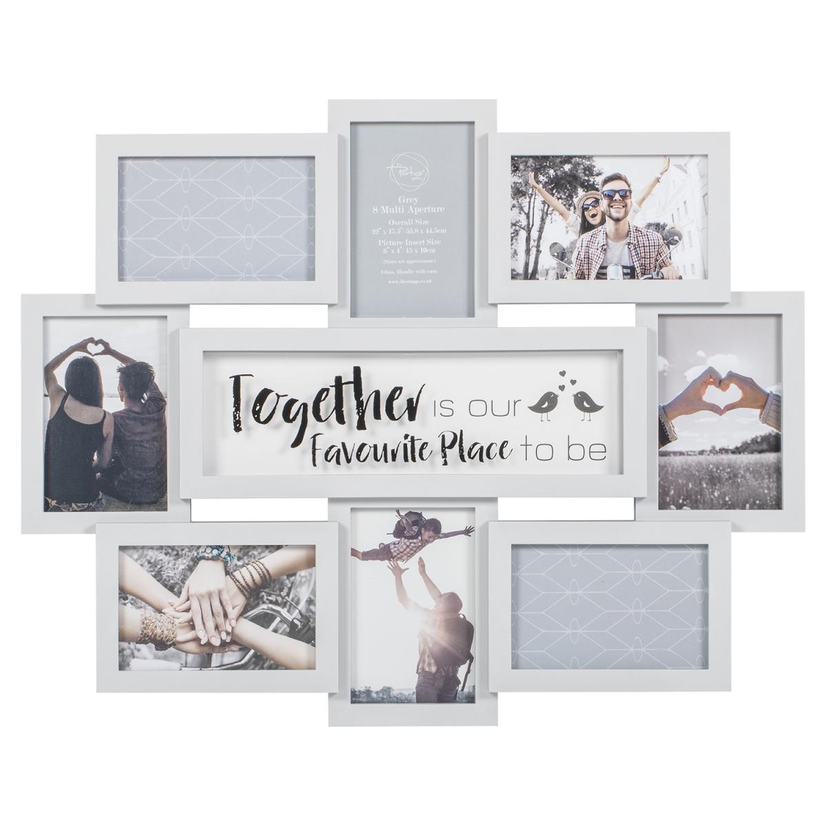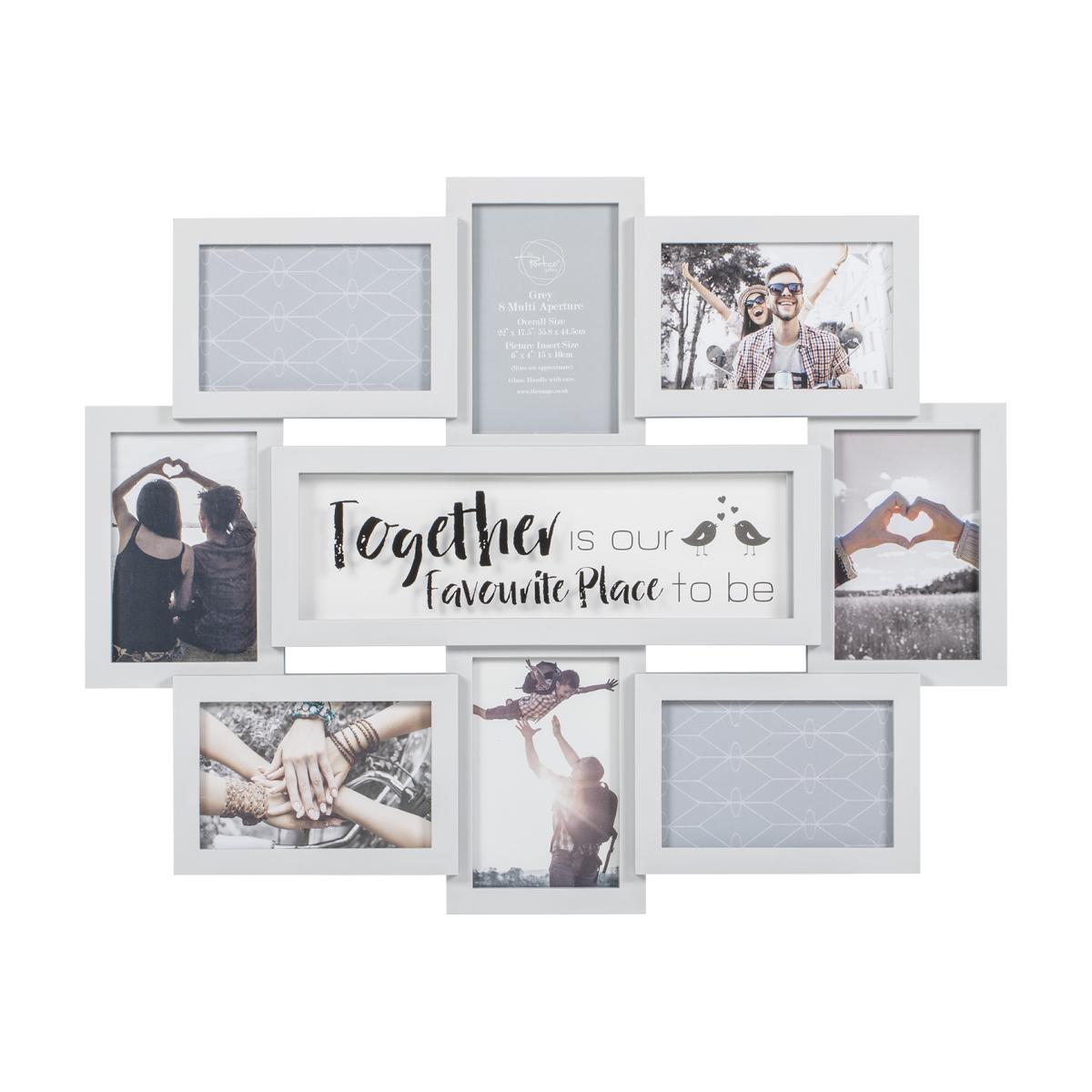 A lovely way to turn treasured moments into an attractive wall display, the Grey 8 Multi Aperture Frame can hold up to eight 6 x 4" photographs which all surround its romantic sentiment. Reading 'together is our favourite place to be' with an illustration of two lovebirds, this light grey frame is perfect for couples, friends, or families.