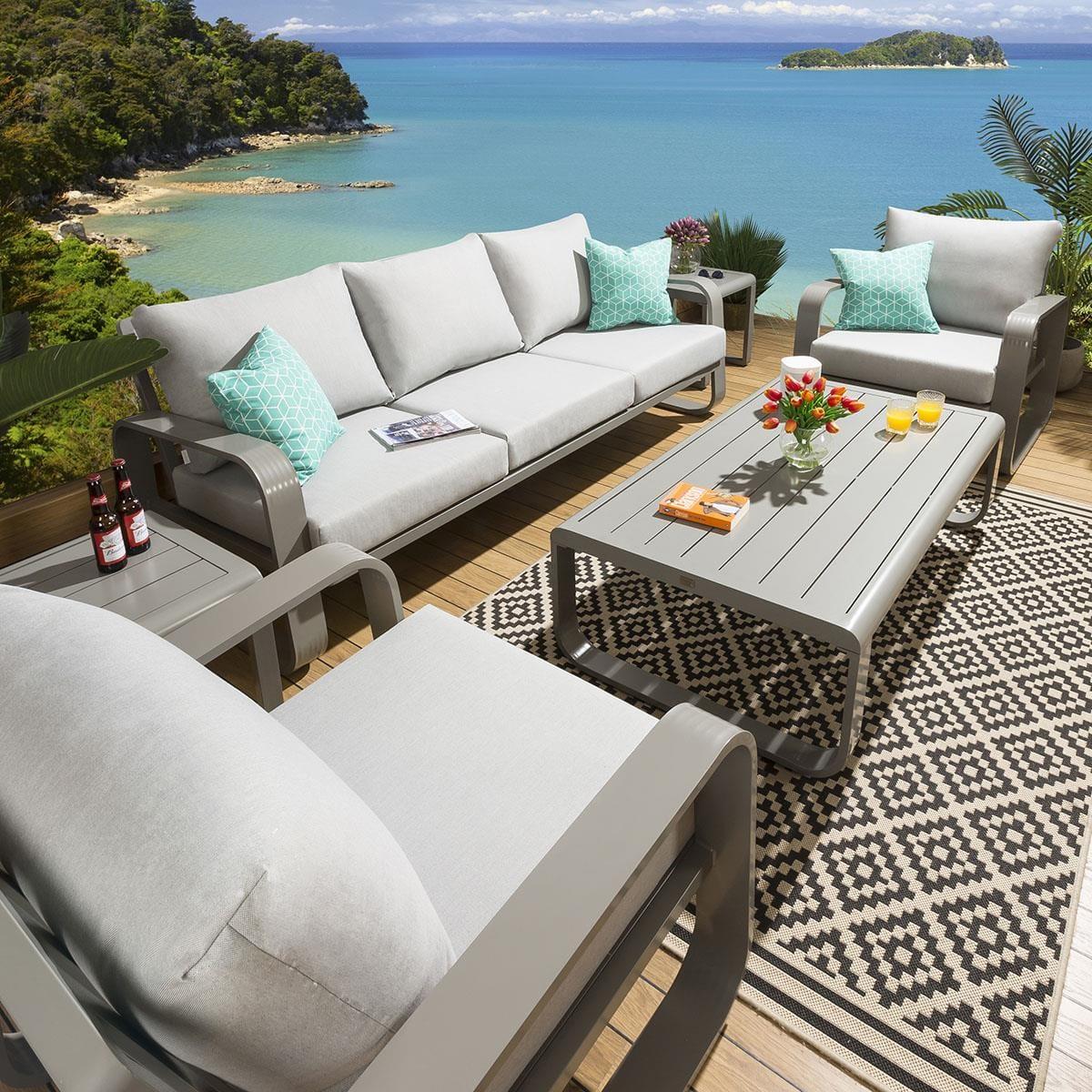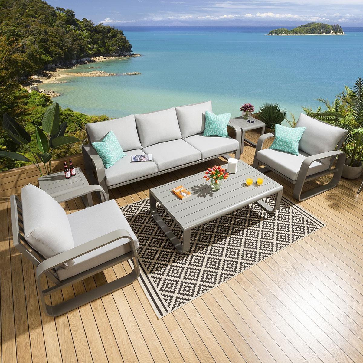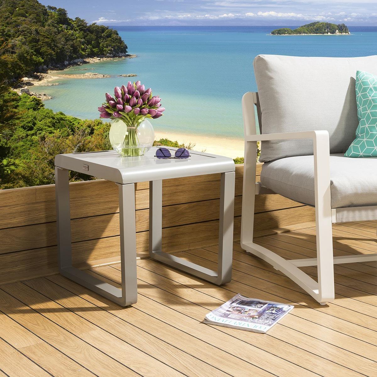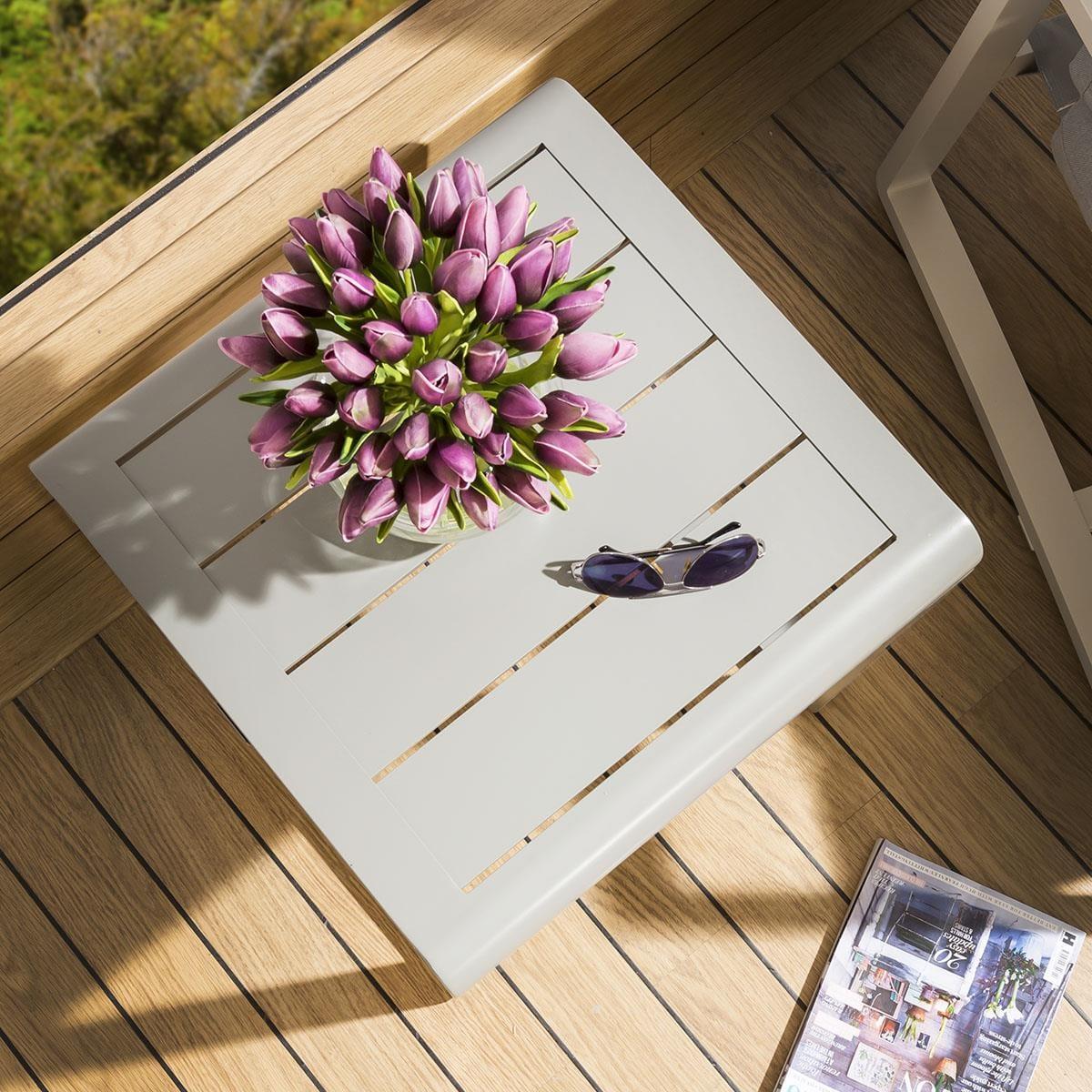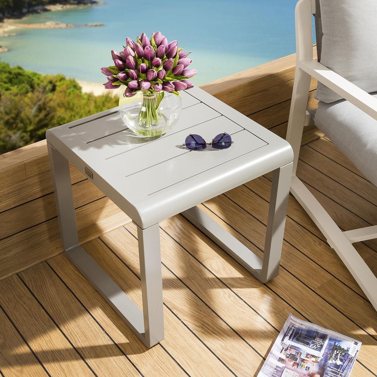 The Elles aluminium outdoor end table in grey by Quatropi is an essential part of the full Elles garden sofa set. The table is made from high-grade aluminium which makes it very lightweight and easy to change around when the occasion dictates. Ongoing maintenance of the table is easy, the frame can easily be cleaned with warm soapy water. Aluminium garden furniture requires very little maintenance, making it the perfect choice for fuss-free dining. You won't need to scrub it or treat it, just an occasional wipe down with warm soapy water and a clean cloth to keep it looking its best. Following the continued success of other Quatropi aluminium patio furniture, we have designed the Elles outdoor sofa range which combines thick formed aluminium framing with a sofa-inspired, luxuriously thick cushion seat, that together further reduce the weight but maintain an ultra-modern look. Great garden furniture can enhance and complement your garden or balcony, as well as expanding your socialising options beyond the living and dining room. Investing in your outdoor living space can pay great dividends in the spring and summer months, opening up your choices for al fresco dining, garden parties and evening cocktails. A durable garden sofa set from Quatropi will deliver great value-for-money and can last years or even decades. Make the most of your outdoor space with a carefully selected aluminium garden furniture set. Perfect for even the most strenuous weather conditions, all you have to do is keep the cushions dry. Stylish and classic, aluminium has been a steadfast choice for garden furniture and comes in many different styles, paints and stains. Welcome in the beautiful spring and summer months with a gorgeous patio sofa set, the quintessential option for elegant dining with a summer evening meal or a cocktail. This table offers a relaxing and comfortable option for your back garden or outdoor space. Spread the cost our with interest-free finance options. Minimum spend applies. W51cm D51cm H50cm Modern Garden Furniture Premium Quality Furniture