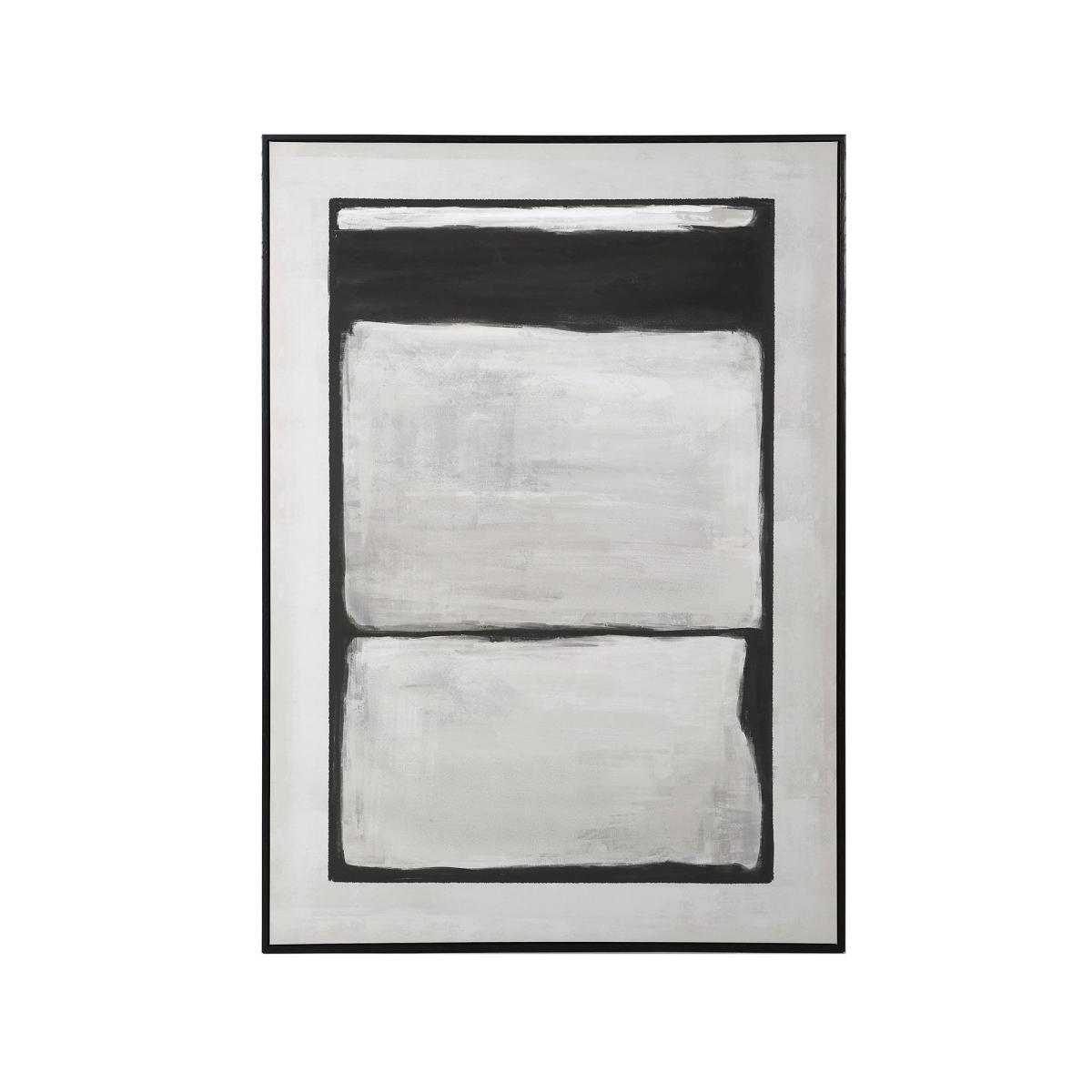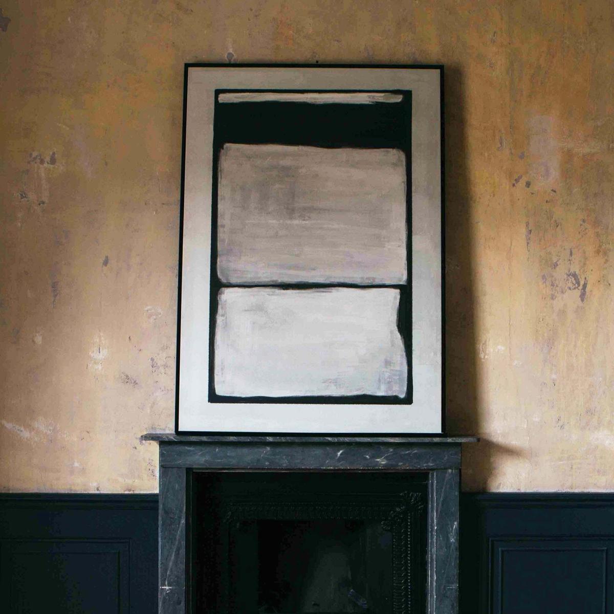 I love this one for its versatility; the monochrome palette makes it really adaptable across various interior styles, from modern minimal to industrial spaces. It works particularly well as a statement piece above a fireplace or in a living room where you want to add a touch of abstract sophistication without overwhelming the space. To style it effectively, consider pairing it with furniture in darker woods or matte black finishes to echo the print’s bold lines, or keep surrounding decor simple and understated to really let the artwork stand out. It’s also a great option for creating visual interest in rooms with neutral or muted colour schemes, adding depth and texture through its contrasting black and grey tones.