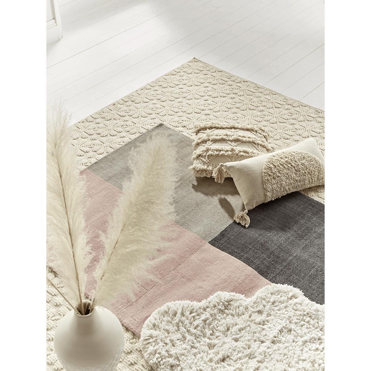 I love this rug because it effortlessly combines neutral tones with a modern geometric pattern, making it versatile for a range of interiors. The grey and blush palette works particularly well in contemporary and Scandinavian-style spaces, adding a subtle touch of colour without overpowering the room. It’s a great choice for living rooms or bedrooms where you want to introduce visual interest while keeping the vibe calm and understated. For styling, consider pairing it with neutral or pastel furniture, and add cosy textiles like throws and cushions to enhance the layered look. Its moderate size makes it ideal for defining a seating area without overwhelming the space.