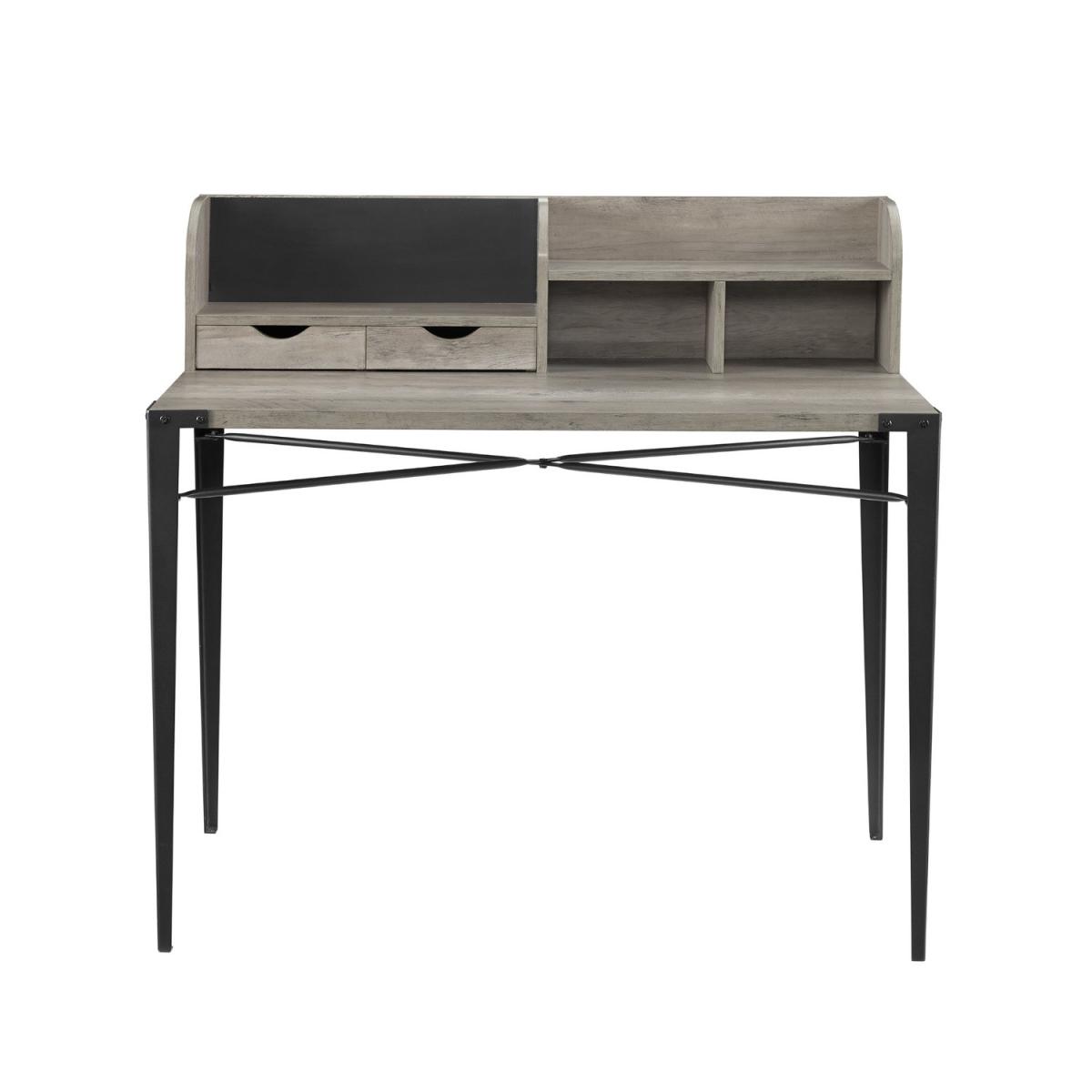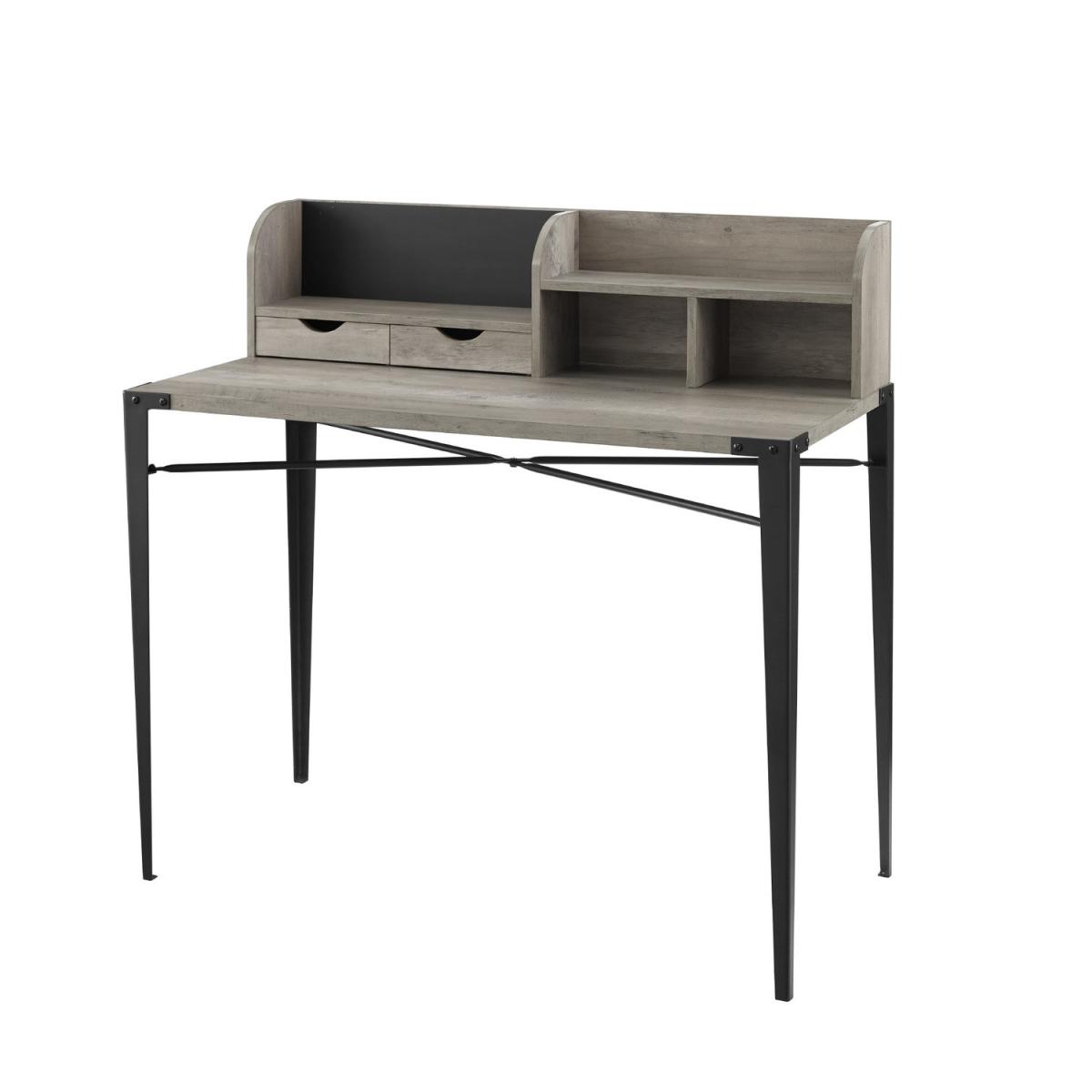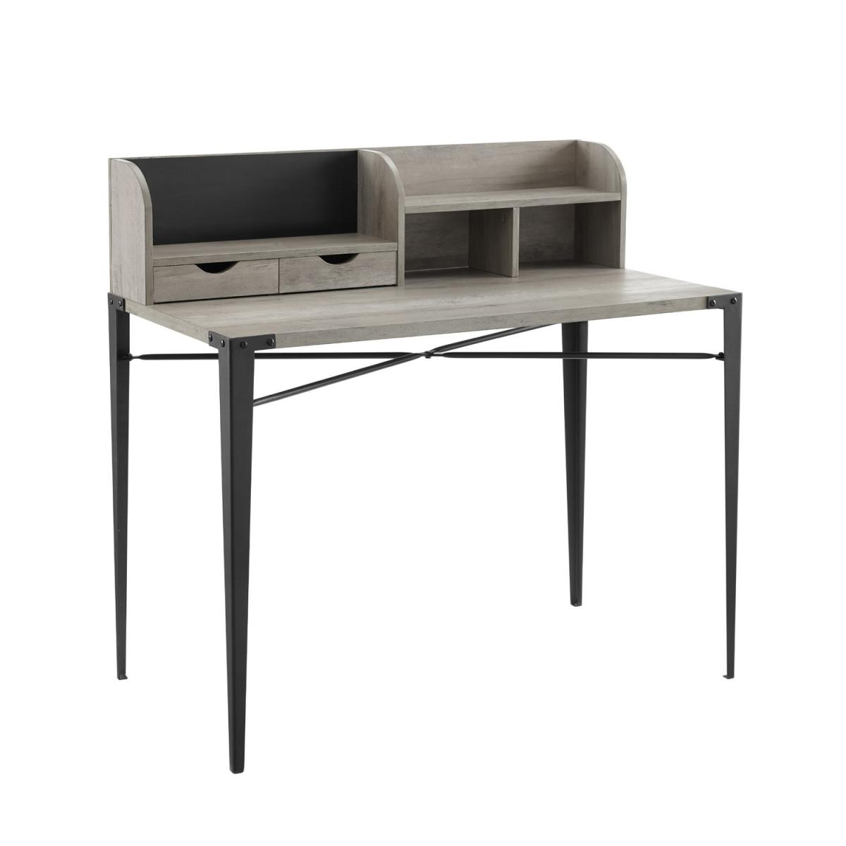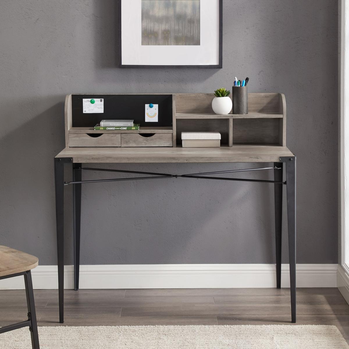 Dimensions H107 x W47 x D50 cm. Get on the cutting edge of organization with this industrial style secretary desk. With dynamic angled metal legs that hug the corners of the tabletop your retro inspired workstation will take a step into the modern age with character and style. Luckily the charm of this eclectic desk doesn't end there. This mixed material writing desk features a hutch that has a plethora of storage options with multiple cubbies drawers shelves and magnetic board. Some assembly required. Features. Black magnetic board Hutch style storage. Two small storage drawers. Two cubbies and one shelf Angle iron legs. Easy assembly..