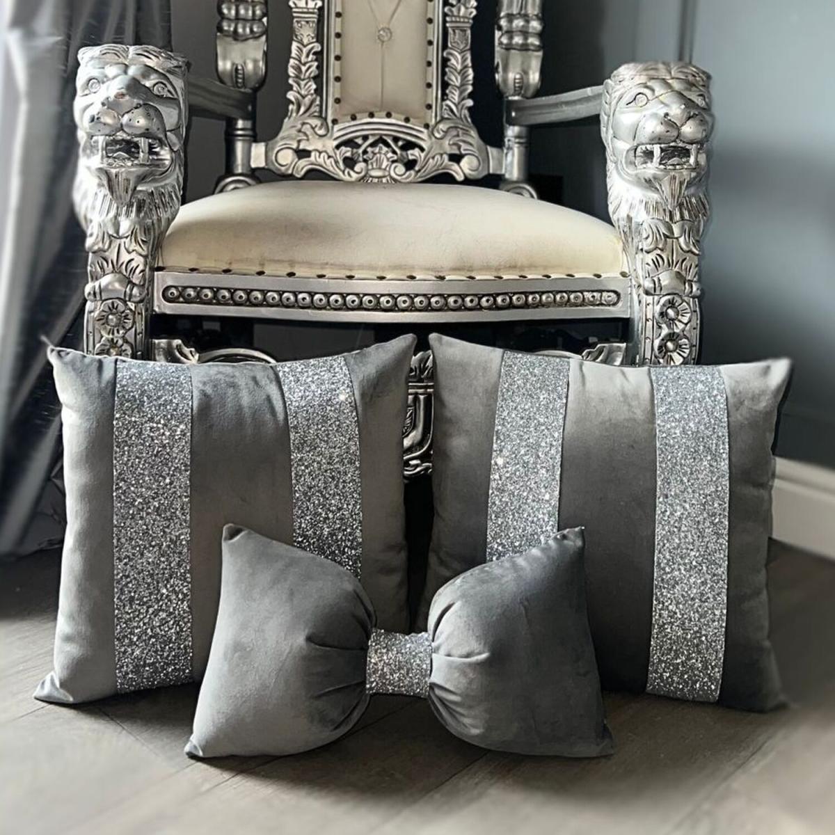 In this listing you will find our best selling set of 3 cushions featuring two cushions sat at 17x17 inches featuring two sparkly glitter panels and a medium bow cushion which sits at approx 20x10 inches and sparkles from every angle. These are a beautiful addition to your home and best sellers for a reason. They can be styled in your living room, in your bedroom, etc.
