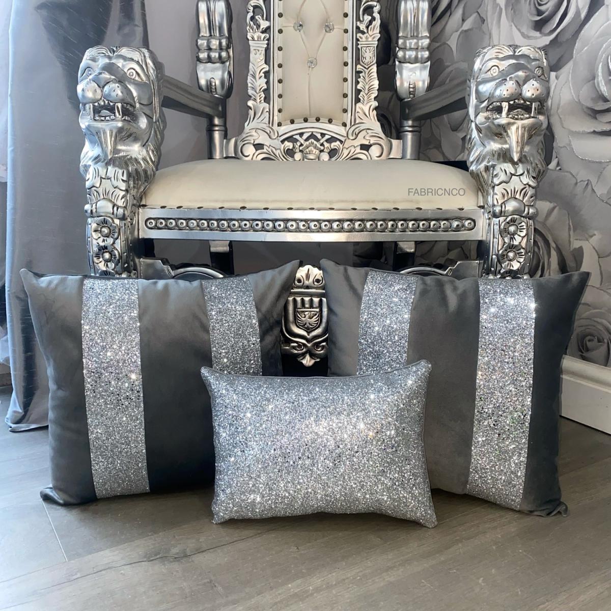 Plush velvet set of cushion covers finished in grey with two silver sparkle strips.