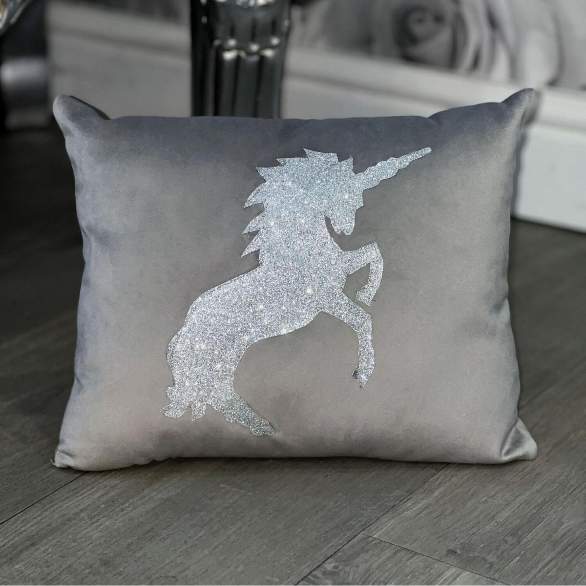 A gorgeous grey plush velvet cushion featuring a silver sparkly unicorn. Perfect addition to a little girl's bedroom that sparkles from every angle.