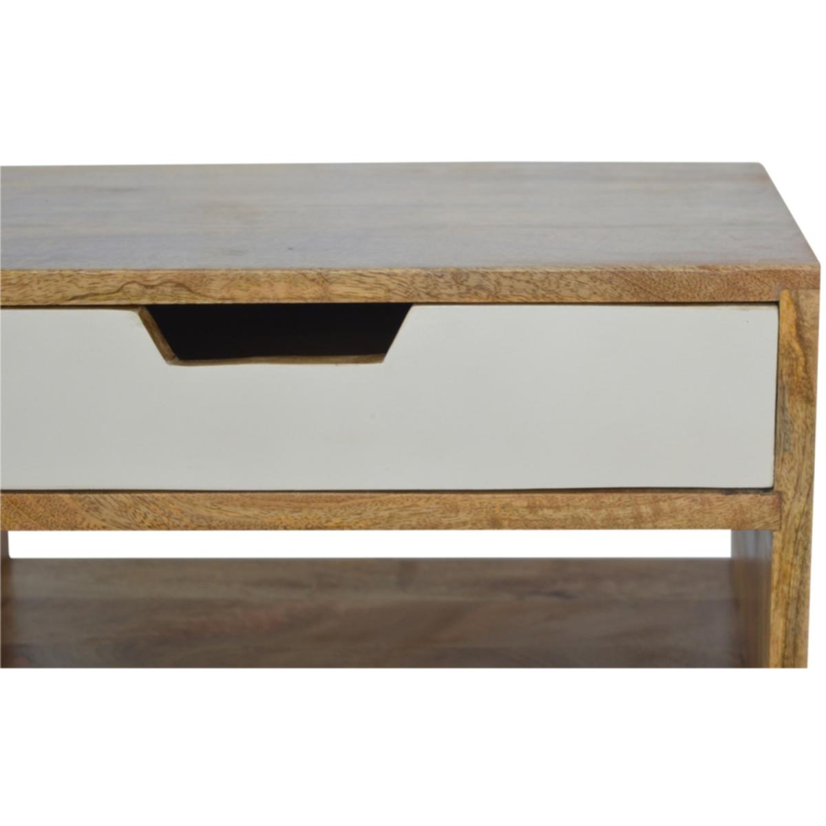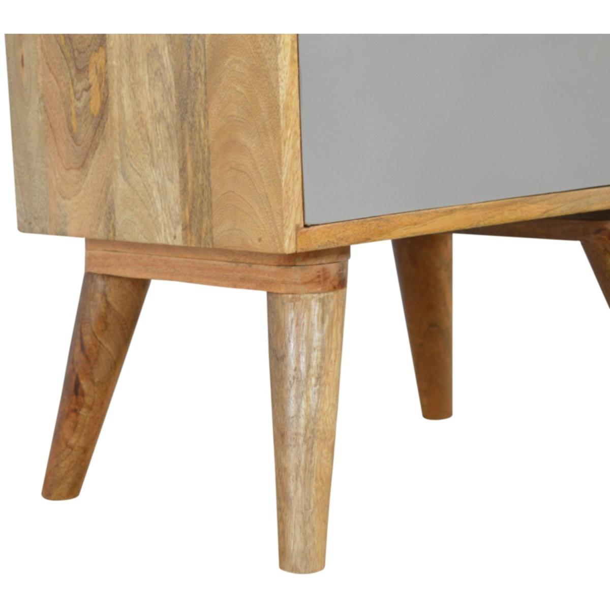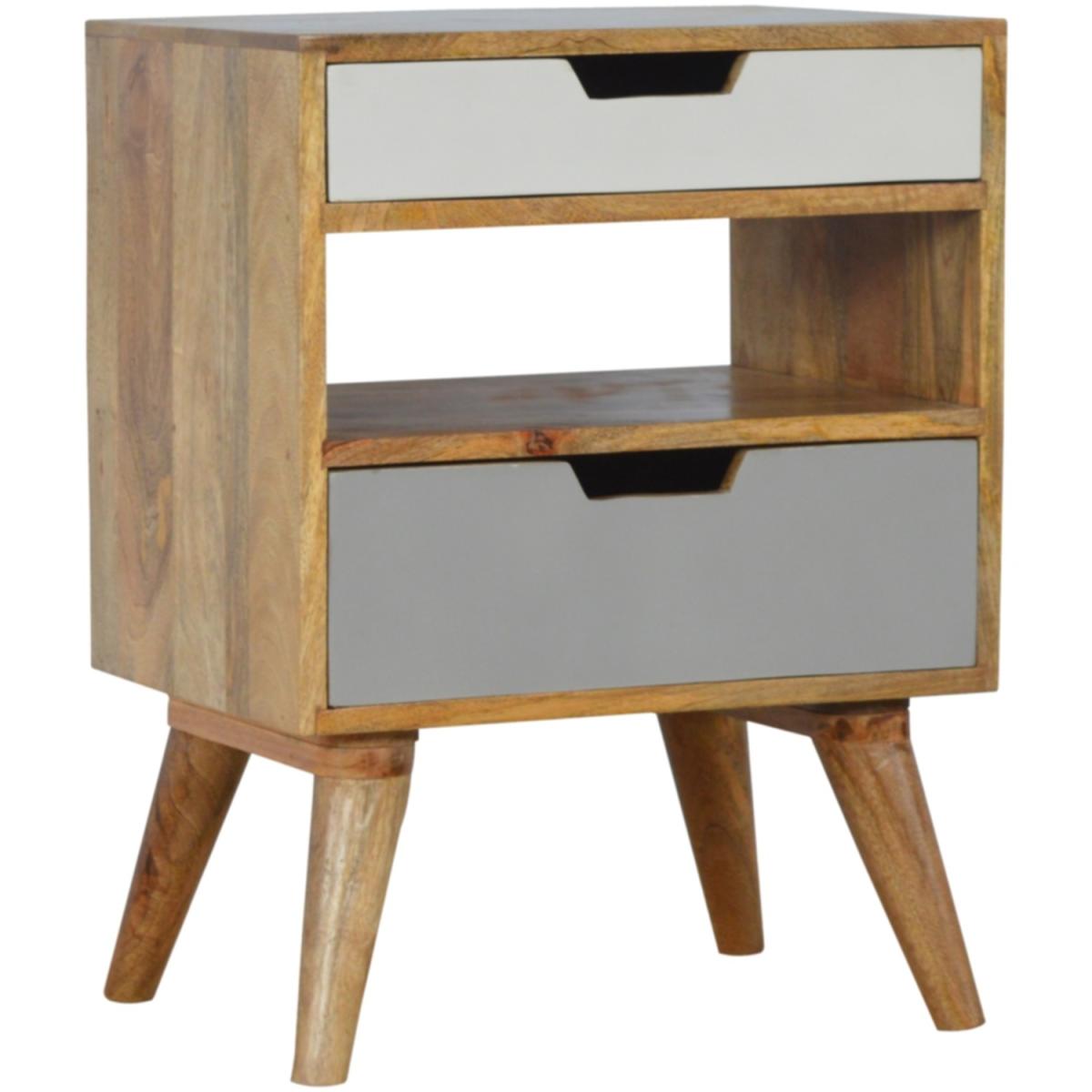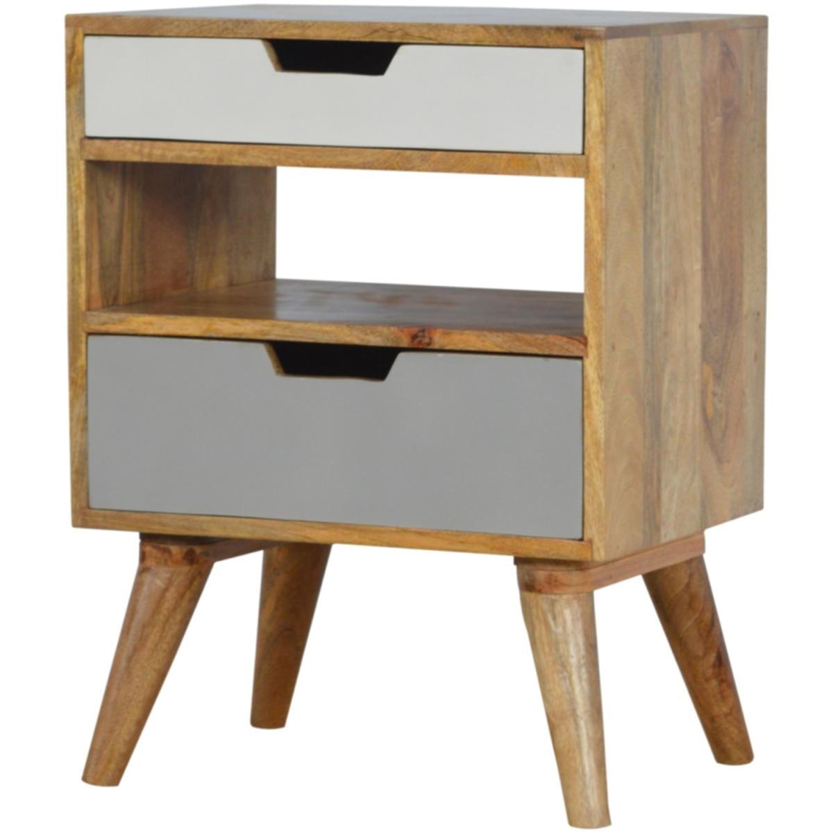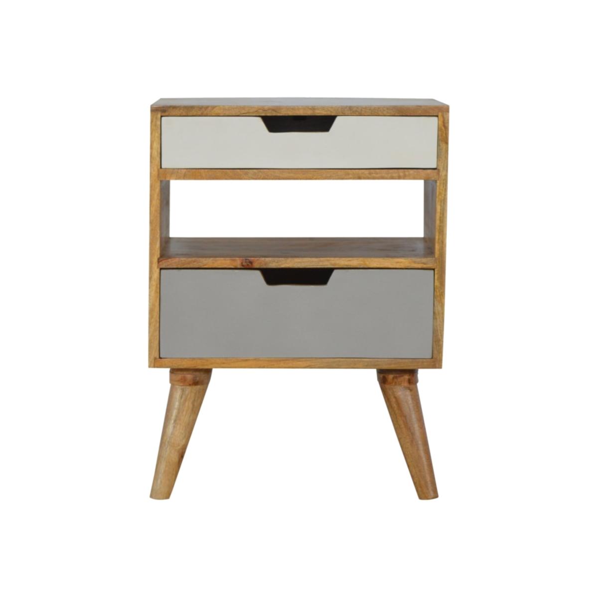 This gradient bedside has been constructed from 100% solid mango wood in an oak-ish finish and would be a perfect companion beside any bed, it stands on 4 Nordic style legs and features 2 hand painted grey and white handy drawers and 1 shelf in the middle. It can be partnered up with the other products from the range or stand alone. A perfect addition to any home.