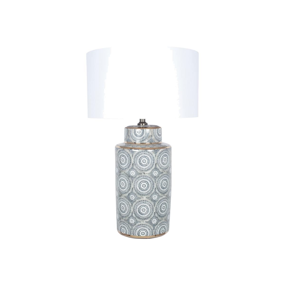 Dimensions H66.5m x W40cm x D40cm Ceramic lamp with bold geometric grey and white circle pattern finished with a gold detailing. Features. Eye catching geometric design. Contrasting white shade. Perfect statement light. A great addition to any living space Assembly not required..