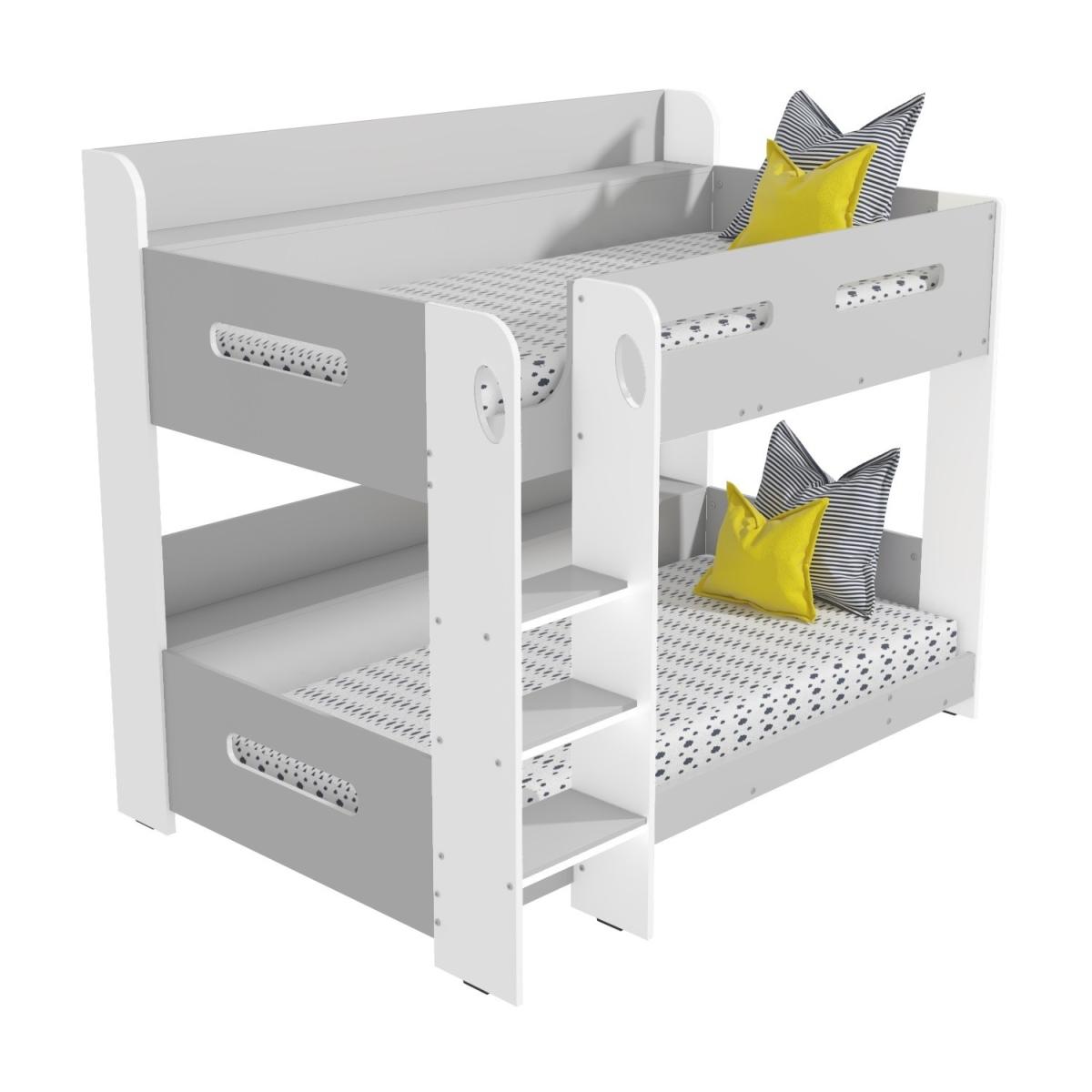 Features we love. Compact design saves floor space. Chunky ladder means that this bed is easier to climb. The bed has built in shelving. There's a glow in the dark strip on each ladder step. The ladder can be positioned on either side of the bed. Use our deal to save 10% on selected mattresses All about me. In grey and white fresh and bright the Sky bunk bed easily coordinates with any bedroom décor. With a compact design that features built in shelving it saves on floor space giving your little ones plenty of room to play. The built in shelving comes in ideal for keeping necessities close by eliminating the need to lean out of bed to reach a bedside table. It's been designed with your little ones in mind. The ladder has a chunky design with integrated handles at the top for a much easier climb. You can also decide during assembly which side of the bed you want to fit the ladder to suit your room layout. This neat bunk bed has a strong wooden build that will last the test of playtime and a hardwearing laminate finish that's super easy to wipe clean ideal for sticky little fingers. Both beds have slatted wooden bases for comfortable and durable mattress support and they fit standard UK single mattresses. Mattresses aren't included so don't forget to check out our recommendations and bundles. Need to know Mattress height should not exceed 18cm Dimensions. W198cm x D115cm-136cm x H160.8cm Size. Standard UK single (3ft/90x190cm) Height between bunks. 81 cm Height from bed slats to top of safety rail. 39 cm Material. Wood Finish. Laminated finish. Assembly required More info Compact space saving design ideal for all room sizes. Ladder can be fitted to the left or right side to suit your space. Built-in shelving no need to lean out of bed to reach a bedside table. Chunky ladder design with integrated handles makes climbing easier. Durable wooden build with a hardwearing grey and white finish. Clean design easily coordinates with any décor style. Both beds have slatted bed bases. Both beds fit standard UK single mattresses (3ft/90x190cm)Mattresses are not included and need to be purchased separately. Self-assembly is required.