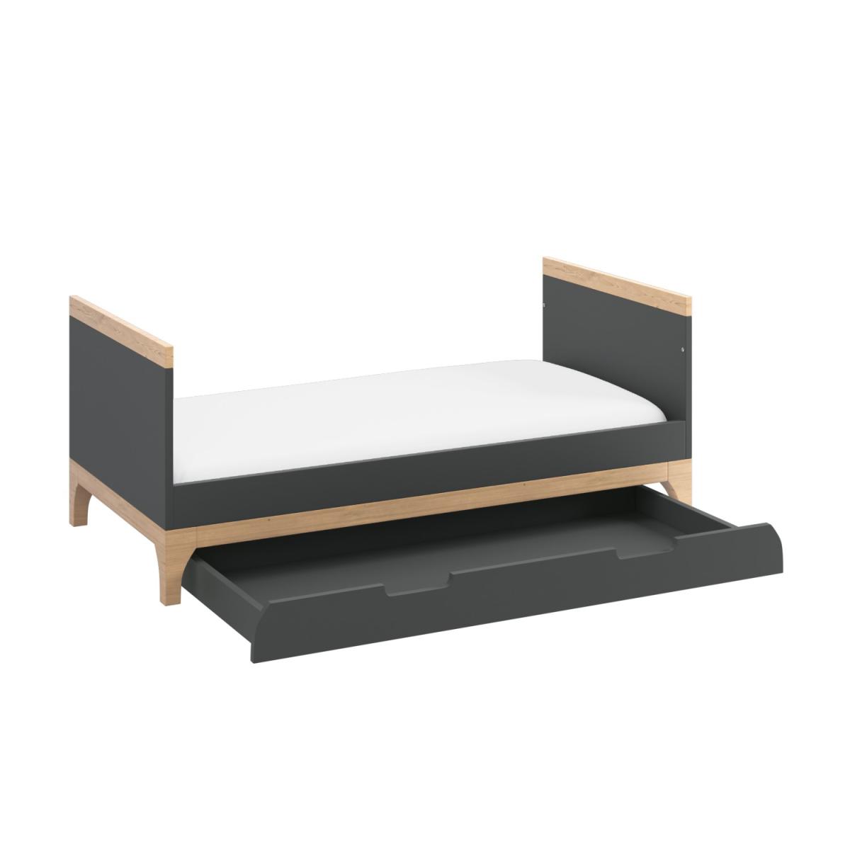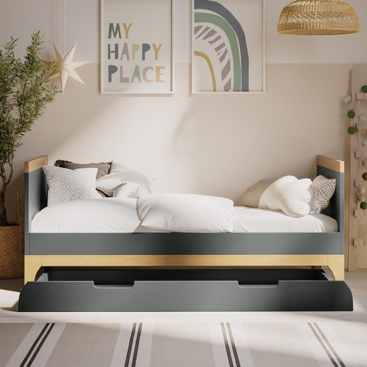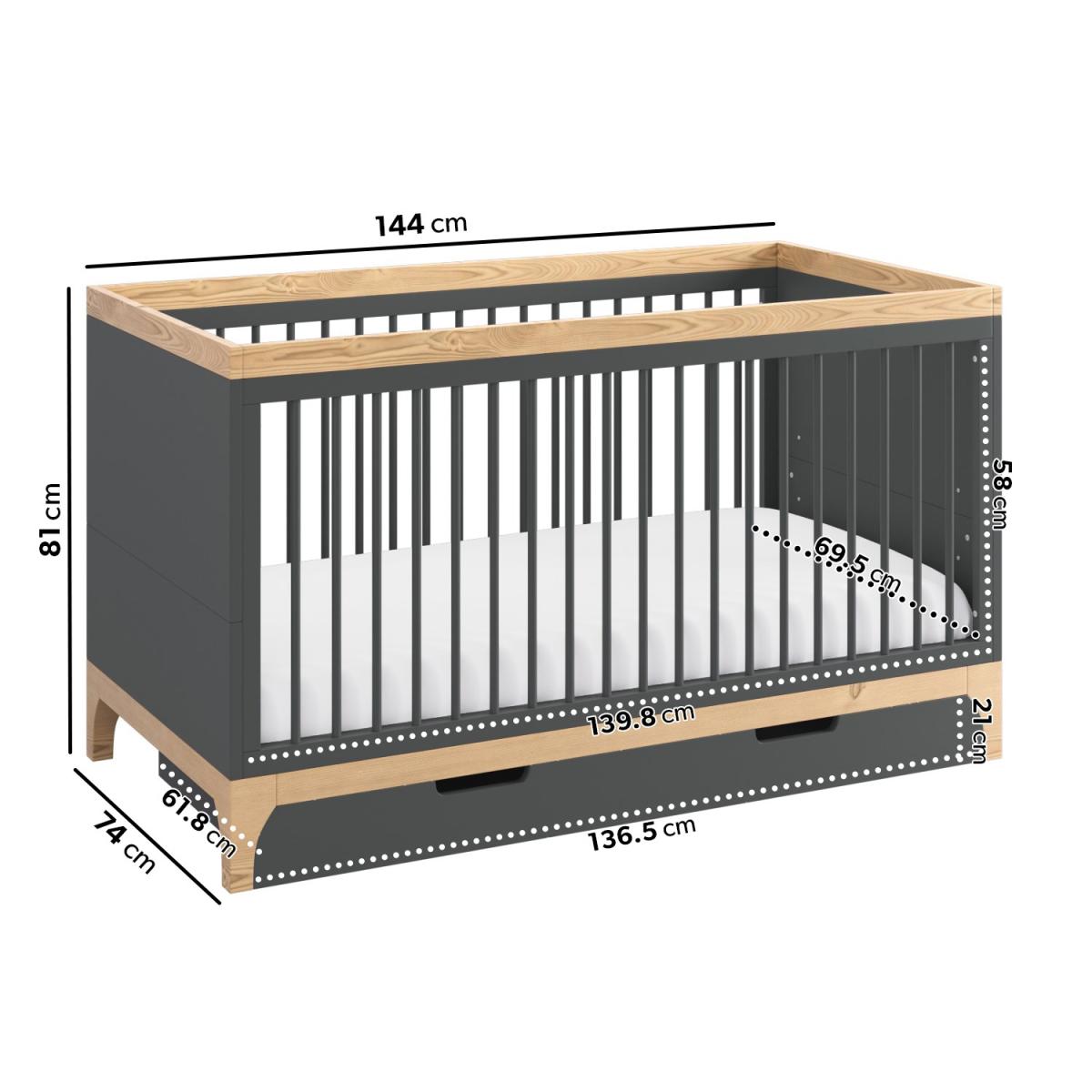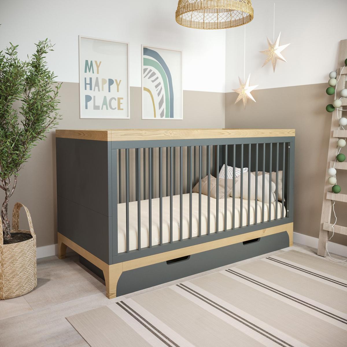 All-in-one bundle includes a cot that grows with your baby, a space-saving changing unit, and a high-quality mattress for a comfortable sleep. The cot features an adjustable base to reduce back strain and easily converts into a toddler bed offering long-term value. Three adjustable base heights make lifting your baby in and out easy, while a built-in storage drawer keeps essentials organised. The Sleepful fibre mattress offers firm, breathable, and hypoallergenic support, keeping your baby safe and comfortable. Water-resistant and abrasion-resistant mattress is built to last, while the cot and changer meet the highest British safety standards, ensuring peace of mind for parents. Create a cosy nursery for your little one with the Rue cot bed paired with Sleepful hypoallergenic, fully breathable, firm and comfortable fibre mattress. The cot bed features a storage drawer and teething rails. It has 3 adjustable cot base heights, enabling you to lift baby in and out with ease. It's suitable from birth and the 2-in-1 design converts into a toddler bed to last until approximately four years old and will even fit a standard bed guard. The Sleepful fibre cot mattress is hypoallergenic, breathable, firm and comfortable. It has an Eco-fibre core that cradles the baby in cloudlike comfort while providing the recommended level of firmness for safe sleep. The softly quilted fabric is fully breathable and encourages natural airflow to help maintain a comfortable sleeping climate for baby. Water-resistant, durable and abrasion-resistant for extra-long life use. All Sleepful nursery mattresses are made for safer sleep, and tested to the highest British Standards for flammability (BS 7177:2008+A1:2011), performance and safety (BS EN 16890). Dimensions:W144 x D74 x H81.5 cm Packaging dimensions:W153 x D87.5 x H21 cm Weight: 40 kg Number of drawers: 1 Drawer dimensions:W136.5 x D61.8 x H9 cm Bed base height options: 38.5 cm, 51 cm and 64 cm Colour: Grey and pine Finish: Painted Material: Wood Bed base: Wooden slatted Mattress included:Yes Mattress required: 140 x 70 cm Assembly required: Yes Teething rails included Conforms to European safety standard EN 716:2008+A1:2013 and British safety standard BS 8509:2008+A1:2011 Dimensions:H140 x W70 x D10 cm Weight: 2.6 kg Filling: Removable, hypoallergenic cover with polypropylene, washable at 40 degrees Finish: Sonic Quilted Tested to meet British Standard Regulations BS7177 Made in the UK Suitable from birth
