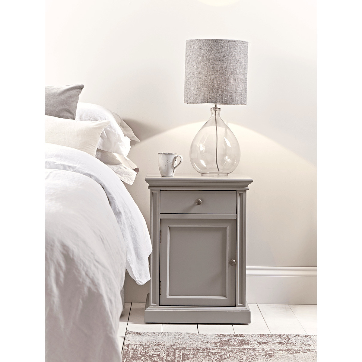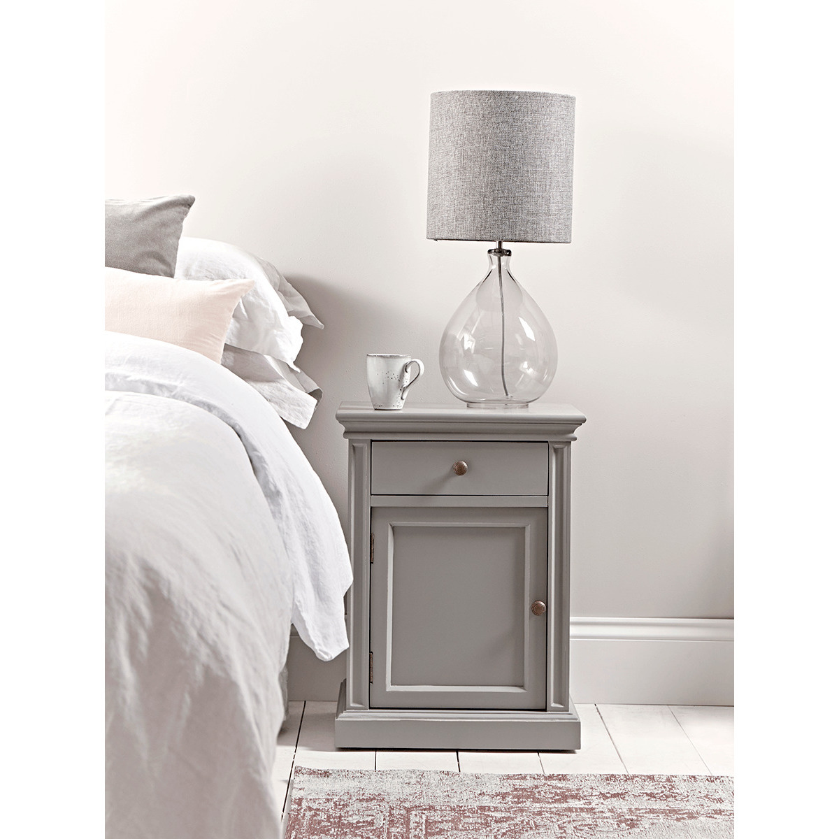 I’d reach for this grey bedside when you need a versatile, understated piece that blends with Scandi, coastal or soft-industrial schemes. Its muted paint finish and simple moulded details give just enough character without overwhelming a small bedroom. For practical styling, keep the top clear for night-time essentials - a low-profile lamp, a small pot plant or reed diffuser - and tuck bedside clutter away in the cabinet. Pair with warm metallic accents (brass or aged bronze) to lift the grey tone, and layer a textured rug underfoot to soften the overall look.