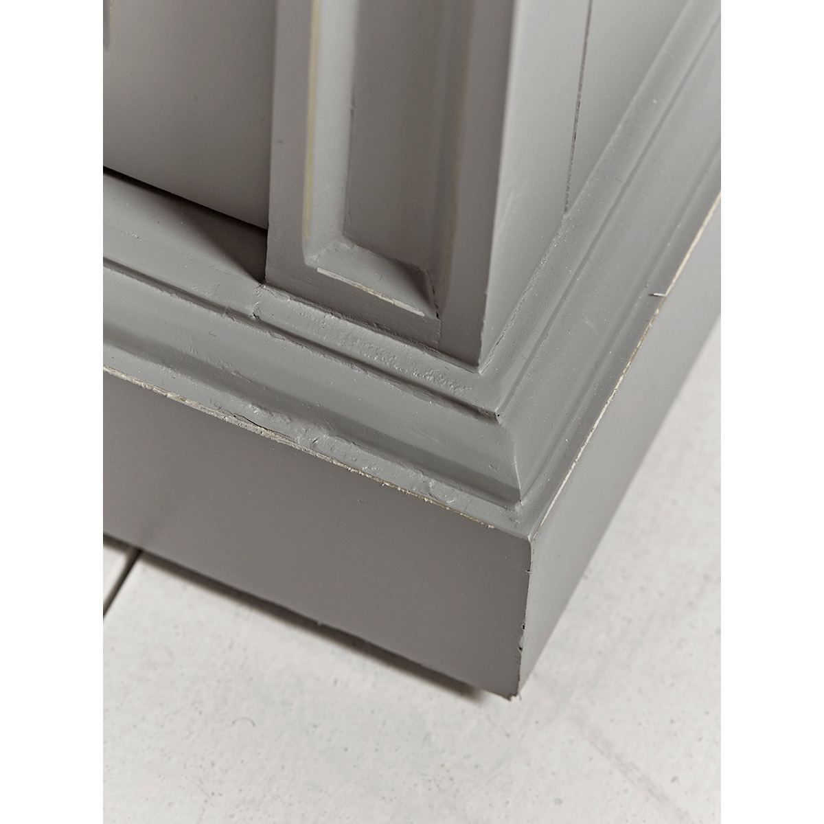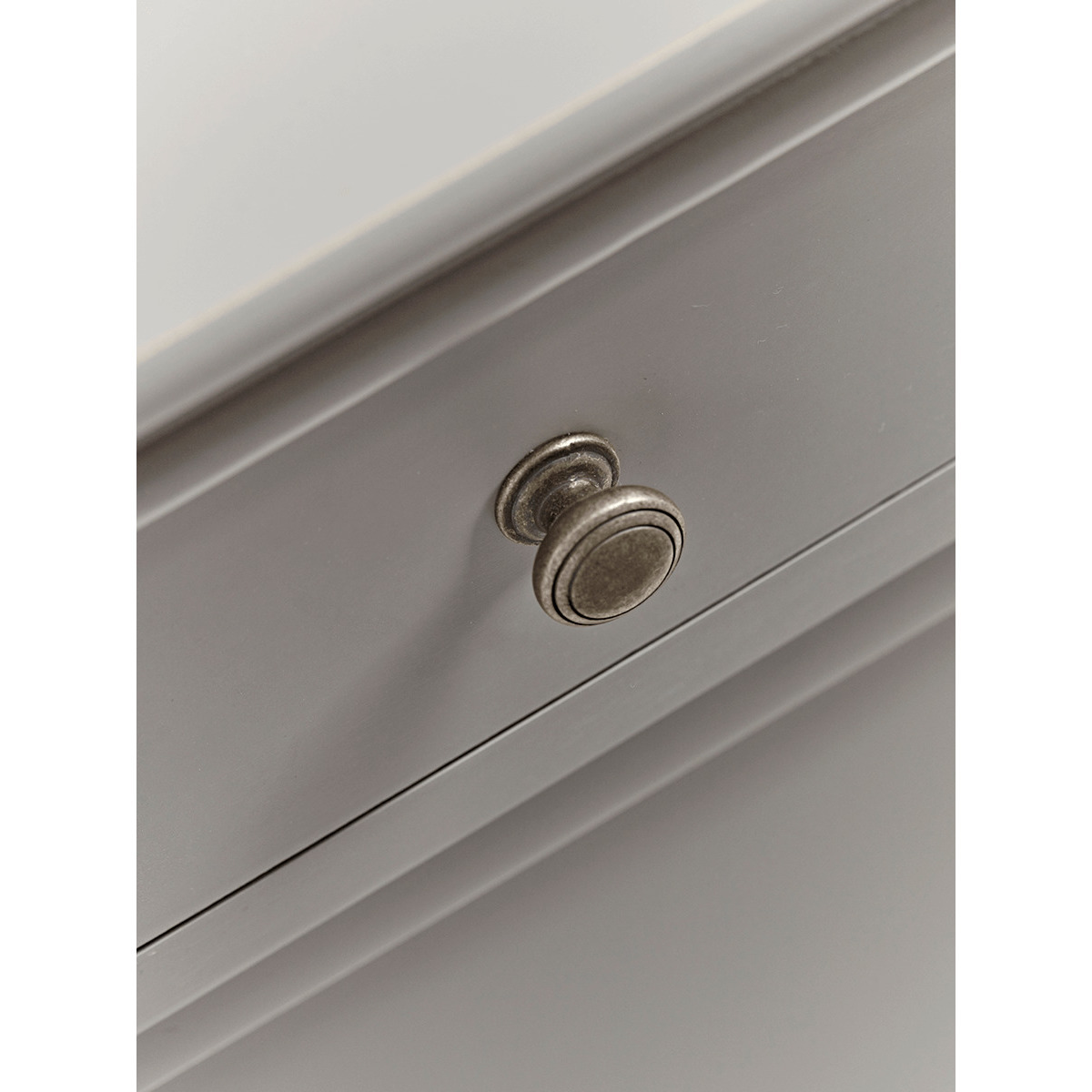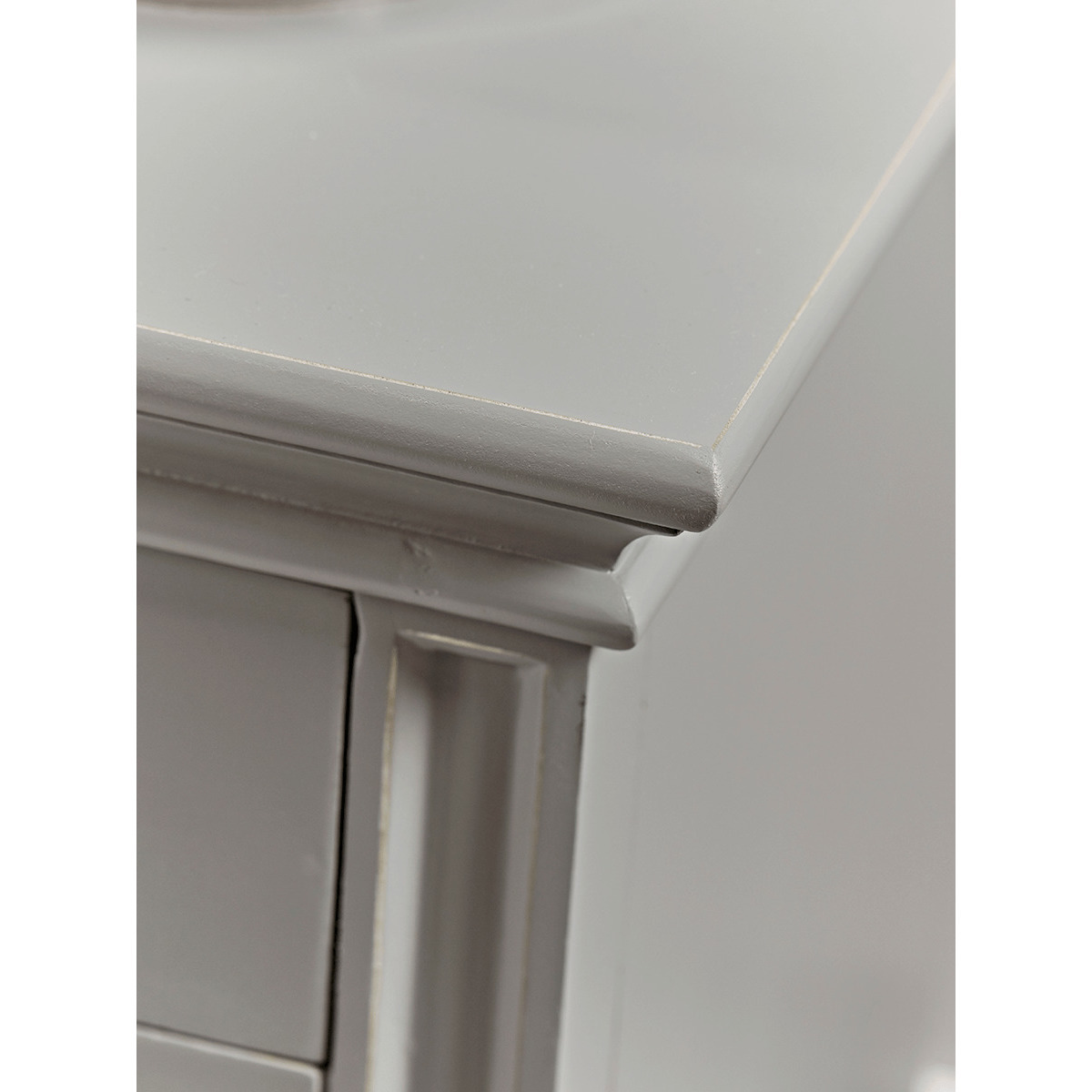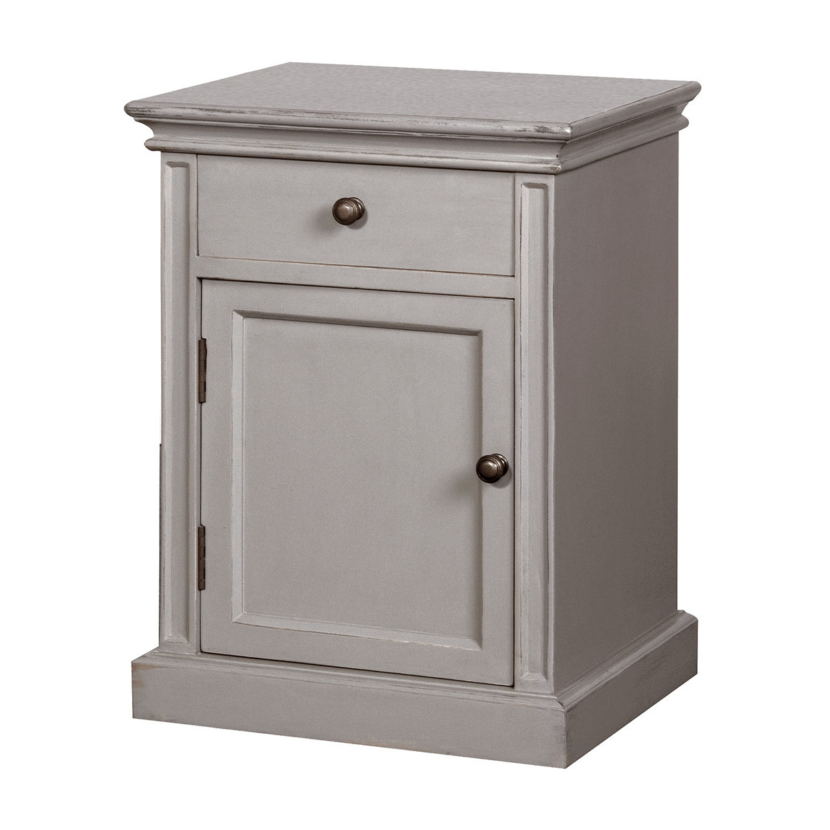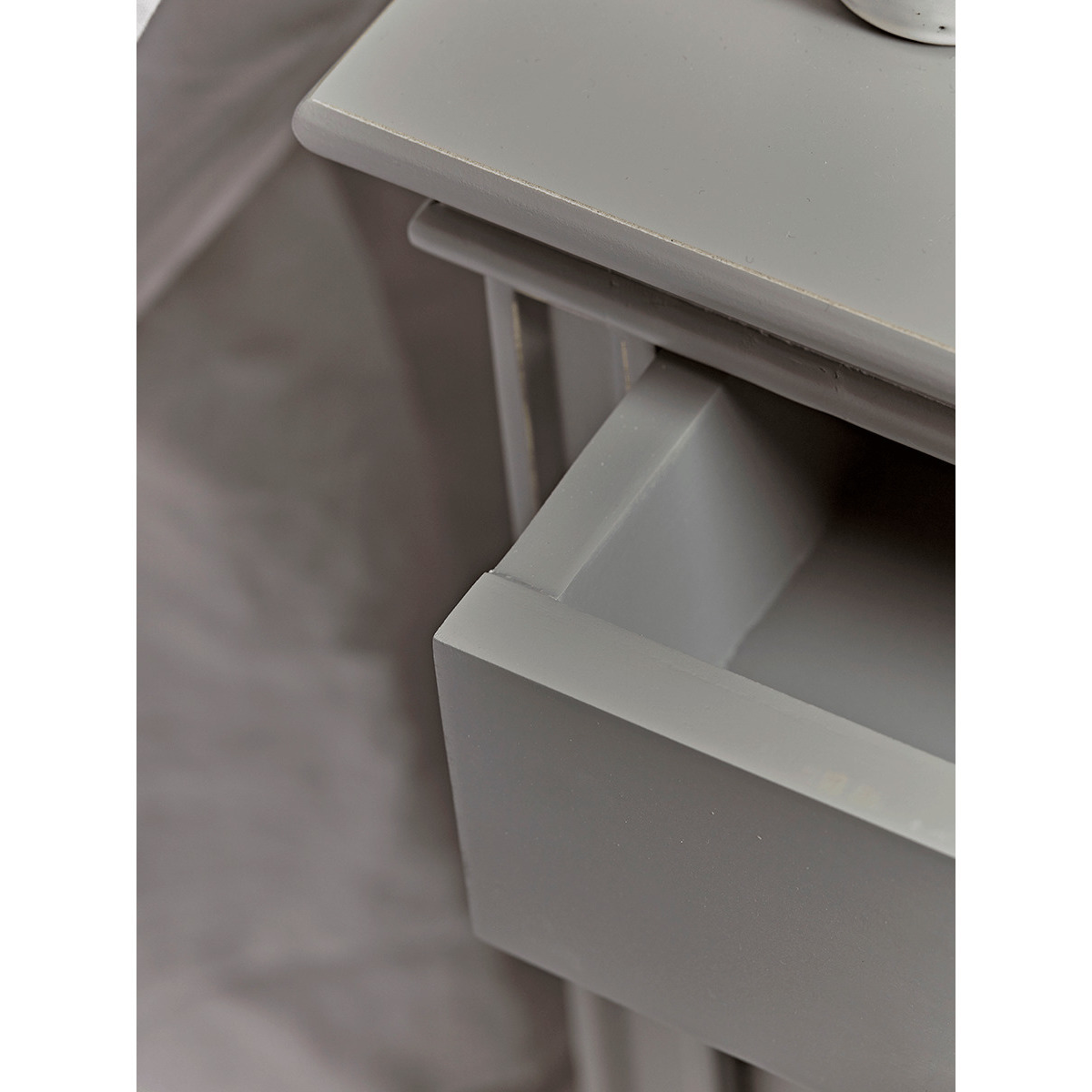 Complete with a cupboard and smooth slide drawer for storage, our practical and stylish bedside table has an elegant, gently distressed grey finish and carved details. The drawer and cupboard each feature an engraved zinc finish knob.