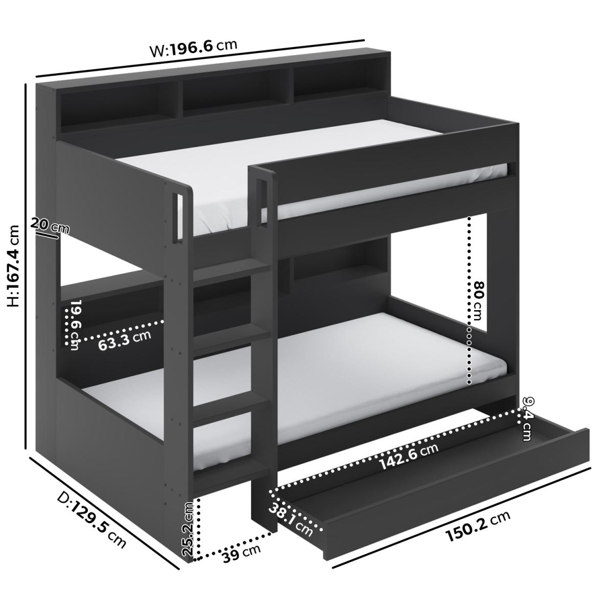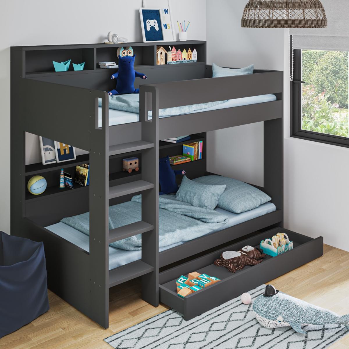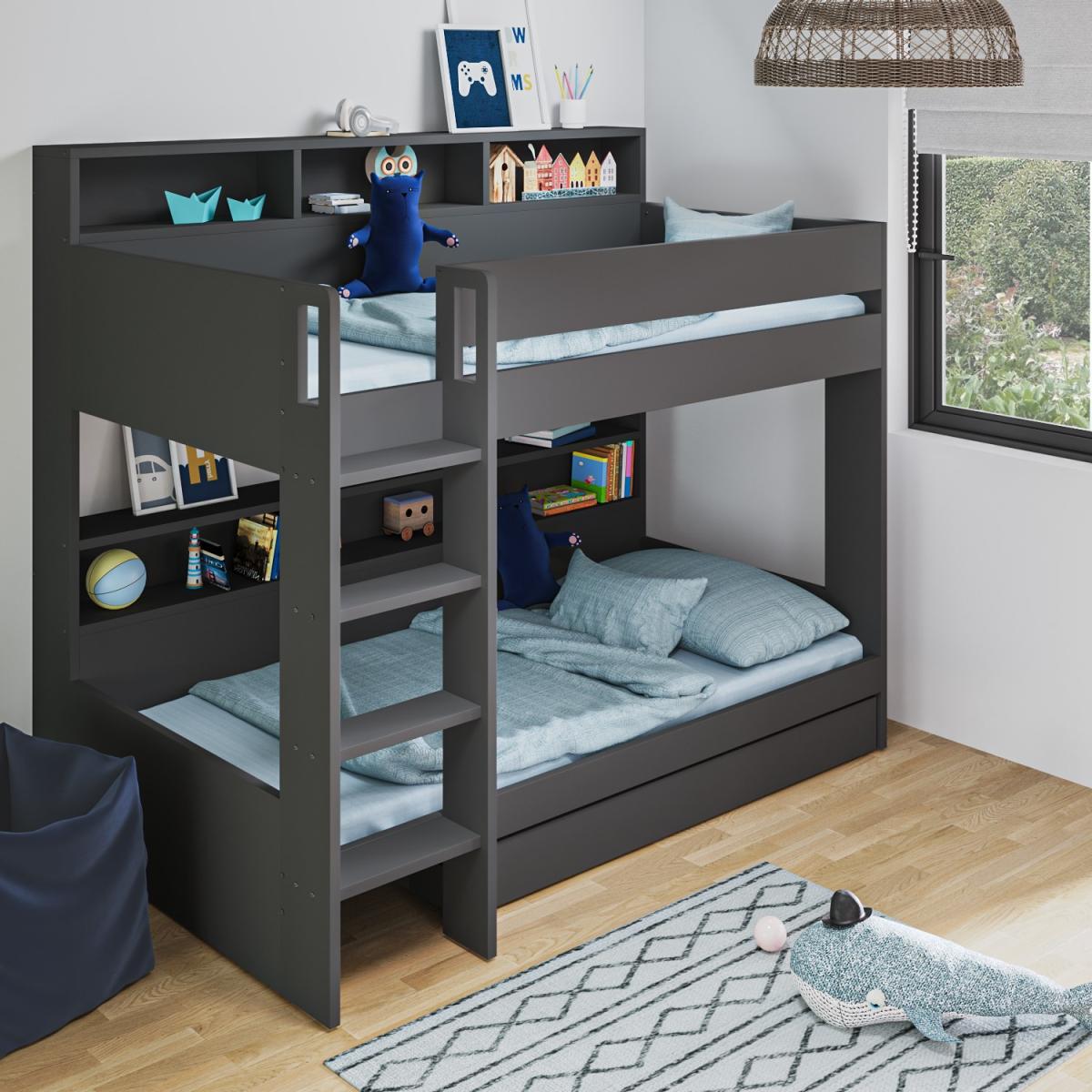 This bundle includes : Grey Bunk Bed Storage Shelves - Aire1 x Aire Trundle in Anthracite All about me The Aire wooden bunk bed is a fun, modern addition to any children's bedroom. The bunk bed features and built-in shelves and room for storage underneath to help save on floor space. During assembly, you can choose which side to fit the ladder to suit the room layout. Check out our package deals and save 10% on two mattresses. Need to know Dimensions:W196.6 x D129.5 x H167.7 cm Weight: 124 kg Mattresses included: No Mattresses required: 2 x 90 x 190/3ft (Standard UK single) Maximum mattress height: 18 cm Maximum supported weight: 100 kg (including mattress) Colour: Grey Finish: Matt foil Material: Particle board Bed base:Wooden slats Assembly required: Yes Packed dimensions (box 1): W205 x D48.5 x H14.5 cm (59 kg) Packed dimensions (box 2): W175 x D49 x H15 cm (48 kg) Packed dimensions (box 3): W95.5 x D33 x H10.6 cm (17 kg) Complies with EU and British safety standards (EN747)