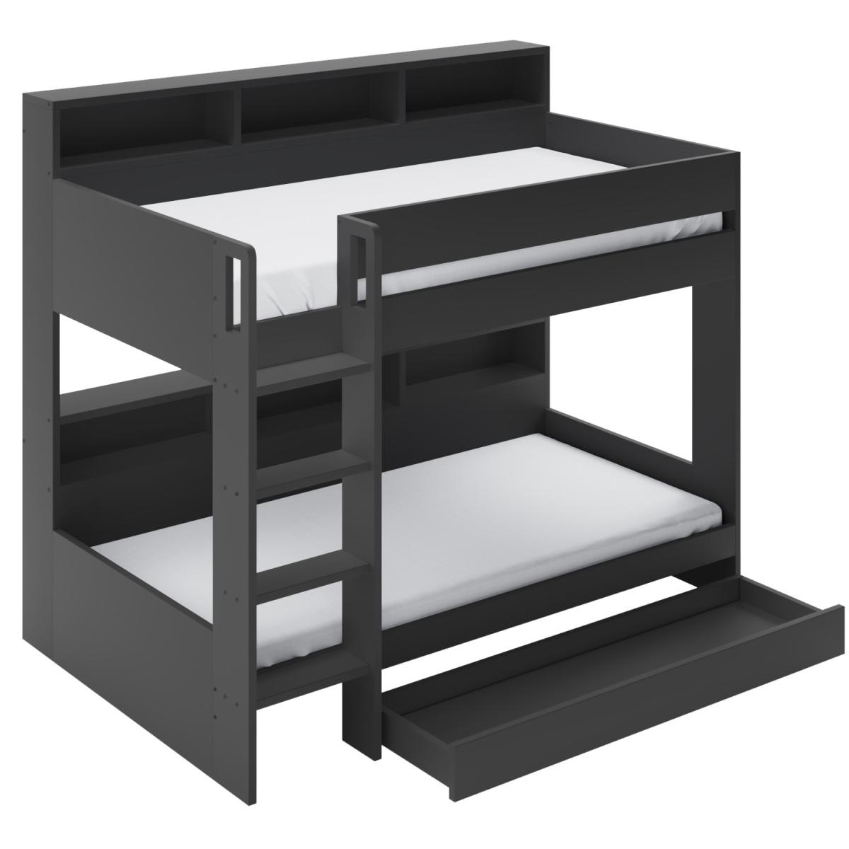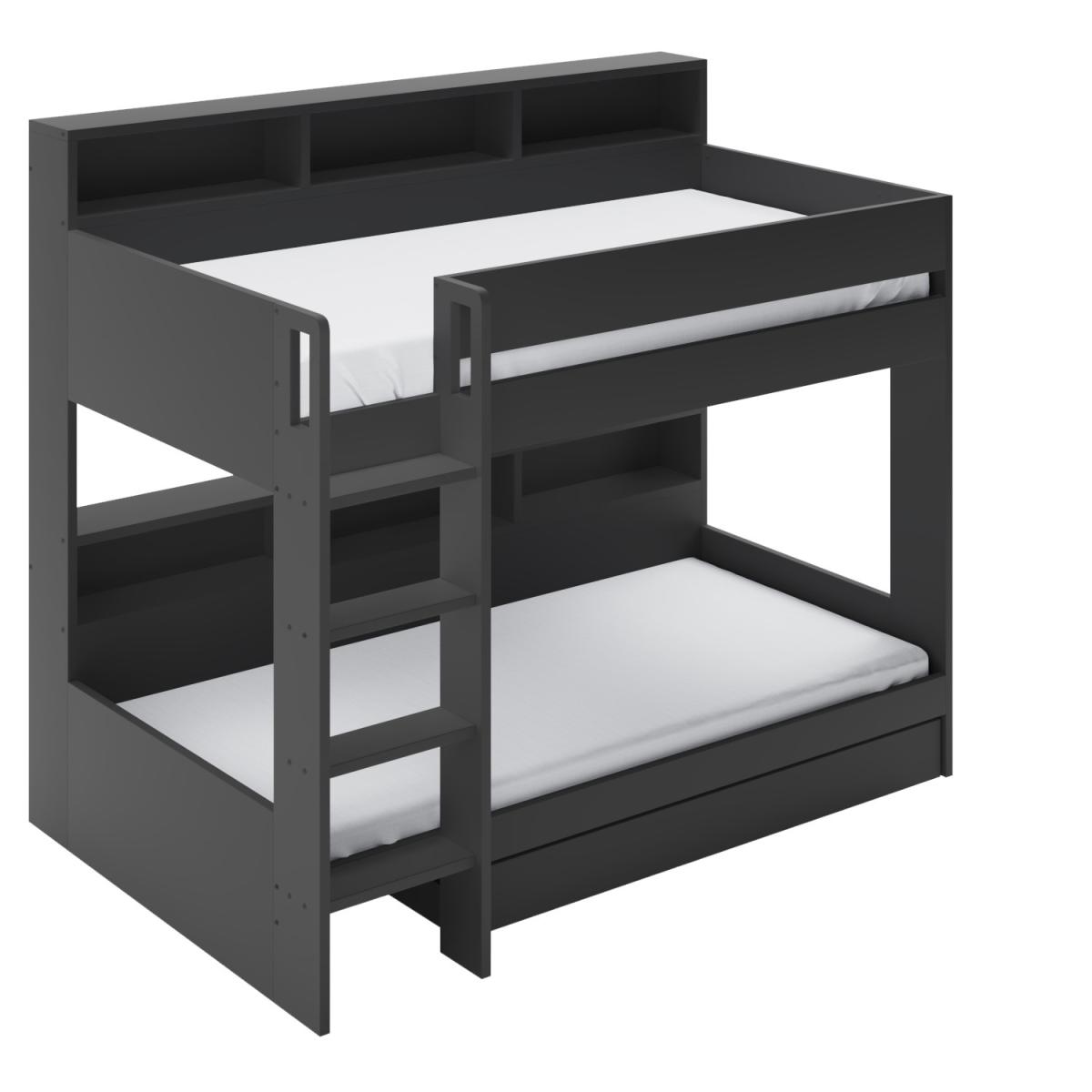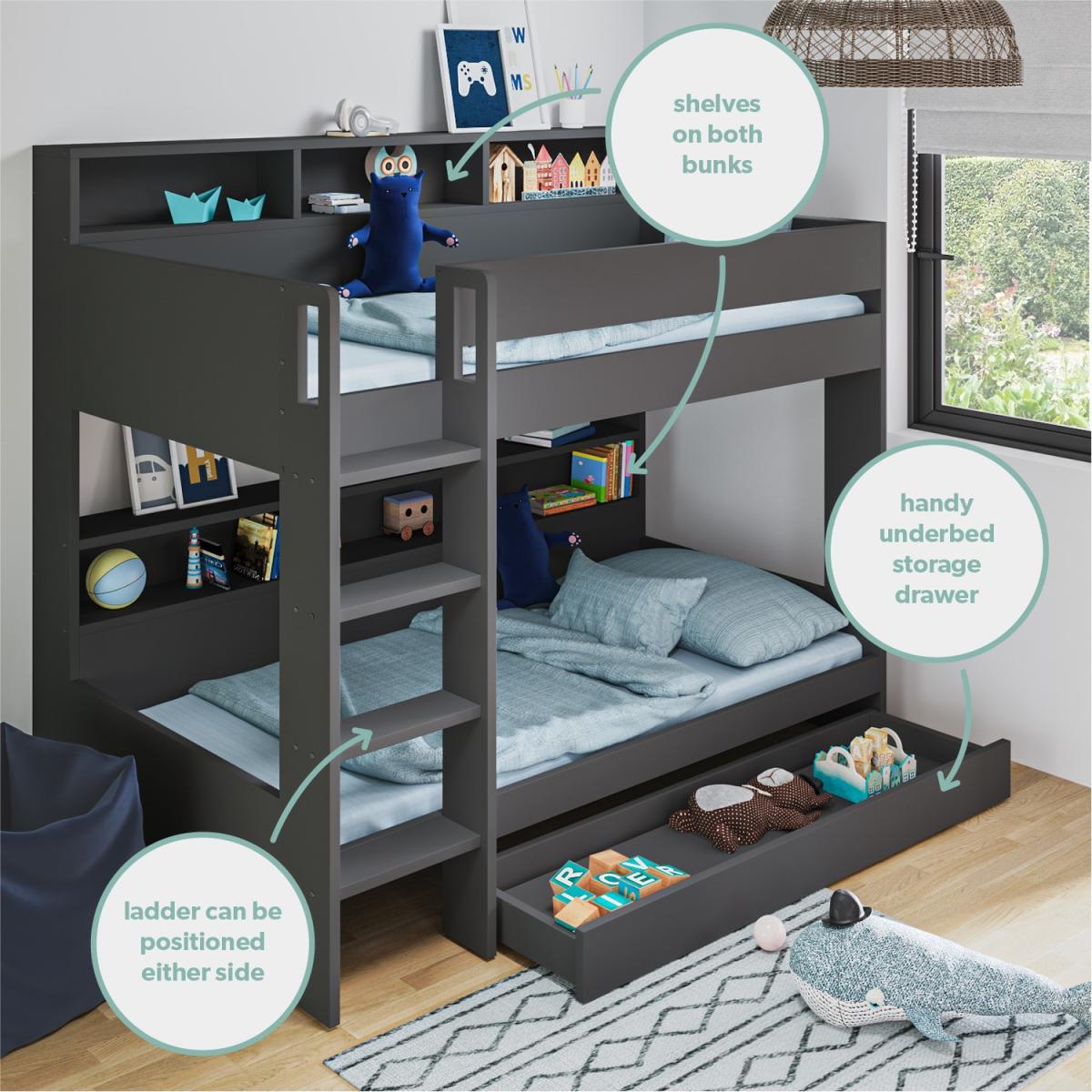 This bundle includes : Grey Bunk Bed Storage Shelves - Aire1 x Aire Trundle in Anthracite All about me The Aire wooden bunk bed is a fun, modern addition to any children's bedroom. The bunk bed features and built-in shelves and room for storage underneath to help save on floor space. During assembly, you can choose which side to fit the ladder to suit the room layout. Check out our package deals and save 10% on two mattresses. Need to know Dimensions:W196.6 x D129.5 x H167.7 cm Weight: 124 kg Mattresses included: No Mattresses required: 2 x 90 x 190/3ft (Standard UK single) Maximum mattress height: 18 cm Maximum supported weight: 100 kg (including mattress) Colour: Grey Finish: Matt foil Material: Particle board Bed base:Wooden slats Assembly required: Yes Packed dimensions (box 1): W205 x D48.5 x H14.5 cm (59 kg) Packed dimensions (box 2): W175 x D49 x H15 cm (48 kg) Packed dimensions (box 3): W95.5 x D33 x H10.6 cm (17 kg) Complies with EU and British safety standards (EN747)
