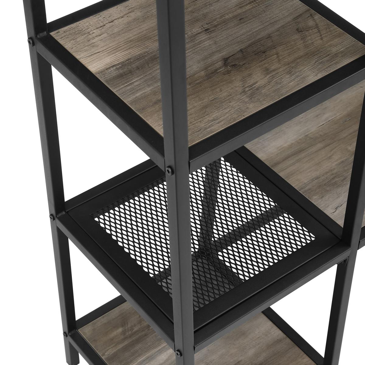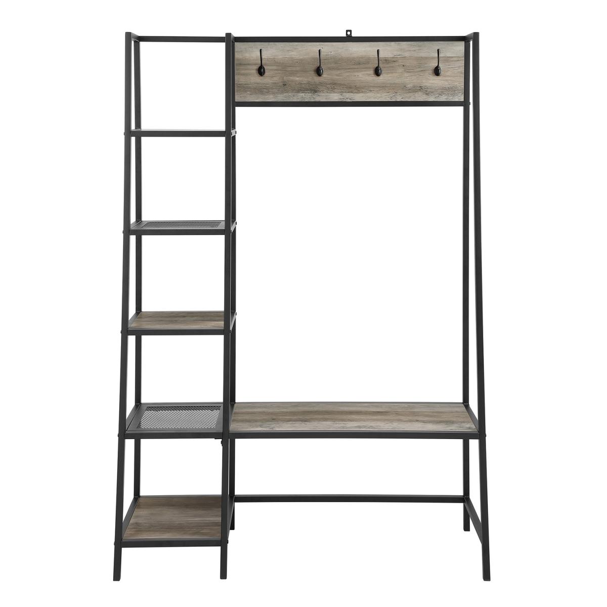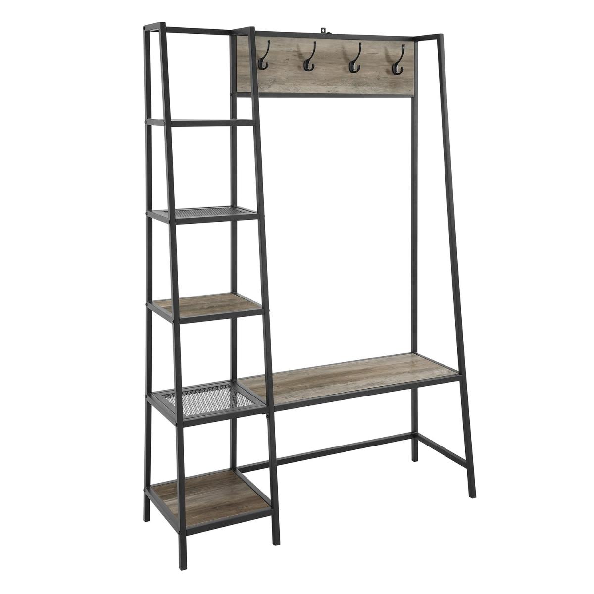 Dimensions H173 x W117 x D41 cm. Transform your entryway with this modern industrial hallway unit. Our hallway unit creates the perfect spot to place your daily items for easy access before heading out the door. With five side shelves four top hooks and a bench that can also be used as a shelf this piece is truly versatile. A metal frame keeps the structure sturdy with durable laminate and mesh metal shelving. Sit on the bench to put on your shoes unhook your jacket from above and grab your bag on one of the shelves just in time to leave your home. Features. With a blend of metal and durable laminate for a strong design. With a melamine finish that helps resist to moisture. Featuring a modern industrial style. Includes wall mount hardware for added stability. The open storage and bench create a versatile hall unit Assembly required..