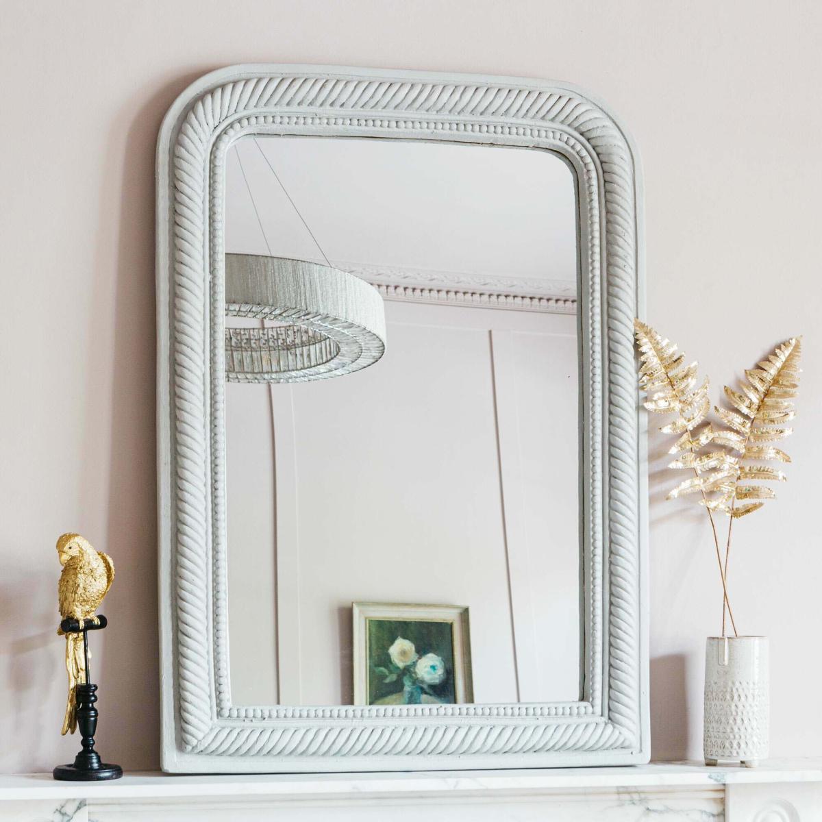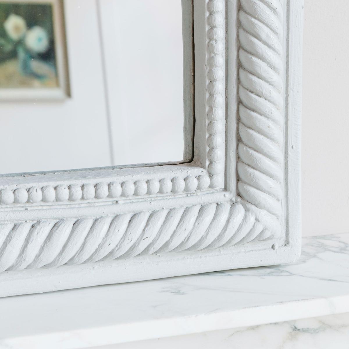 Featuring a matte chalk painted finish, this French renaissance style mirror has a curved top and intricate rope design.