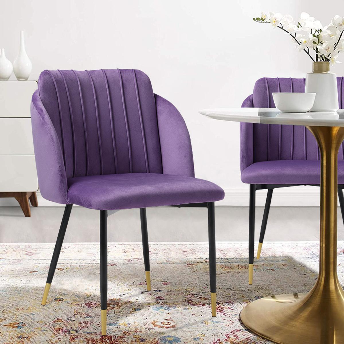 Perfect for a breakfast nook or dining table, these dining chairs are sleek and offer maximum back support. The arm design also means the chairs can slide underneath tables flawlessly. A perfect fusion of comfort and style with cushioned build features and hourglass silhouette and solid, strong, sturdy legs. The dining chair with a simple yet contemporary design can match any decor or setting, with classic button-style tufting which is then complemented by chrome studded trim and a high accent back ring like a door knocker. A classic design with a modern flair, the modern chairs seamlessly fit into any home.
