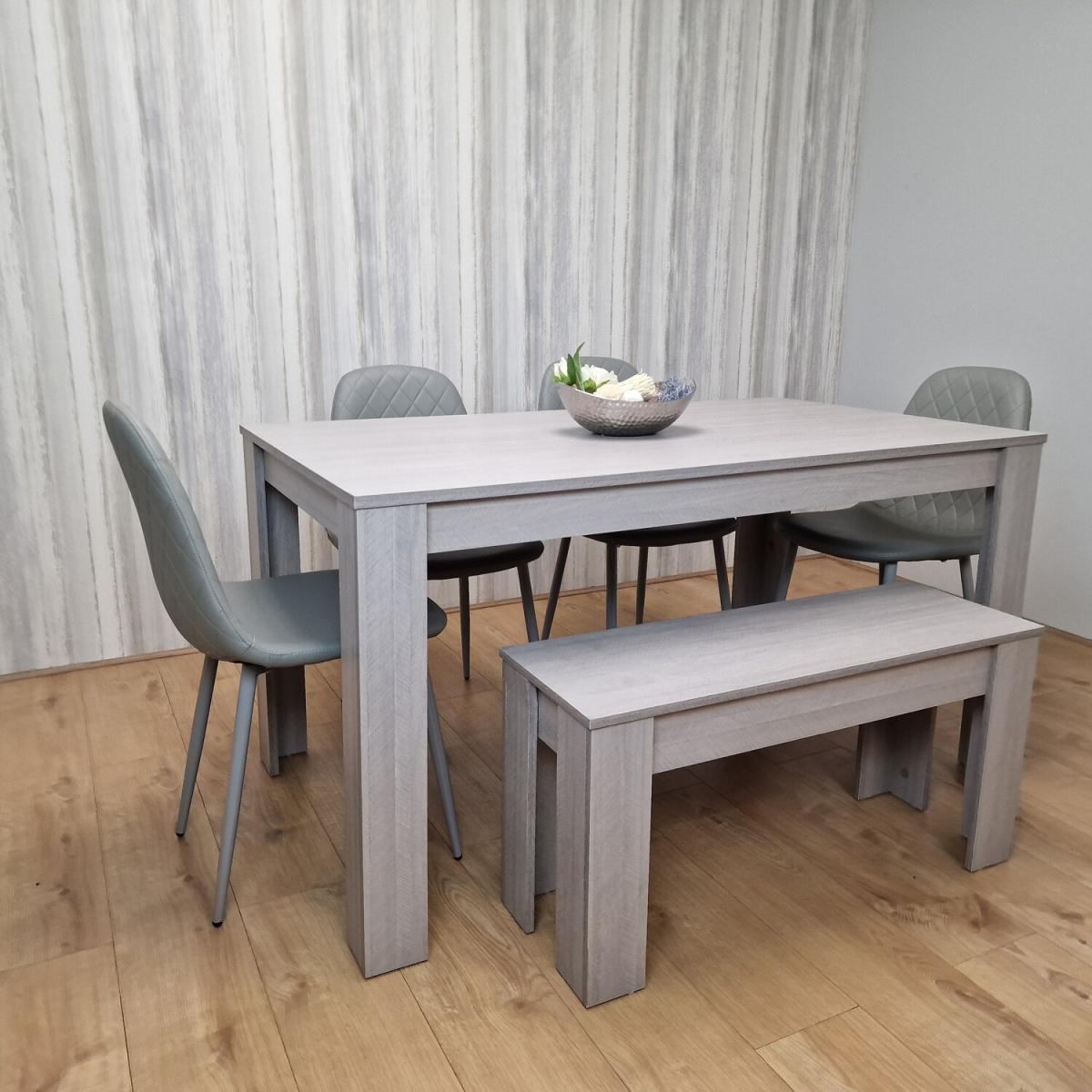 Enhance your dining area with our stylish yet straightforward Dining Set, thoughtfully designed for both functionality and aesthetics. Crafted from high-quality MDF in a tasteful Grey finish with a subtle Arrow effect, this set adds a touch of sophistication to your dining space. A simple yet elegant grey tabletop with a hint of the Arrow effect, making it a versatile addition to your dining area. Included in the set are four Grey Chairs, designed for comfort and easy upkeep. Upholstered in faux leather, these chairs feature subtle diamond-pattern stitching on the backrest, adding a touch of refinement to your dining area. The chairs come with sturdy metal legs equipped with adjustable foot protection, ensuring stability on different floor surfaces. This practical feature ensures that your dining experience is comfortable and stable.