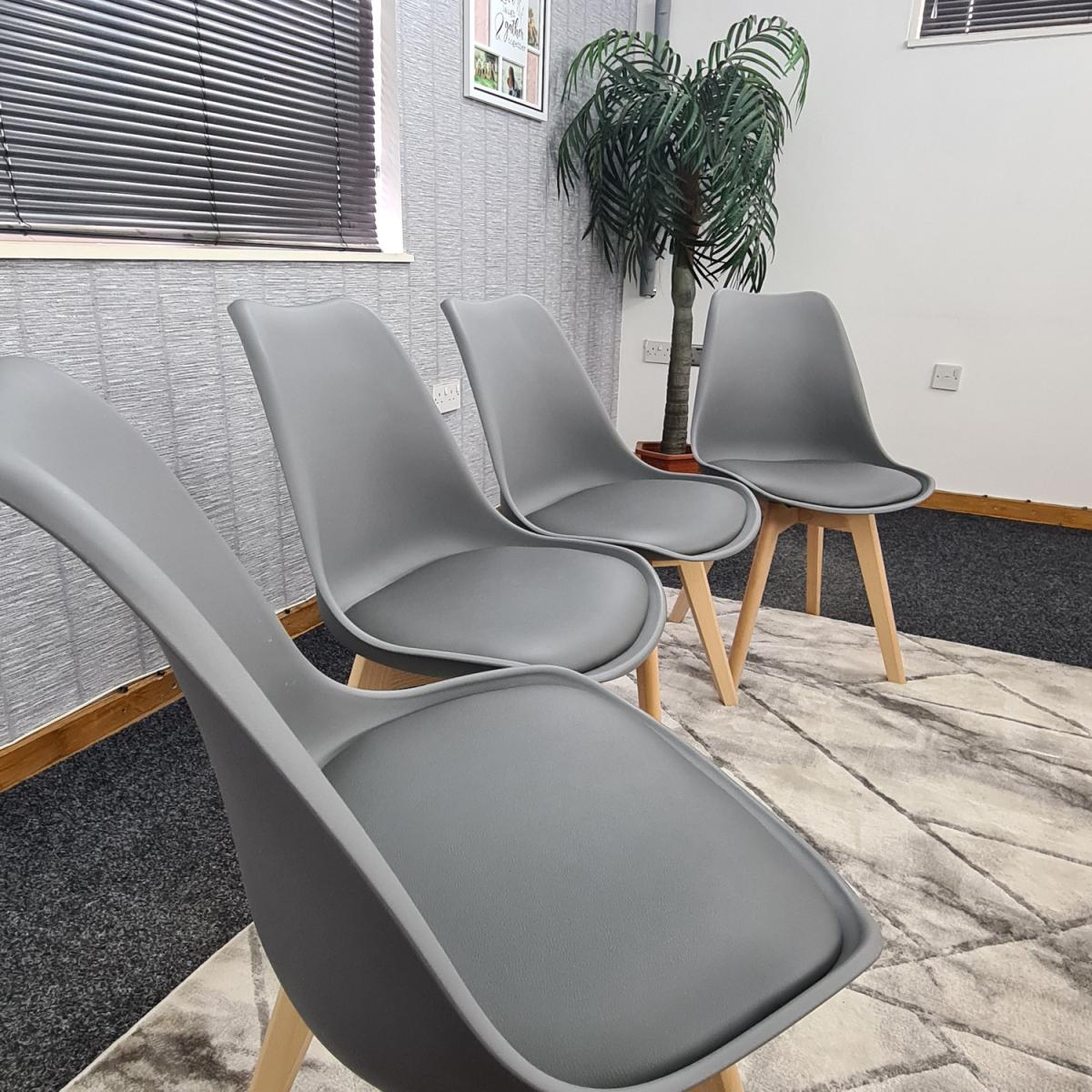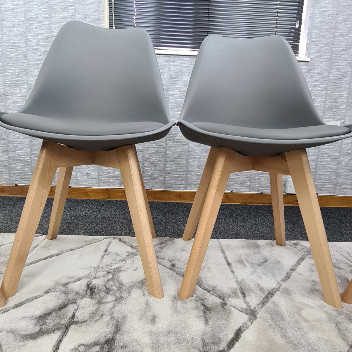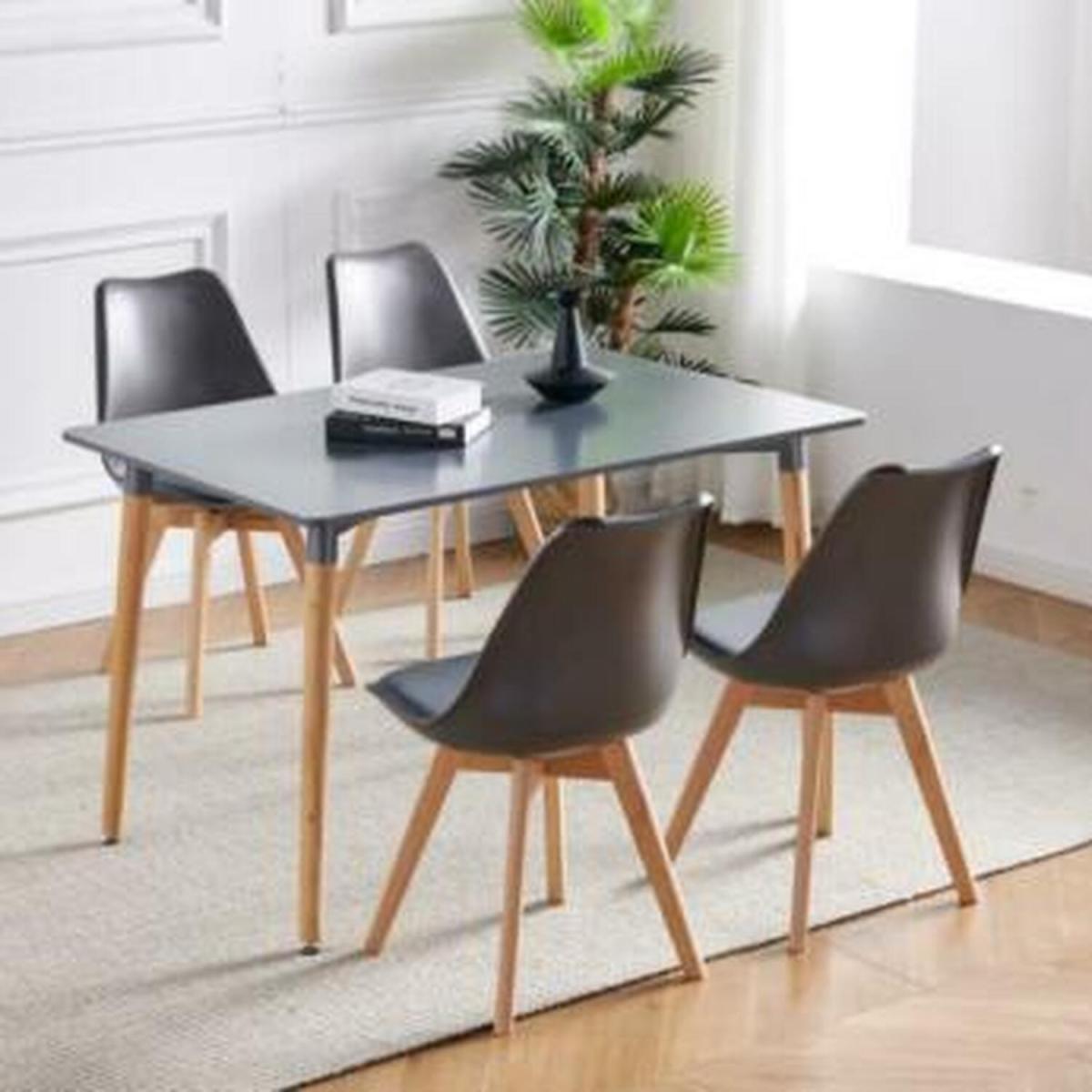 Grey Wood Style Rectangle Dining Table comes with 4 Grey Chairs. The metal legs of the table are decoratively wrapped in a wood effect finish. Strong Sturdy Made of premium plastic, wood and PU leather seat, high quality and durable. Both chairs and table come with Plastic glides for floor protection. Basic assembly is required, The White colour in our selection complements any decor. Ultra-stylish and surprisingly comfortable, the iconic chair is made from a moulded shell that's designed for every 'body', All fittings and instructions are included.