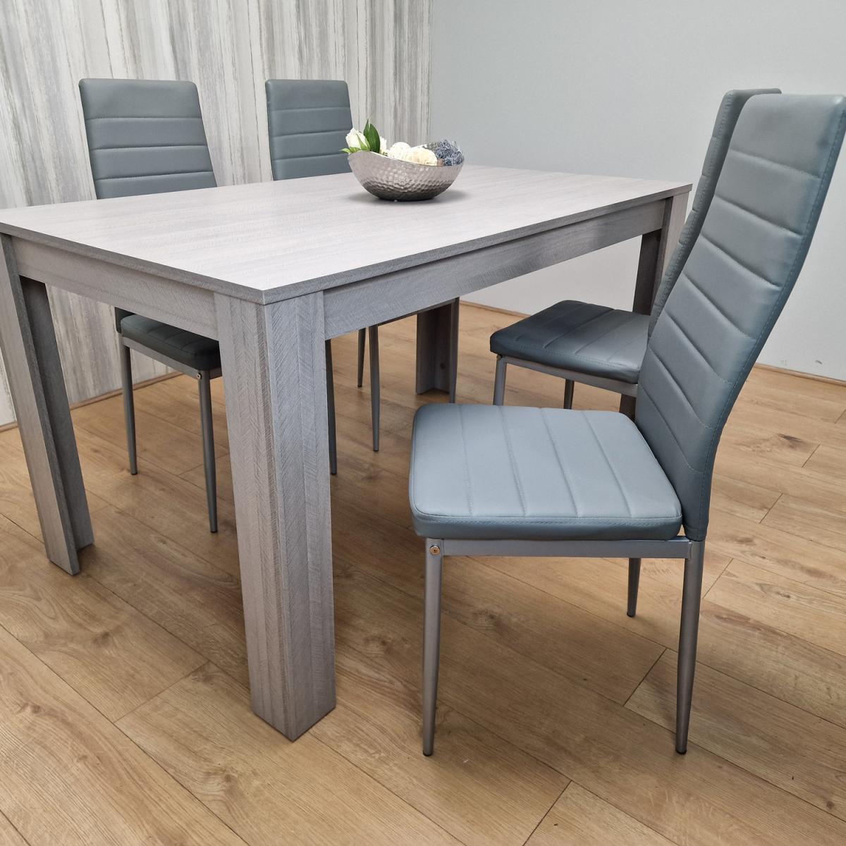 Enhance your dining area with our stylish Dining Set. Crafted from high-quality MDF in grey, this set effortlessly combines aesthetics and practicality. The dining table features a sleek grey tabletop with an Arrow effect, making it a versatile addition to your dining space. Whether it's a family meal or a casual get-together, this table provides a solid foundation for your dining needs. Included in the set are four matching Grey Chairs upholstered in faux leather for a touch of sophistication and easy cleaning. The chairs rest on sturdy metal legs with great strength and durability with adjustable foot protection, ensuring stability on various floor surfaces. This practical feature ensures that your dining experience is comfortable and wobble-free, the chairs seats and backrest are extra padded and cushioned for extra comfort when you sit on. This dining set is conveniently shipped in a flat-pack format, allowing for straightforward assembly upon arrival.