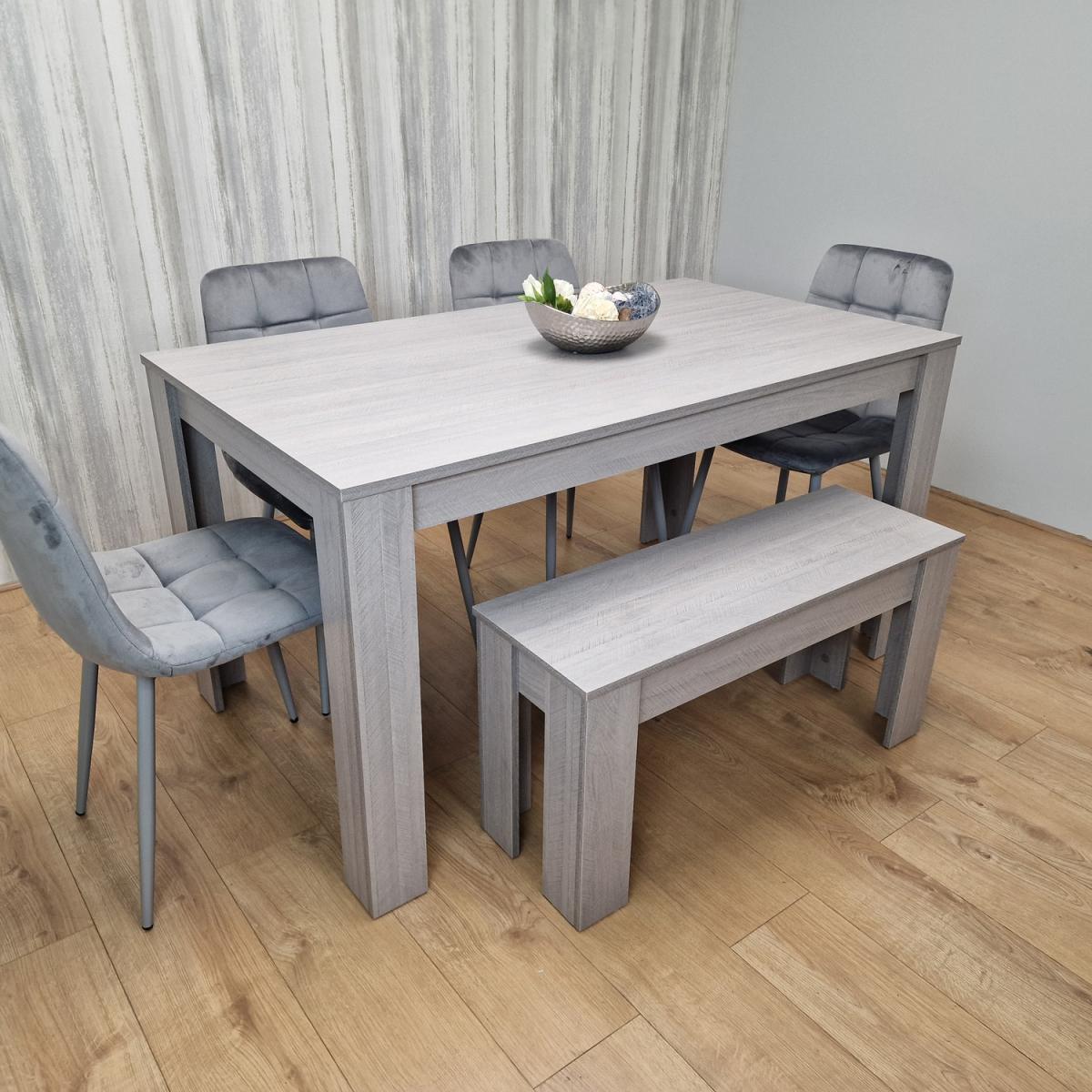 Enhance your dining area with our stylish Dining Set. Crafted from high-quality MDF in grey this set effortlessly combines aesthetics and practicality. The dining table, measuring 140 x 80 x 75 cm, features a sleek grey tabletop with Arrow effect, making it a versatile addition to your dining space. Whether it's a family meal or a casual get-together, this table provides a solid foundation for your dining needs. Included in the set are four matching Grey Tufted Chairs for a touch of sophistication and easy cleaning. The chairs rest on sturdy metal legs with great strength and durability with adjustable foot protection, ensuring stability on various floor surfaces. This practical feature ensures that your dining experience is comfortable and wobble-free, the chairs seats and back rest are extra padded cushioned for extra comfort when you sit on. This dining set is conveniently shipped in a flat-pack format, allowing for straightforward assembly upon arrival. Easy-to-follow instructions ensure a hassle-free setup, so you can start enjoying your new dining set in no time.