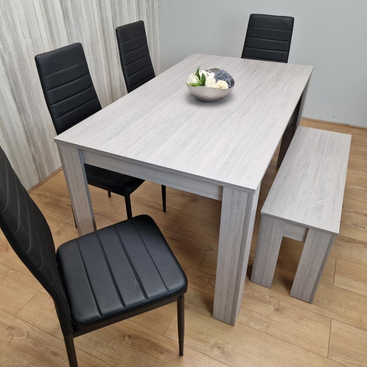 Grey Dining Table With 4 Black Leather Stitched Chairs With Matching Bench - Grey