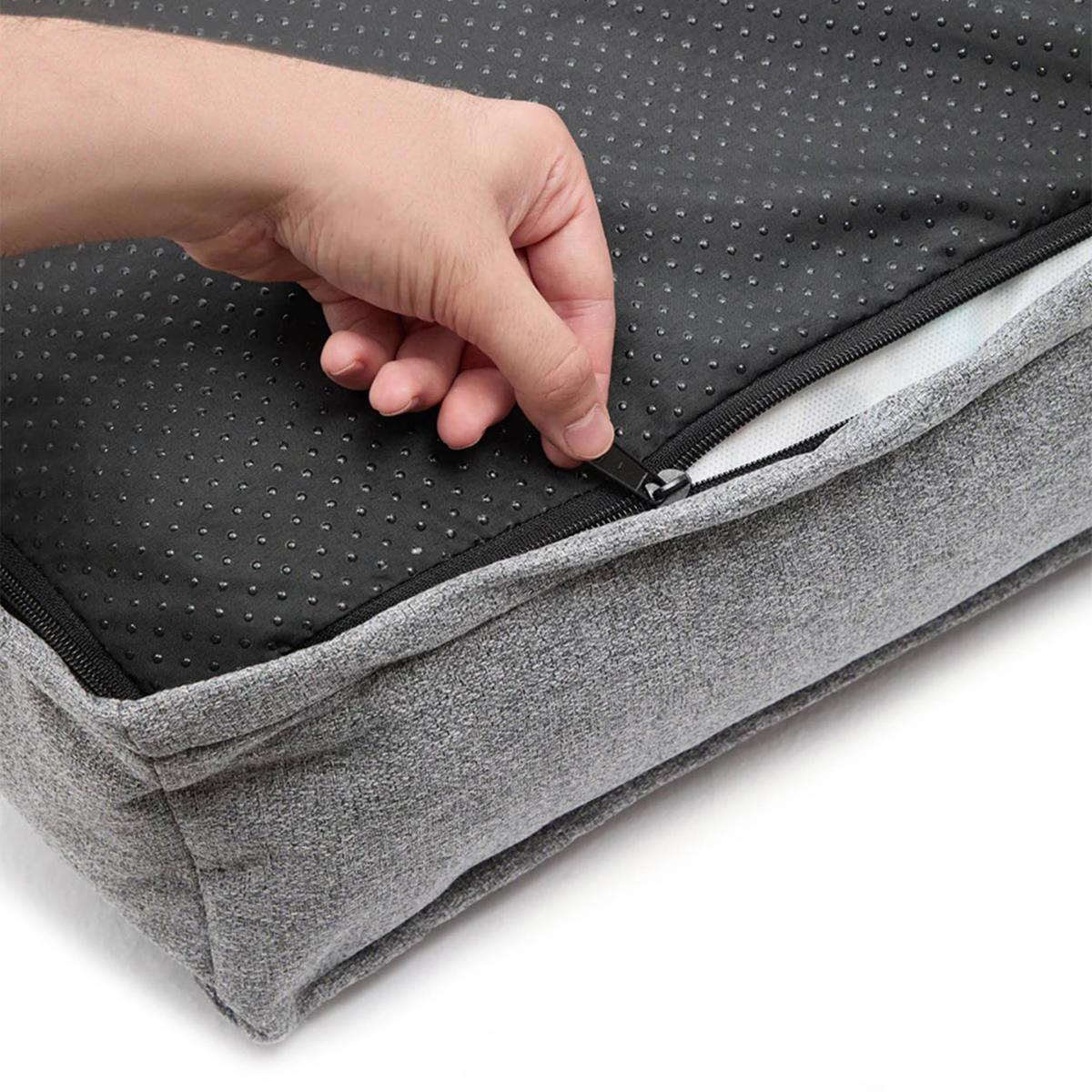 Removable and washable dog bed with soft touch fabric and made in Europe. The filling is made of recycled foam. The filling can be removed manually to adjust the height for all types of dogs.