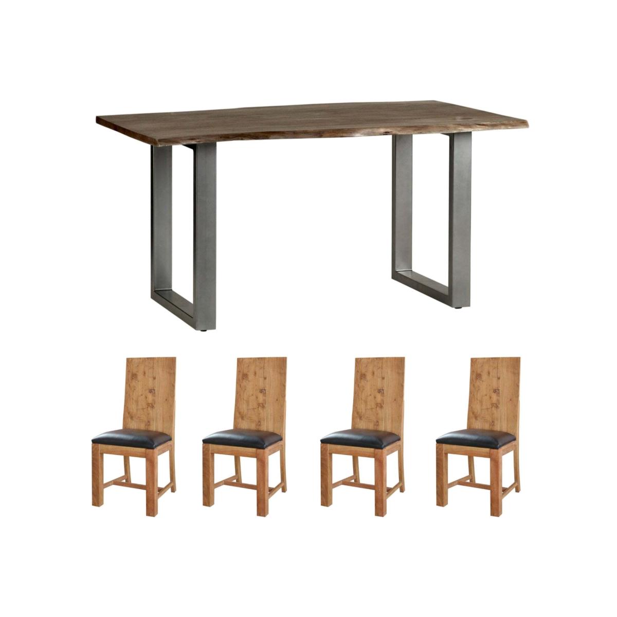 Indulge in the timeless elegance of the Grey Essential Live Edge Medium Sized Dining Table Set! Crafted from sustainable, solid Acacia Wood and lightly stained with a grey, matte finish, this majestic set includes 1 dining table and 4 chairs, perfect for any chic gathering. Plus, its unique variations, natural knots, and slight cracks only add to its rustic character. The chairs boast a chunky, robust design with padded black leather seats and high backs for superior comfort. Get ready to enjoy the perfect dining experience with this amazing set of dining table and chairs!