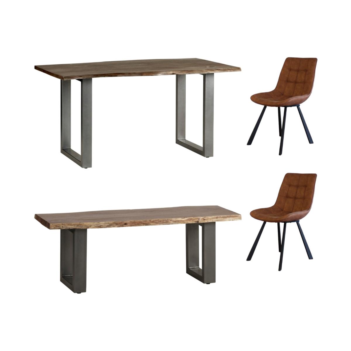 Choose the Grey Essential Live Edge Dining Table 1.5. M Set to complete your space with one dining table, two chairs and one bench. This handcrafted set features sustainably sourced solid acacia wood in a grey, matte finish with a metal base. The natural knots and slight cracks are part of its character. The industrial-style chairs are complemented with tapered steel legs and a tan PU leather-padded seat. The bench continues the style with its natural wood colour and matte finish. Add it all up, and you have a stunning set with a unique, one-of-a-kind look.
