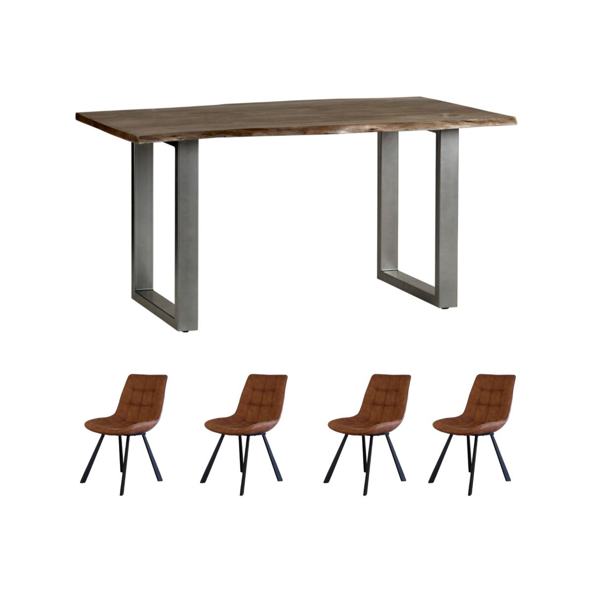 This stunning Grey Essential Live Edge Medium Sized Dining Table 1.5. M Set adds sophistication to any space. Handcrafted from sustainable sourced Acacia wood and lightly stained in a grey matte finish, this table boasts distinguished natural knots and cracks. Complete with 4 Industrial Style Chairs with steel tapered tube legs coated in black powder and topped with Light Brown Tan PU leather seating.