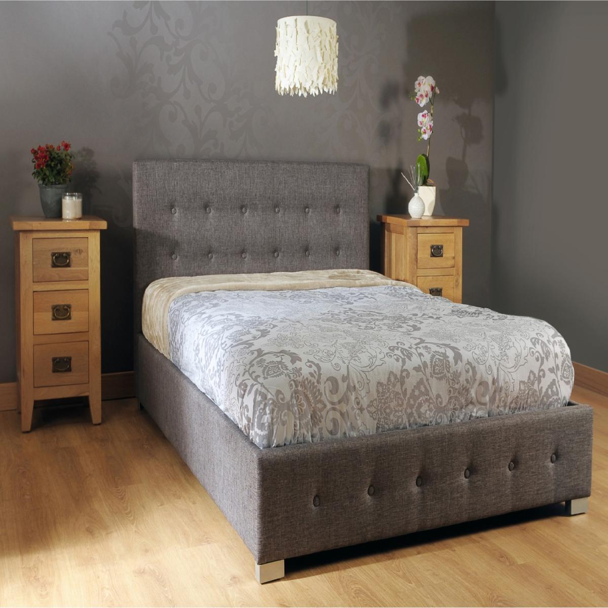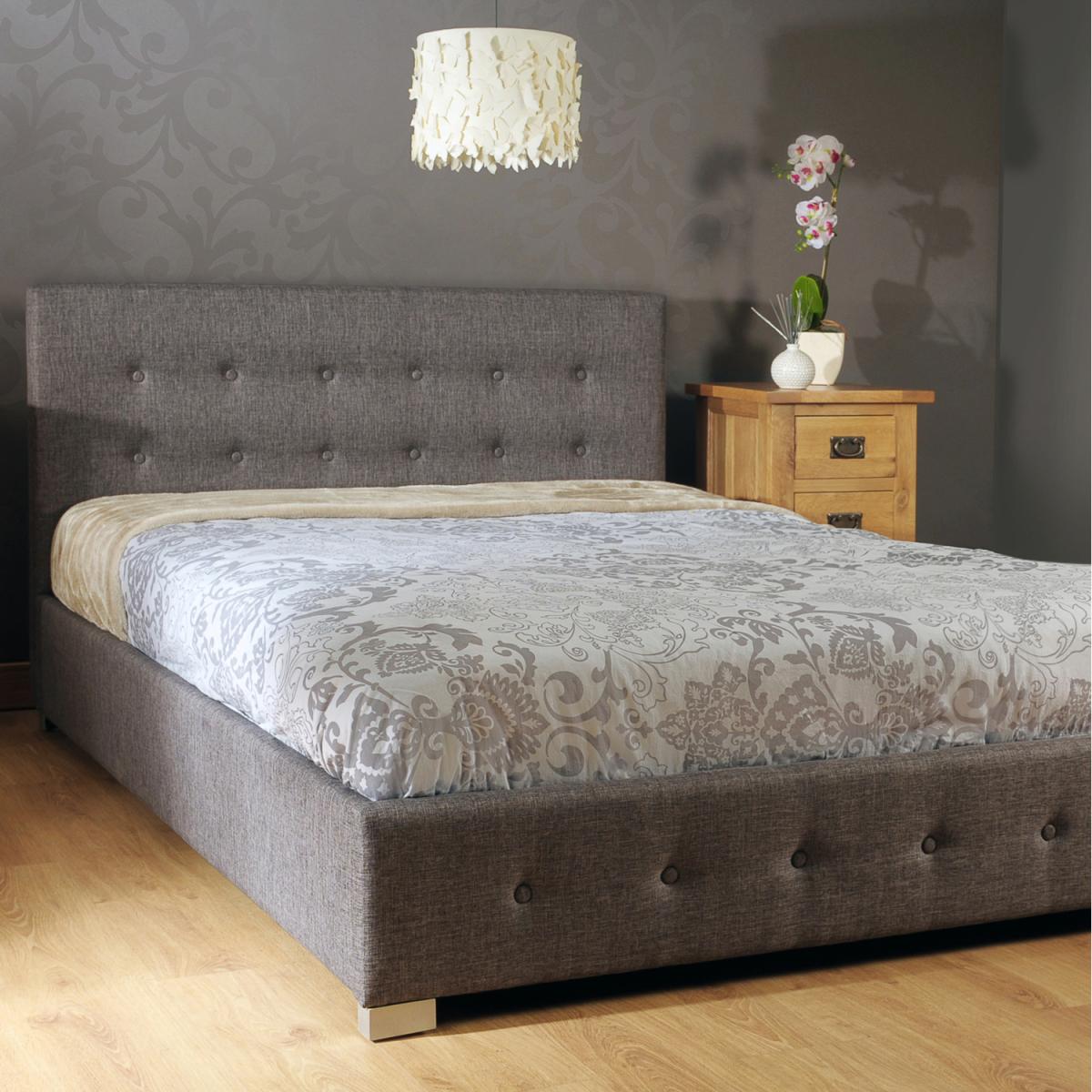 This distinguished fabric upholstered bed frame features a modern square headboard with button detail to the head and footboard and is finished with light wood feet. The great aspect of these bed frames is they feature a gas lift mechanism, that lifts up the mattress easily to reveal a straight to floor storage space, for all your bed linen and duvets the mattress is supported on a solid beech slats framework.