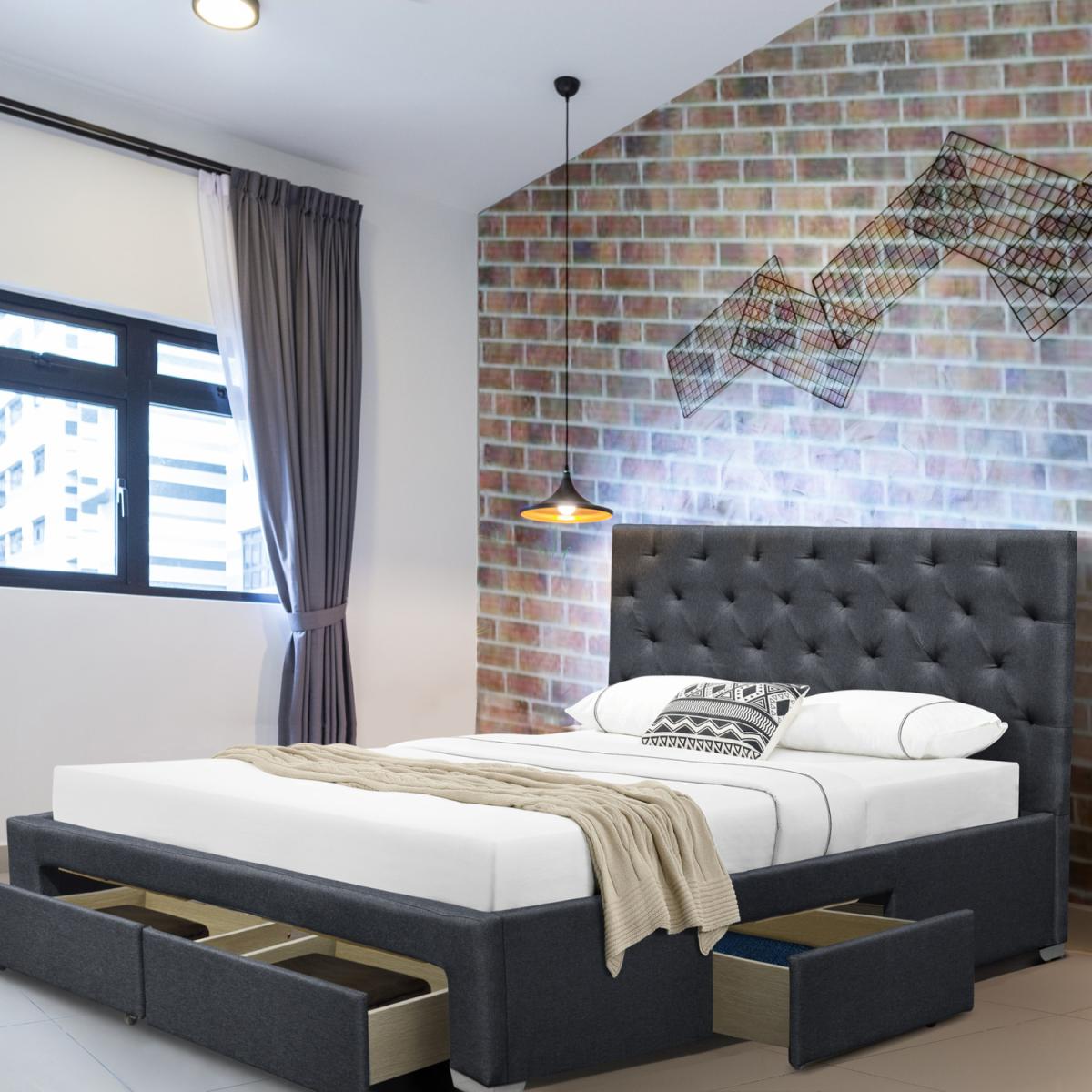 This stylish bed is beautifully upholstered in grey linen fabric. It features a deep padded buttoned headboard. It is made from a solid wooden frame and has a sprung slatted base to give support to the mattress and give you a fully supportive and comfortable night's sleep. This bed comes with 4 handy storage drawers.
