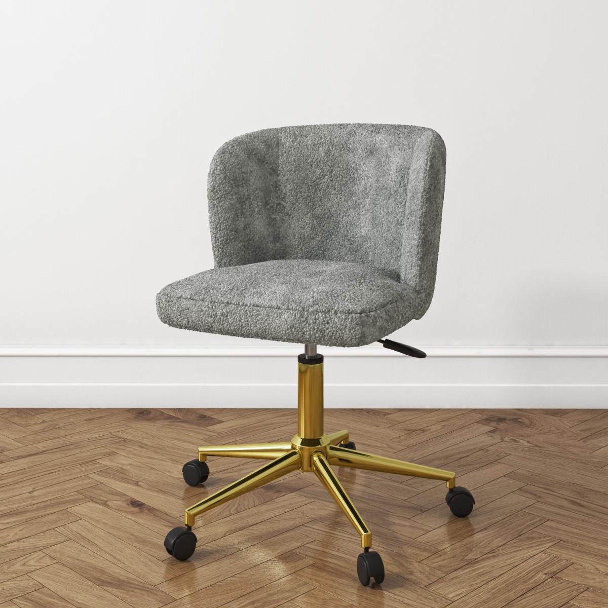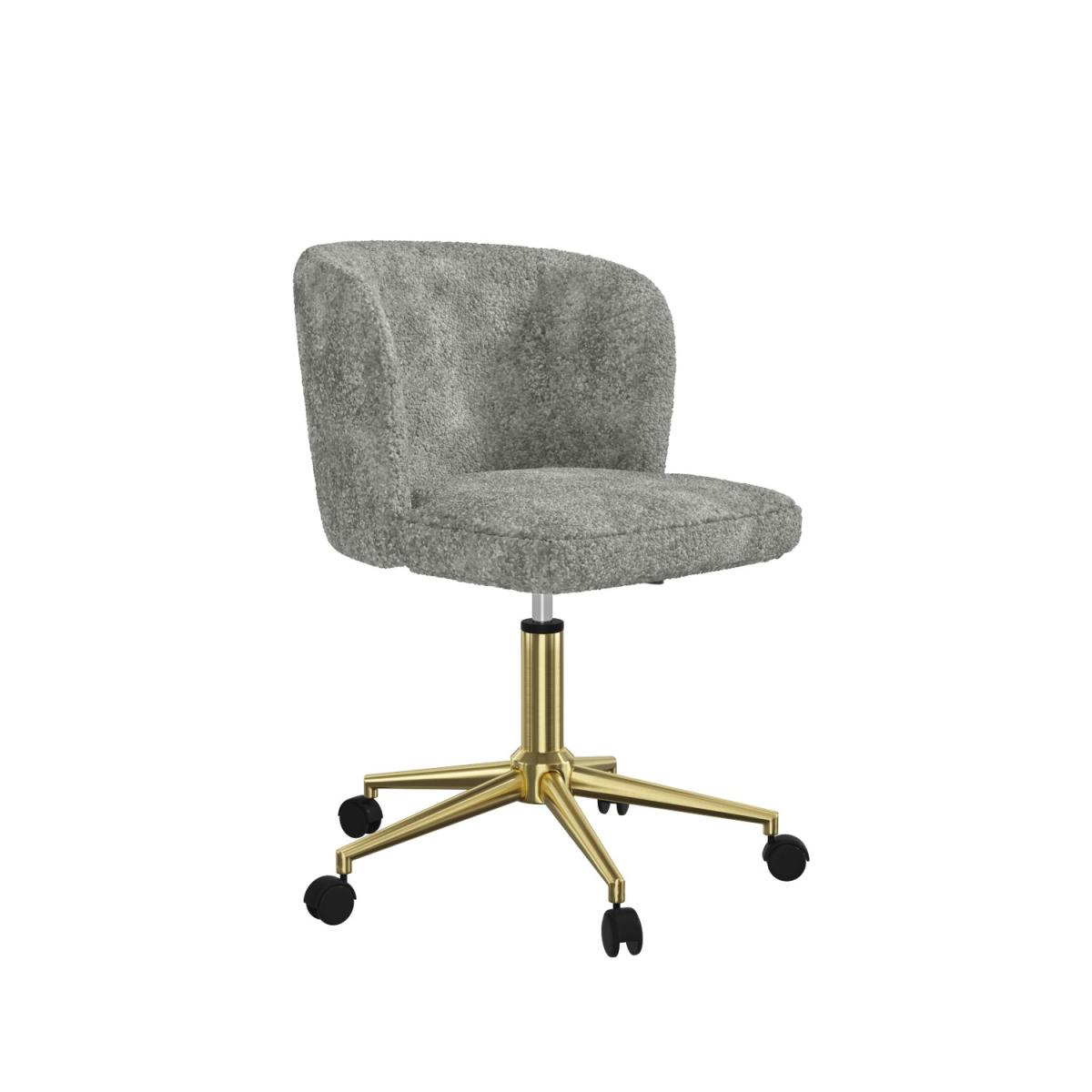 Soft grey Teddy office chair with gold base Upholstered a cream faux sheepskin fabric Choose the perfect height with the gas-lift mechanism Rounded back and sides offer support whilst you work Also available in a cream faux sheepskin This faux sheepskin Teddy office chair is the perfect addition to your workspace/study or dressing room. the shiny gold base will match with a range of modern interiors whilst the soft Teddy fabric brings warmth and texture to your space. Glide around your space on the easy roll castors whilst the curved backrest and soft upholstery supports you. With minimal assembly required, you will be set up and ready to work in no time. Need to know Weight: 7.2kg Max supported weight: 120kg Colour: Grey and gold Finish: Faux sheepskin Material: Faux sheepskin and steel Filling: Foam Assembly required: Yes- minimal