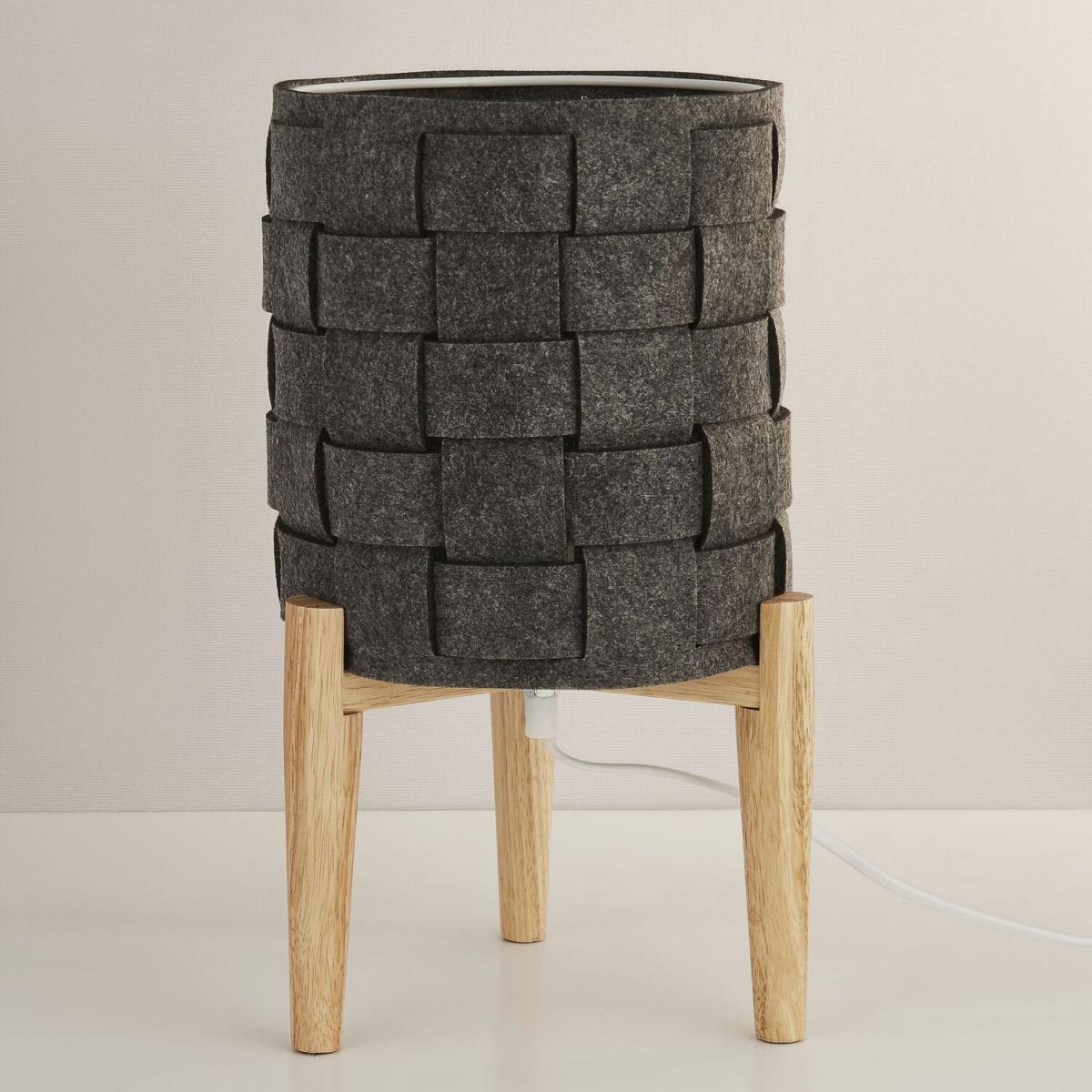 Embodying an intertwining design, this felt table lamp showcases a grey shade and natural legs, elegantly elevating the ambiance of any room while seamlessly complementing a diverse range of decor styles. Bulb not included. We recommend a 1 x E14 bulb.