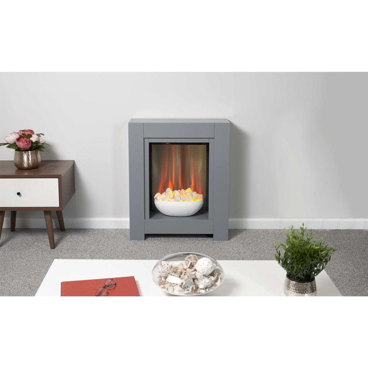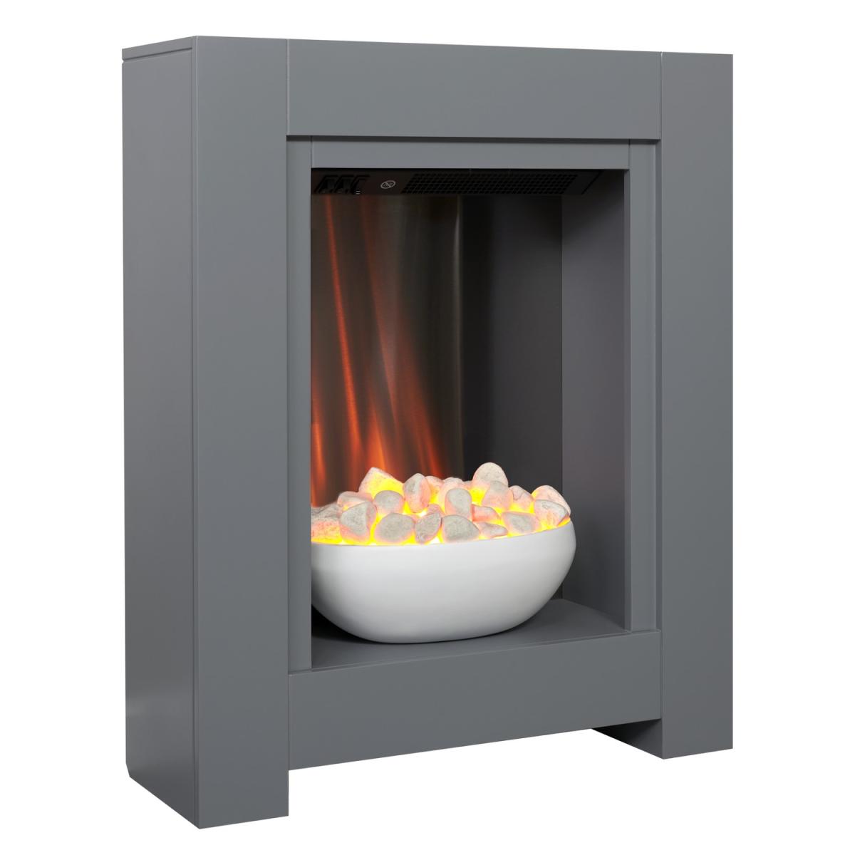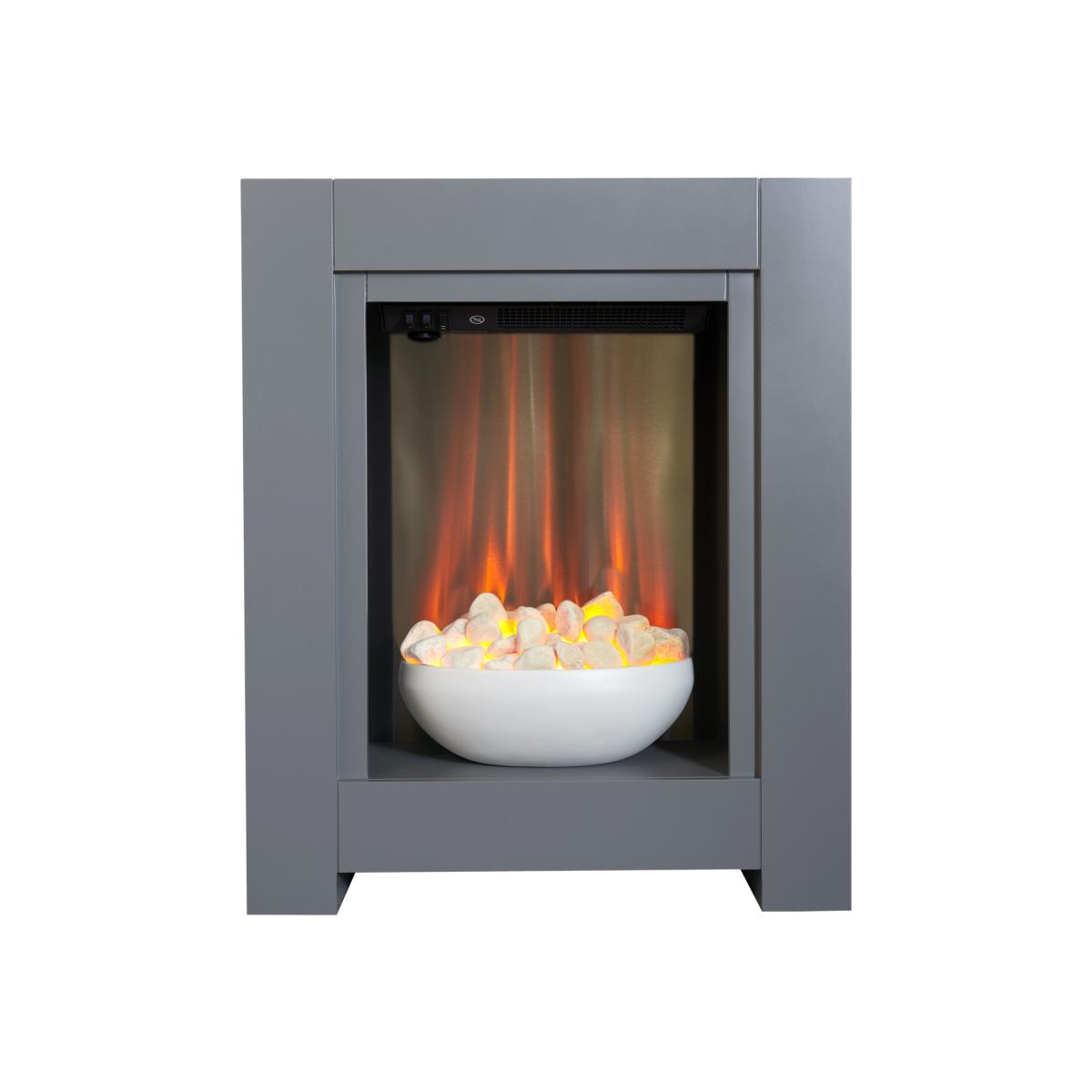 Dimensions H73cm x W60cm x D20cm. The Adam Monet Fireplace Suite is eye-catching and stylish; the insert holds an electric fire that simmers gently in a bowl of white pebbles. The fire has a minimalistic feel but brings warmth with the ambient glow effect. Features. Eye-catching and stylish design Bowl with real pebble fuel effect. Ambient LED glow effect with 1kW and; 2kW heat settings. Independent glow effect only setting1 year warranty Assembly not required..