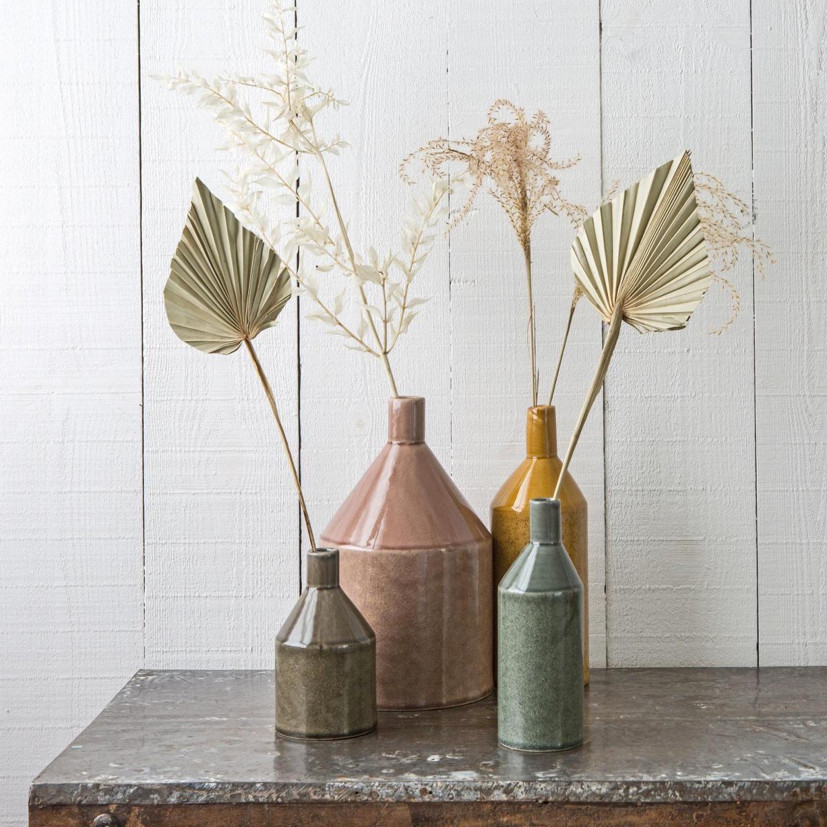 A collection of stoneware vases with a crackle glaze finish and a subtle speckled base. Featuring a narrow neck atop an angular body, these vases look great displayed on their own as well as in a group. Grey (MGW1047): H15 x Diameter 9cm. Green (MGW1045): H20 x Diameter 7cm. Ochre (MGW1043): H26 x Diameter 9cm. Mauve (MGW1046): H29 x Diameter 16cm. Made of stoneware. Crackle glaze finish. Sold individually.