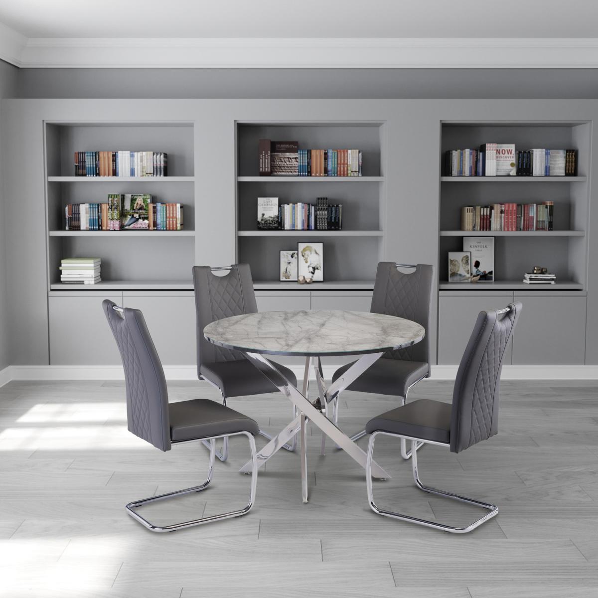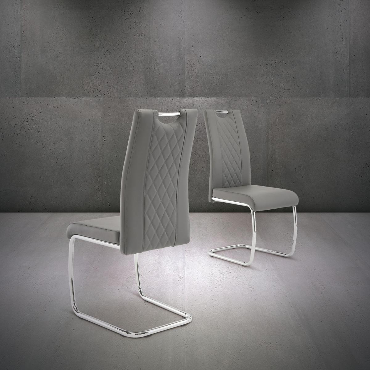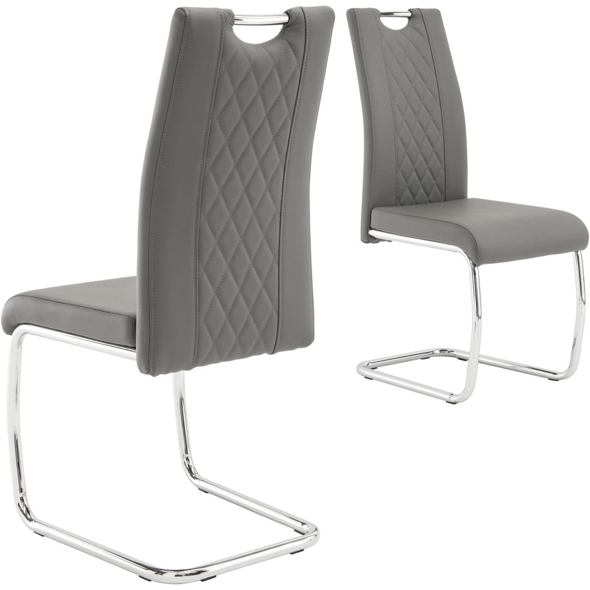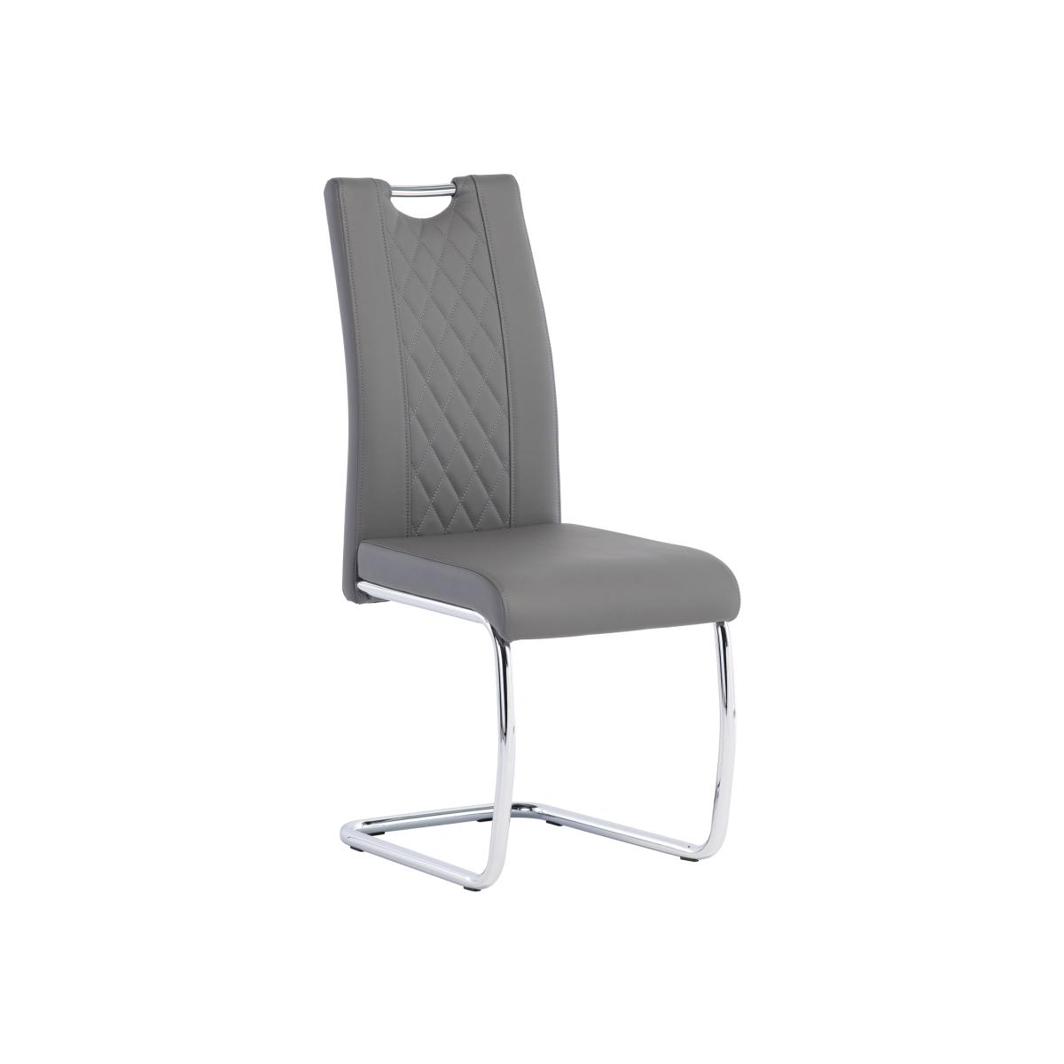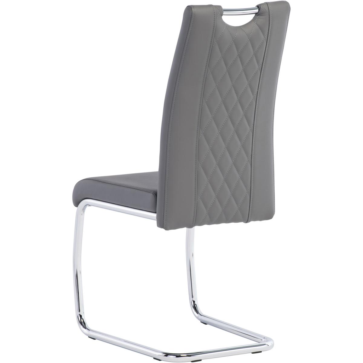 A beautifully crafted dining chair in grey PU with cross-stitched pattern centre inlay and contemporary chrome hand design for easy moving. They are delivered flat packed with required assembly.