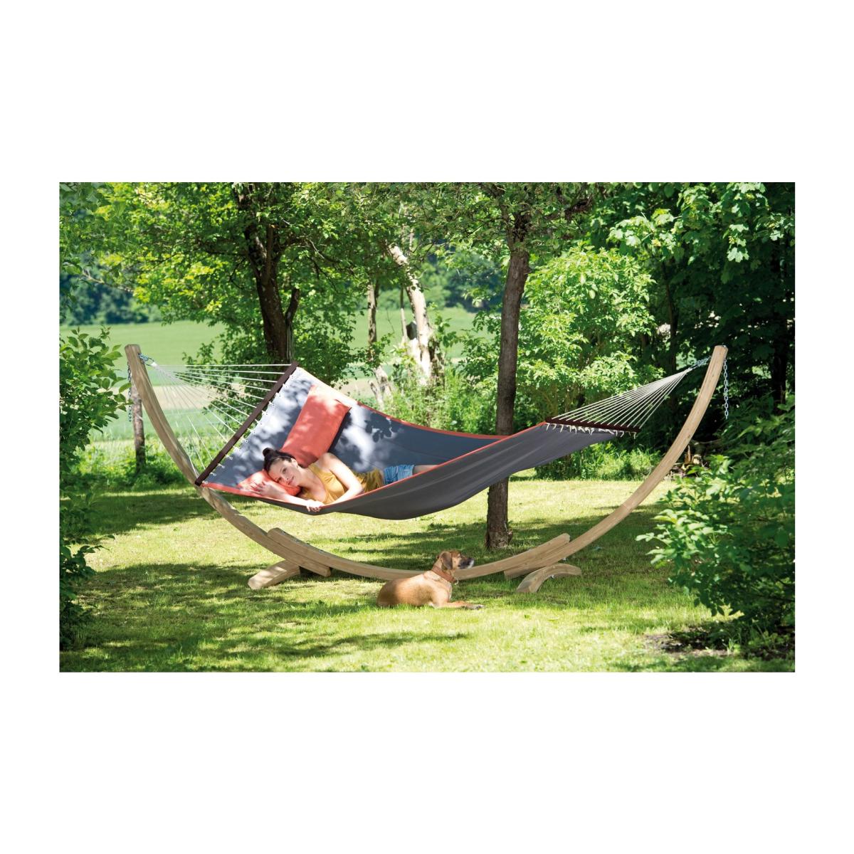 This Grey hammock with wooden stand is perfect for lounging around the garden. The trendy large grey hammock is softly padded for comfort. The stand is made from spruce wood which is sustainably sourced. The stand is also weatherproof.