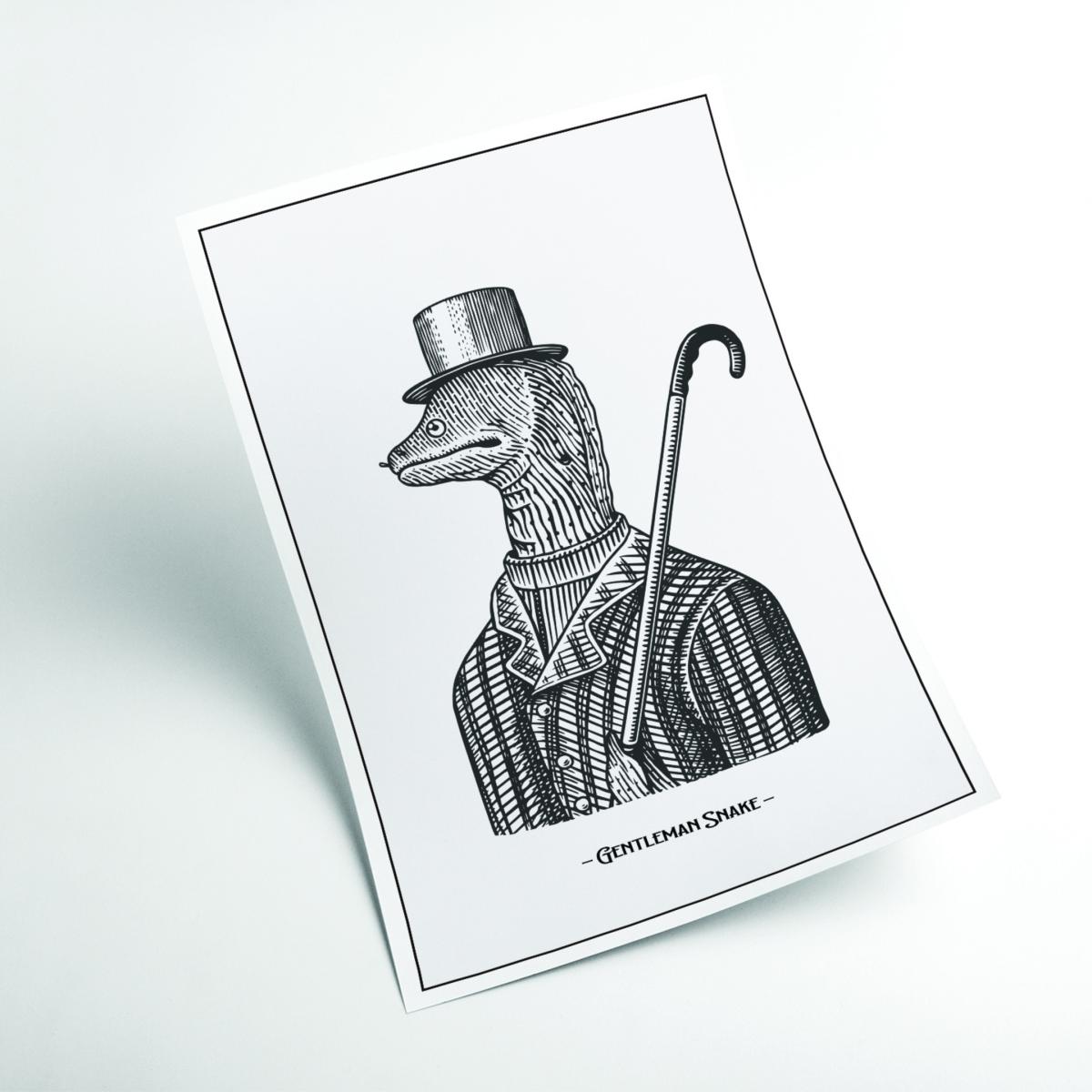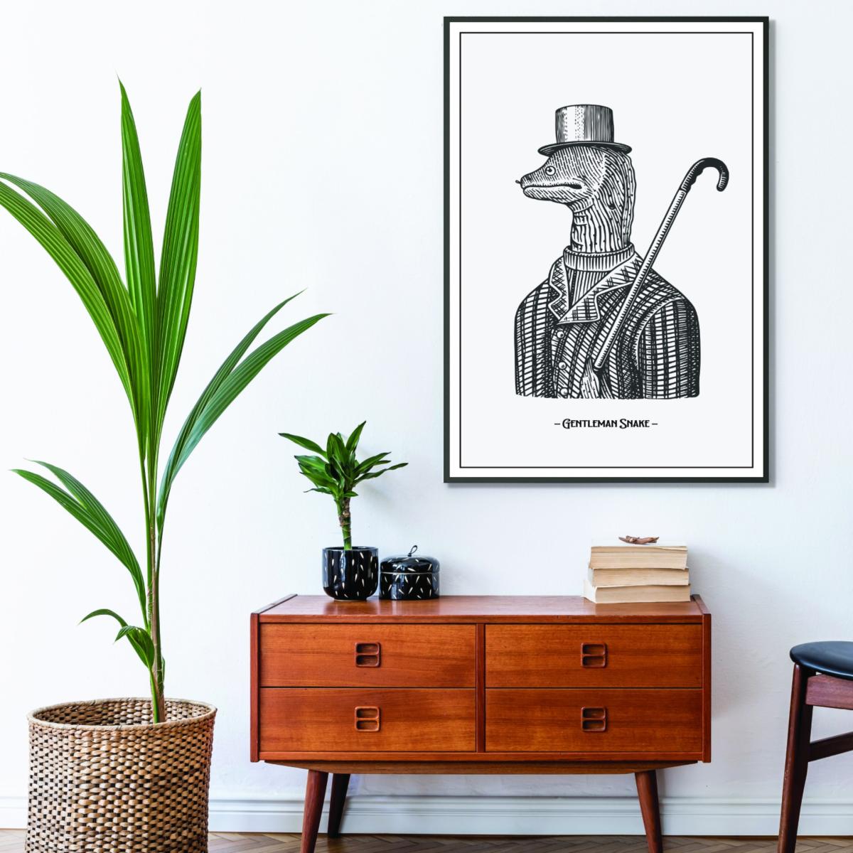 I love this print for its quirky, sophisticated vibe. The Grey Gentlemen Snake Illustration works particularly well in eclectic or modern interiors, adding a touch of wit and style without overpowering the space. It’s great for feature walls in living rooms, home offices, or even hallways, especially when paired with neutral or monochrome palettes. Practical styling tips include framing it with a sleek, contemporary mount or placing it alongside minimalistic decor to let the artwork stand out. This piece also lends itself well to pairing with other minimalist artwork or decorative objects in metal or wood for a balanced, curated look.
