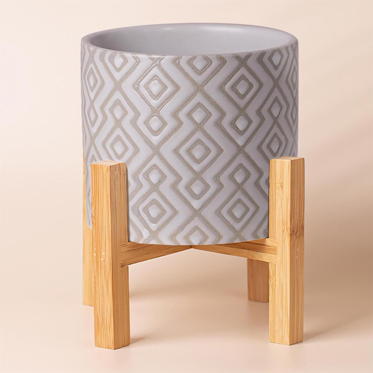 Grey Geometric Planter Plant Pot with Bamboo Stand - Grey