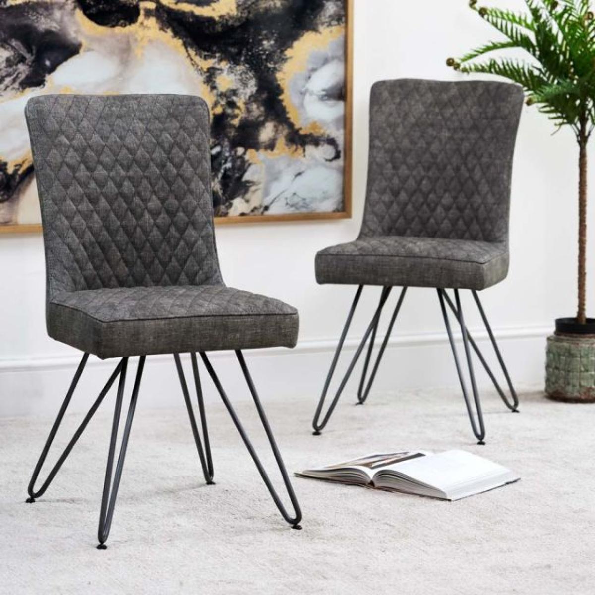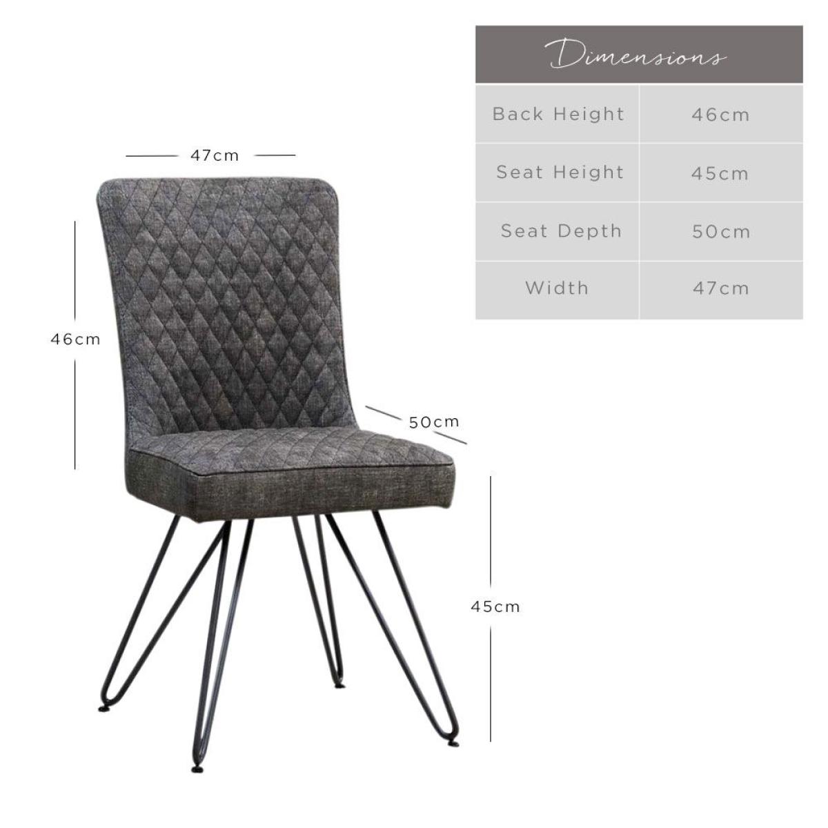 Achieve the industrial look for your home dining experience, with grey industrial dining chairs… Take a seat on the Industrial dining chair, upholstered in a dark grey fabric and featuring a diamond stitched pattern for added style. Complete with angled metal legs these industrial style dining chairs fit in to the Industrial Dining Collection with ease. Add this pair of industrial dining chairs to your collection today.