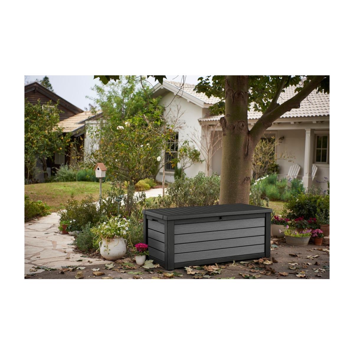 Storage Box Dimensions H64.40cm x W155cm x D72.40cm. The perfect combination of size and design. The brushed texture gives the look and feel of wood whilst maintaining the qualities and durability of resin. Multi-functional it can be used for storage and extra seating suitable for 2 people in the garden. Features. Pistons for easy opening. Water Resistant and Lockable (lock not included)UV stabilised570 L of storage capacity. Flat packed for conveince but easy to assemble. Assembly required..