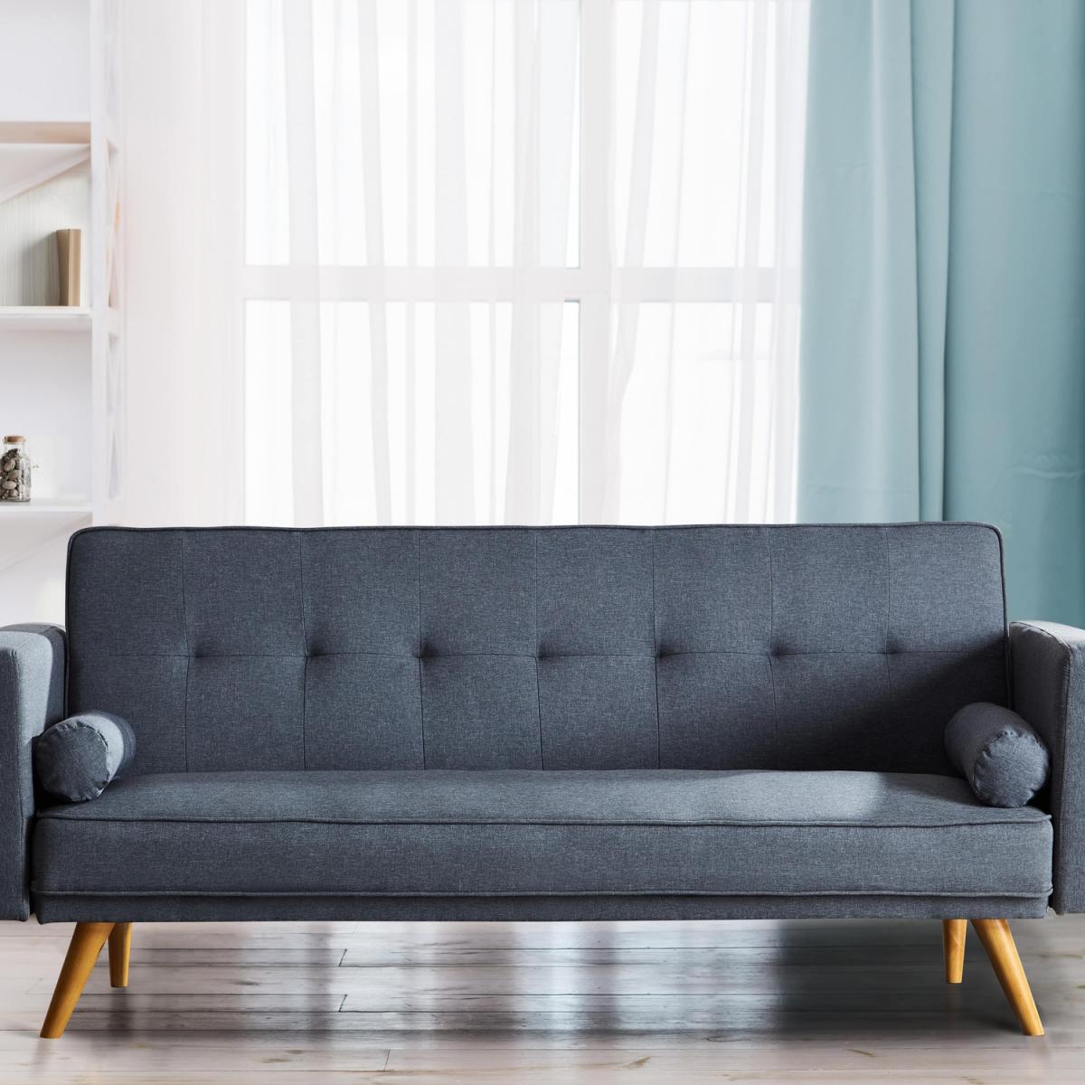 This Fabric Sofa Bed is the right choice if you are looking for modern style, practicality and aesthetic appeal all in one sofa bed. This elegant piece of furniture will look great in any room, which makes this a great addition for any home. The sofa has a high back and foam sprung seat cushions for ultimate comfort and is upholstered in lovely linen fabric and is finished off with a buttoned back rest. Also included are tubular pillows and solid wooden legs. This 3 seater sofa bed can be turned into a bed in seconds using it's clic clac mechanism ensuring both an easy and wonderful night's rest for you or your favourite house guests. Minimal assembly required - just screw on the legs.