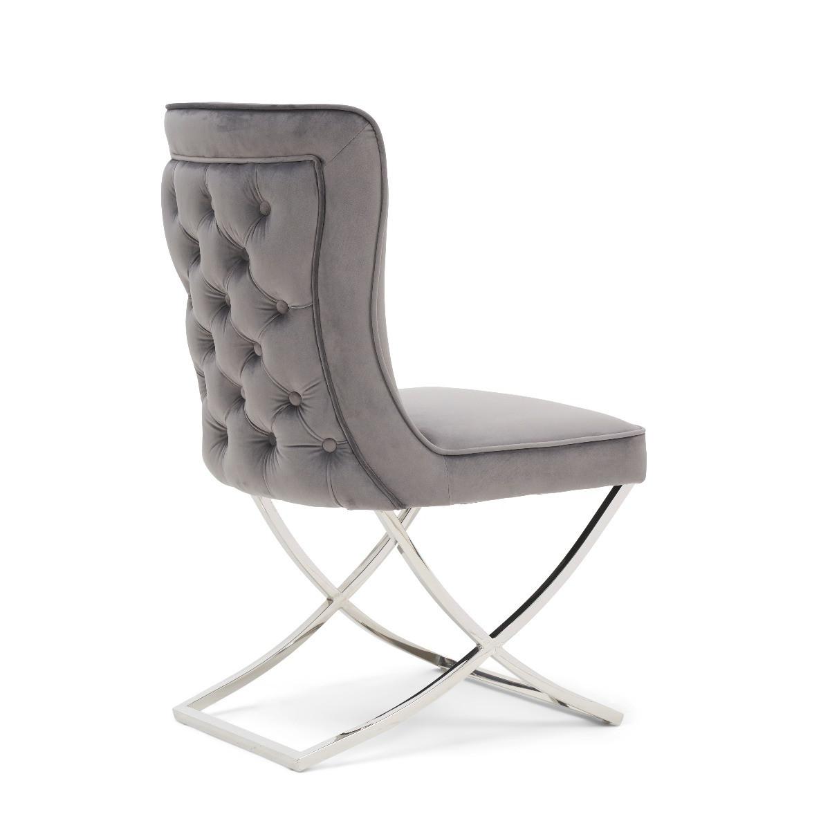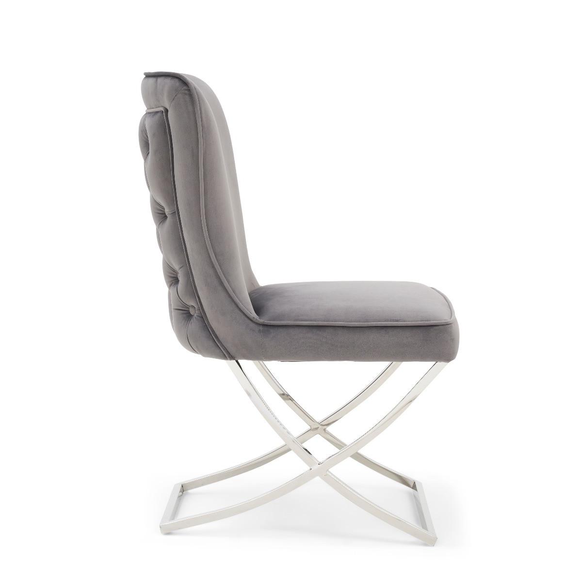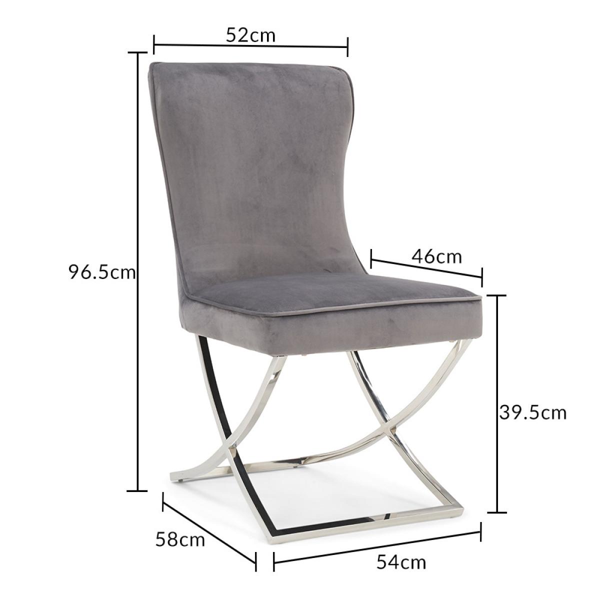 I often reach for the Lorenzo chairs for their neat, slimline silhouette and soft grey velvet upholstery - the chrome sled base keeps them feeling light under the table. They work equally well in contemporary dining rooms, a pared-back home office or even as occasional seating in a hallway. To style, pair them with a glass or marble-topped table to emphasise that airy frame, then layer in texture with a jute rug or linen cushions. For contrast, add a couple of brass or black accessories nearby - it highlights the chrome legs without overwhelming the calm colourway.