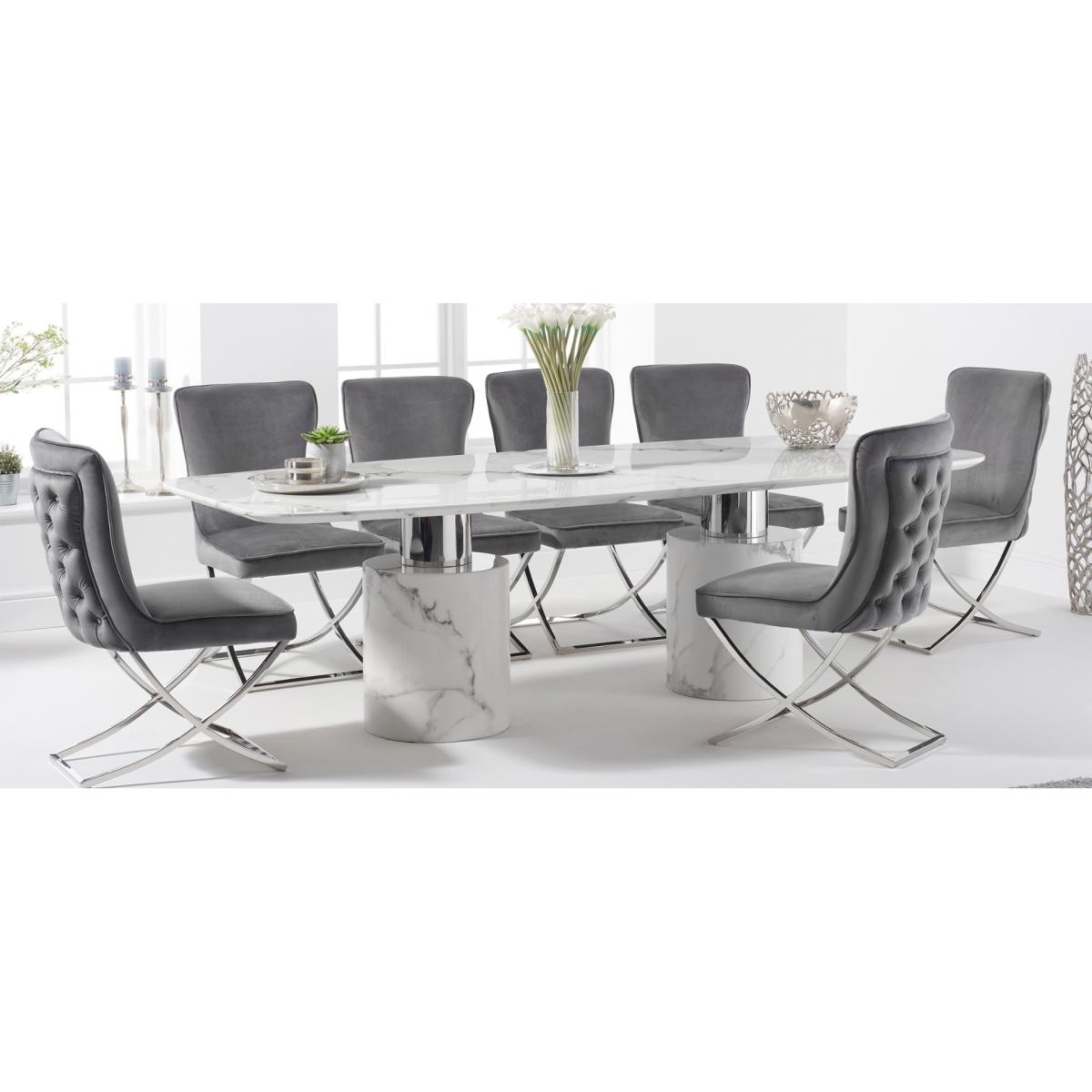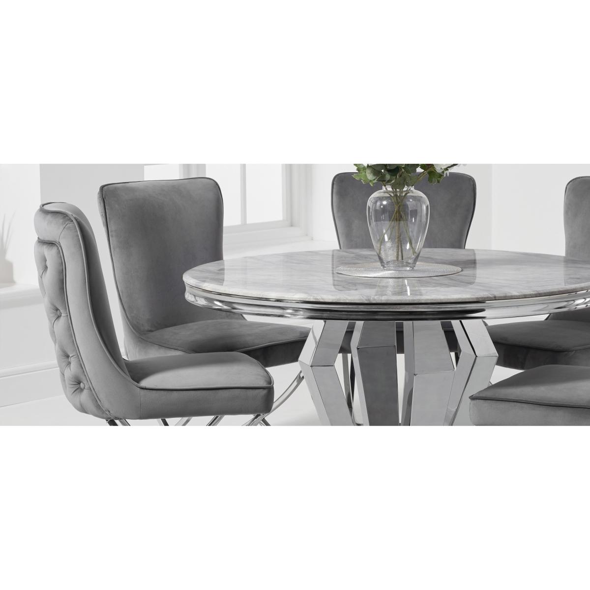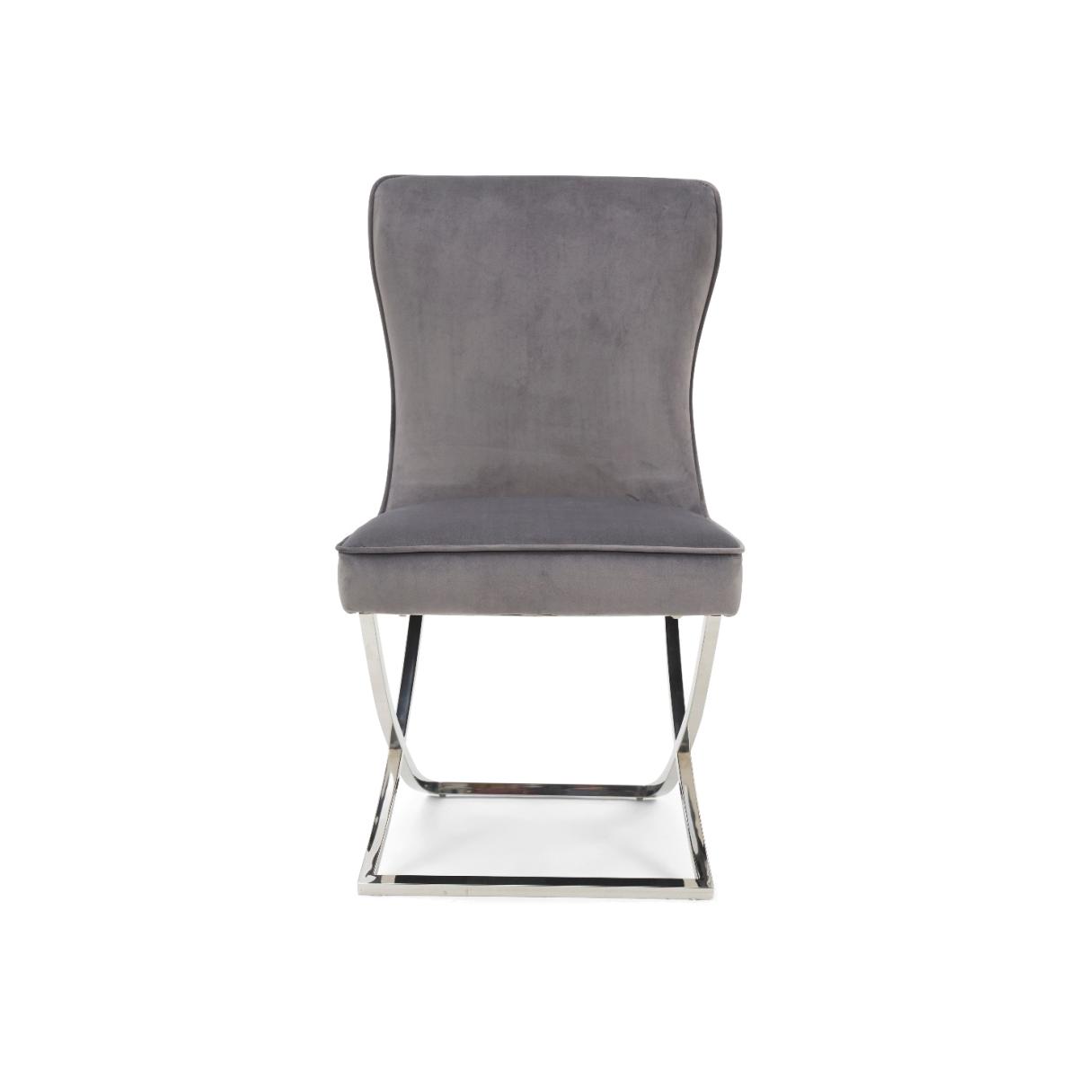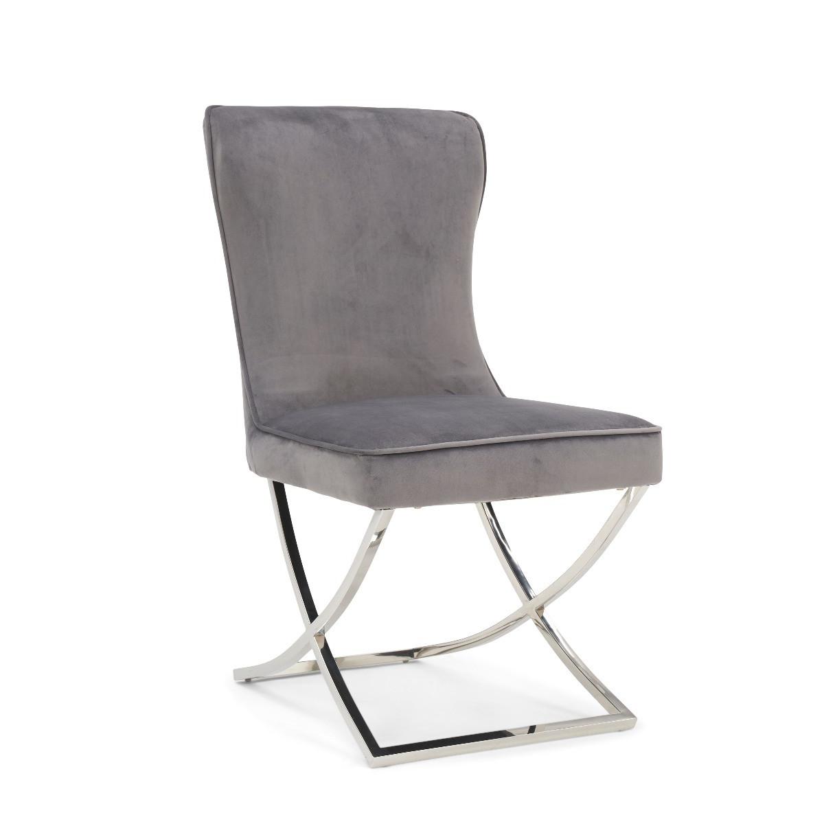 I often reach for the Lorenzo chairs for their neat, slimline silhouette and soft grey velvet upholstery - the chrome sled base keeps them feeling light under the table. They work equally well in contemporary dining rooms, a pared-back home office or even as occasional seating in a hallway. To style, pair them with a glass or marble-topped table to emphasise that airy frame, then layer in texture with a jute rug or linen cushions. For contrast, add a couple of brass or black accessories nearby - it highlights the chrome legs without overwhelming the calm colourway.