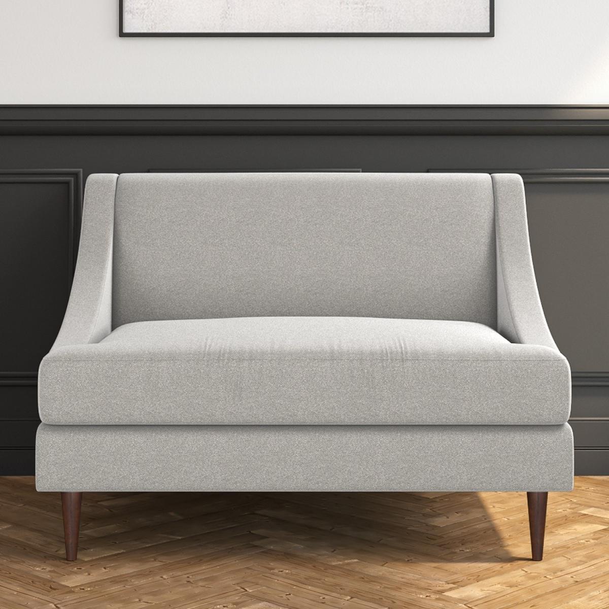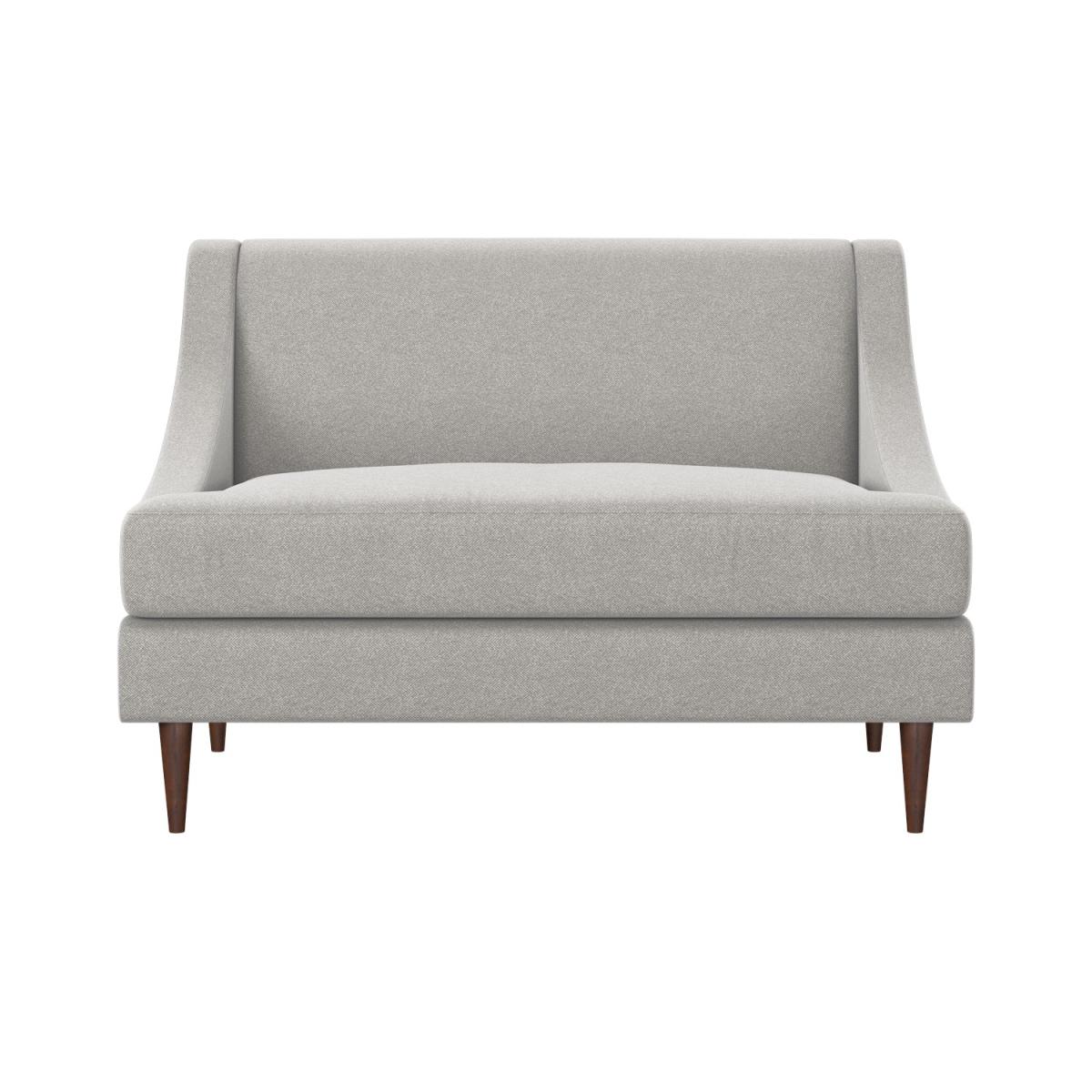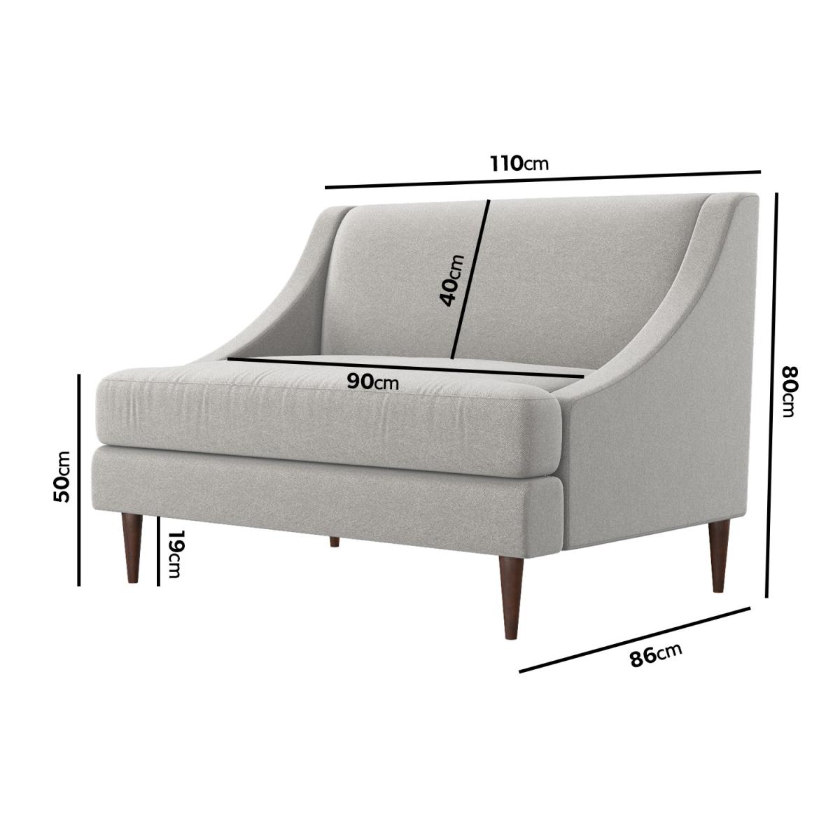 Features we love Mid-century design grey fabric loveseat Relax in style with curved arm features. Upholstered in neutral grey chevron print fabric Foam filled cushions add comfort and support. Minimal assembly just attach the dark wood legs. All about me. The Maia woven fabric loveseat is the perfect addition to any living space. The minimal chevron design is beautifully simplistic and will complement any modern decor. With enough room for 2 people there is plenty of space to entertain your guest or have a cosy family night in. With foam filled back and seat cushions this sofa offers the perfect place to recline and relax on an evening. Need to know. Overall dimensions. H80 x W110 x D86 cm Seating dimensions. W90 x D57 cm Packed dimensions. No. of Boxes 1 - Weight 34kg – H72 x W112 x D88 cm Colour. Silver grey Finish. Woven fabric and wooden legs Material. 100% polyester Filling. Foam Assembly required. Yes